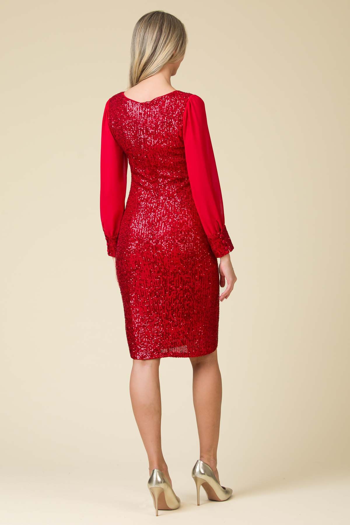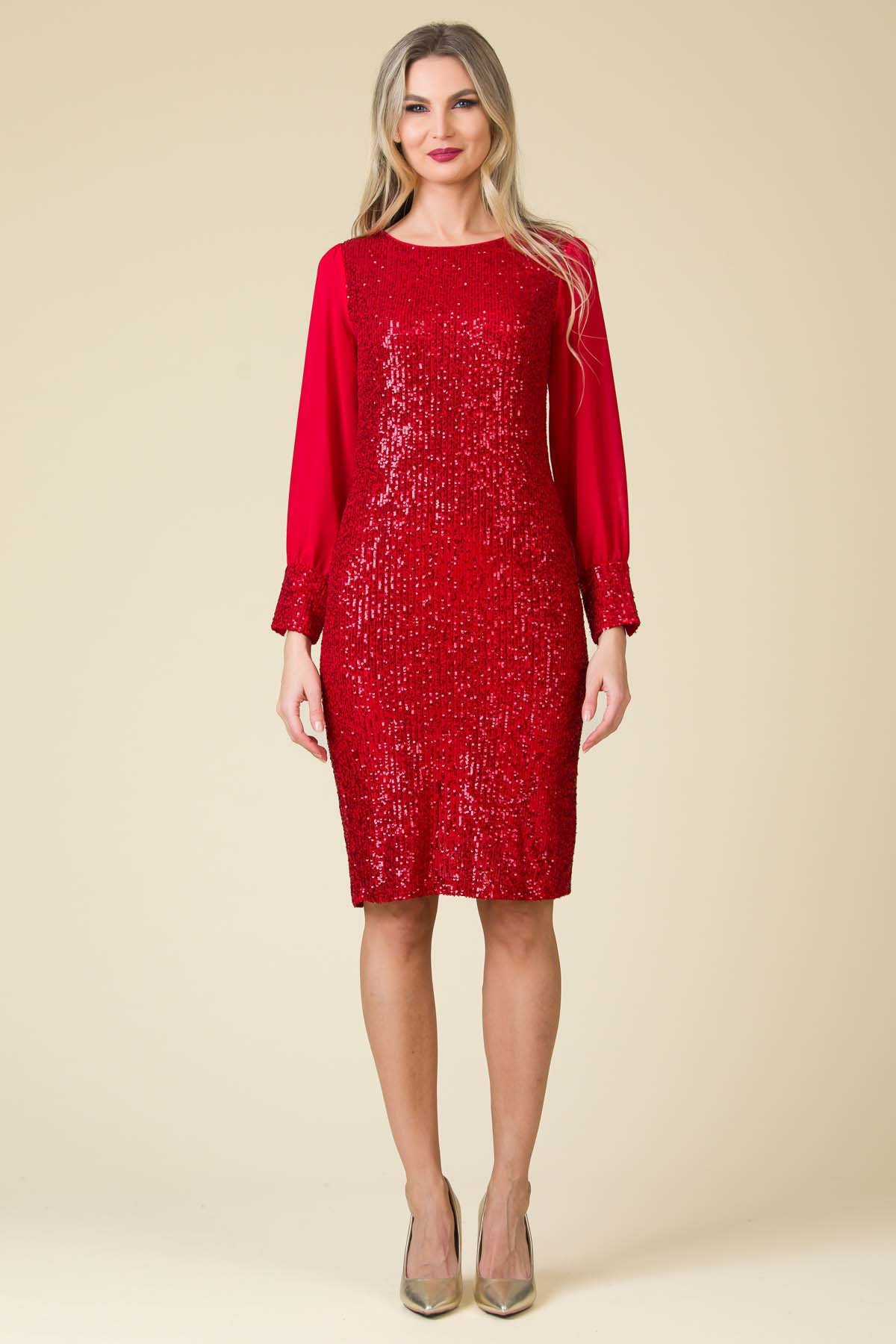 Rochie de ocazie Precious, din tesatura pretioasa cu paiete, croi feminin cu maneci din voal si mansete contrast cu nasturi delicati. Tesatura necesita spalare cat mai delicata, recomandam spalare manuala, fara storcere.