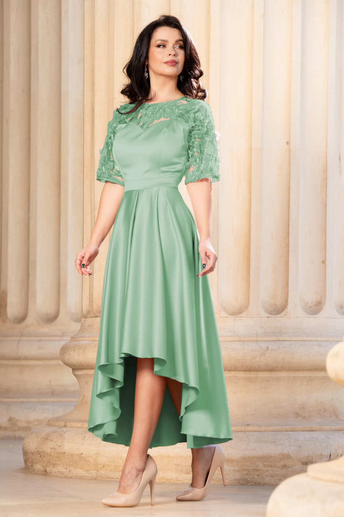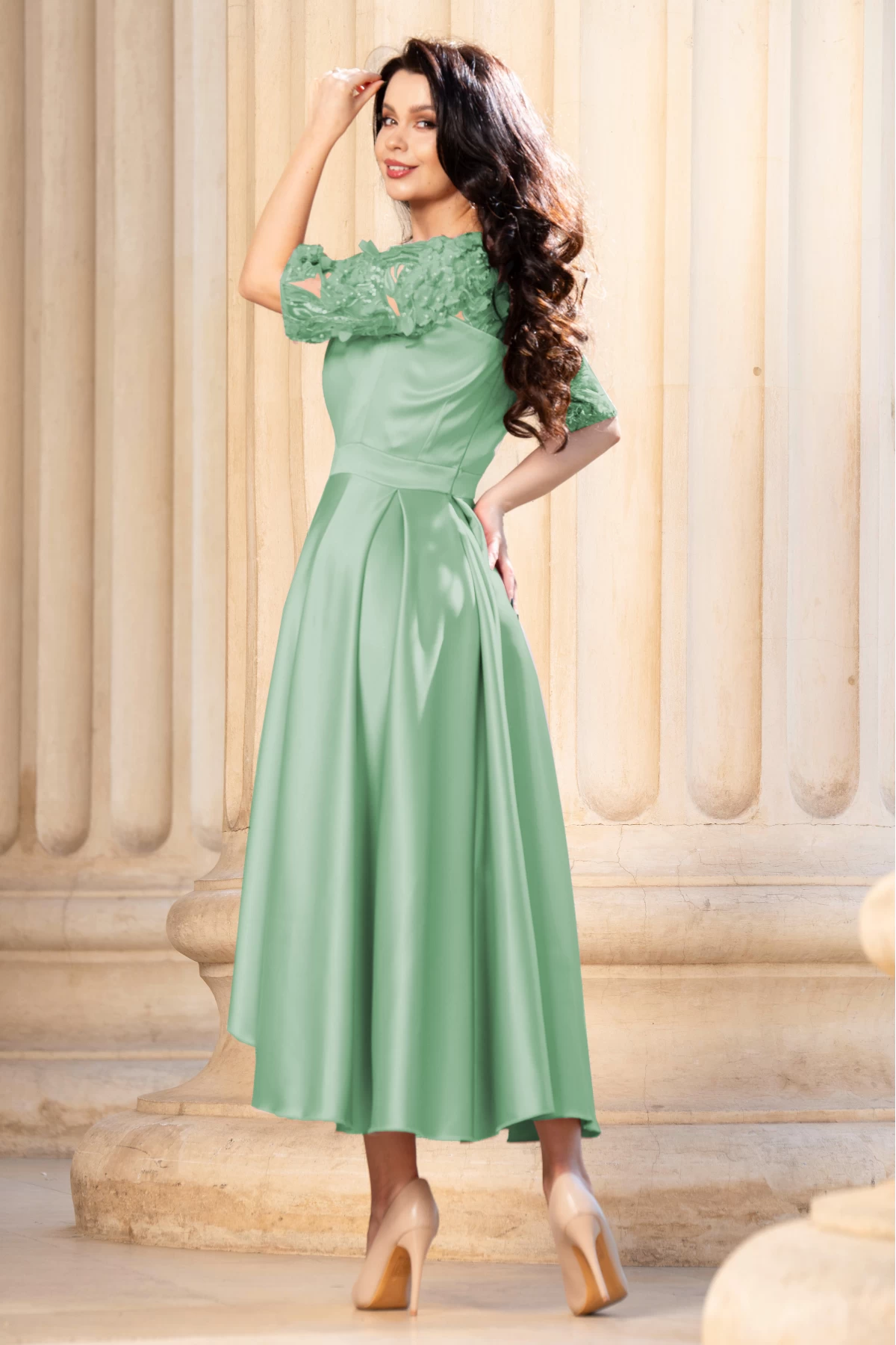 Rochie de ocazie salvie cu flori 3D si pliseuri ; Culoare: salvie ; Croi: clos ; Lungime asimetrica ; Decolteu rotund ; Pliuri din zona taliei ; Maneci scurte ; Broderie cu flori 3D in partea de sus ; Inchidere cu fermoar la spate ; Compozitie: 90% poliester 10% elastan ; Fabricat in Romania ; * Echipa noastra face toate eforturile in a prezenta cat mai bine culorile produselor prezentate pe site insa culorile pot diferi de situatia reala si pot varia în functie de setarile monitorului/dispozitivului dvs!