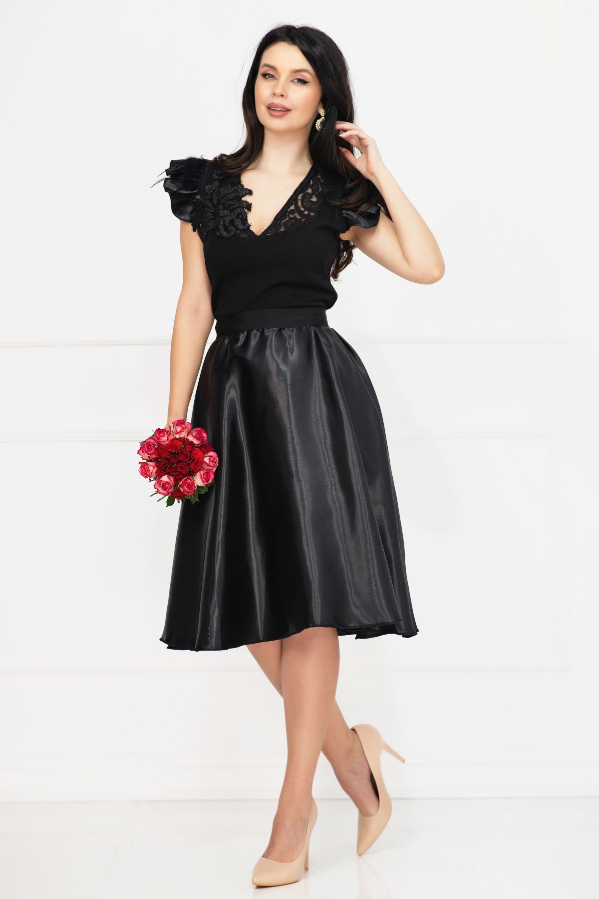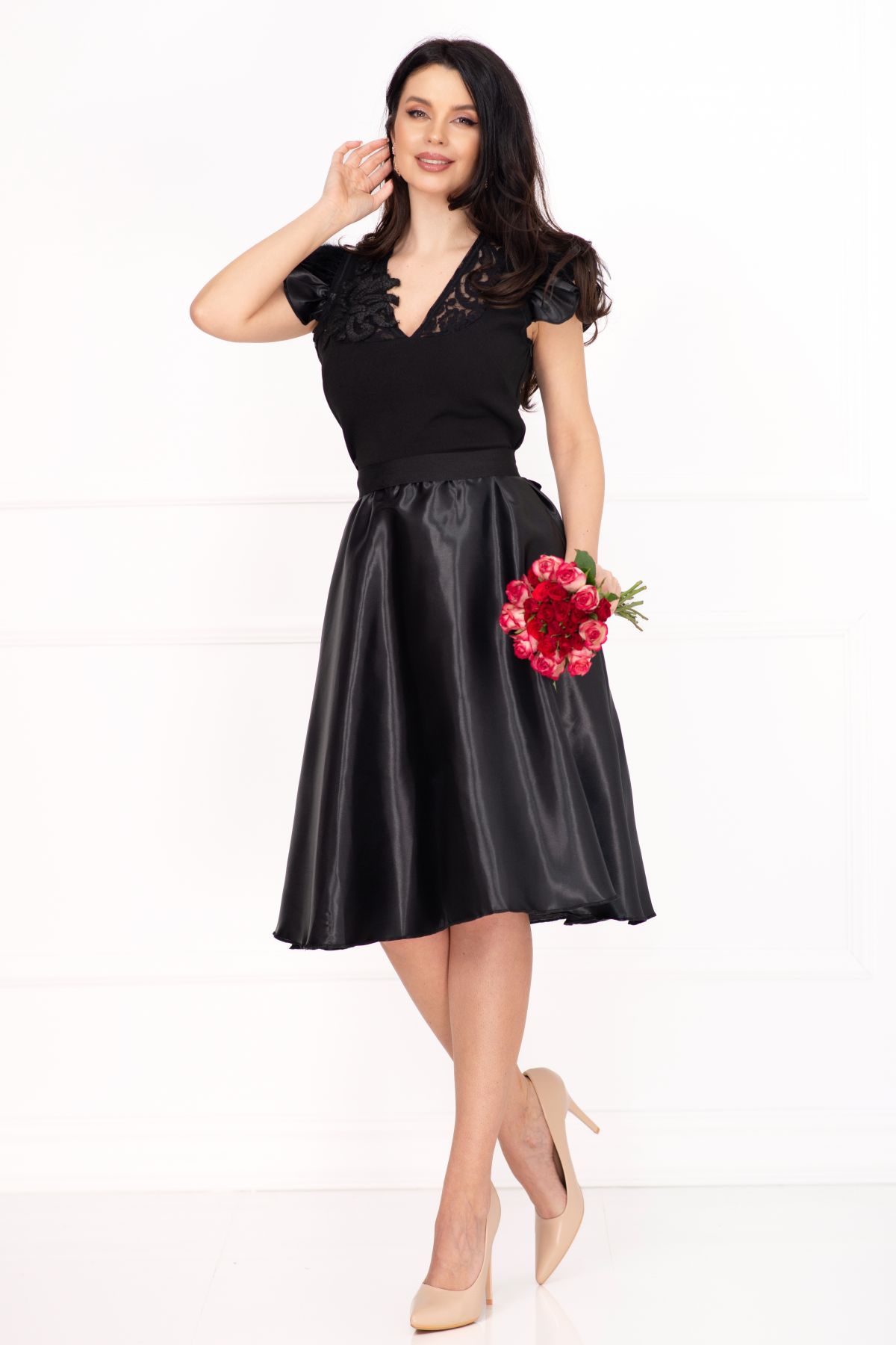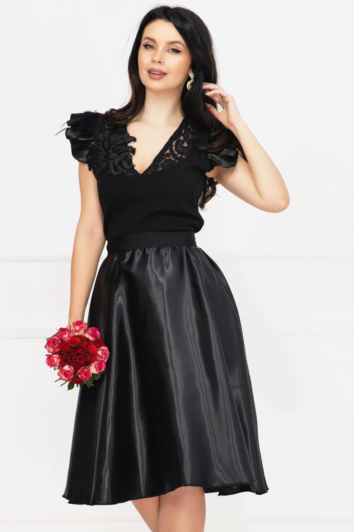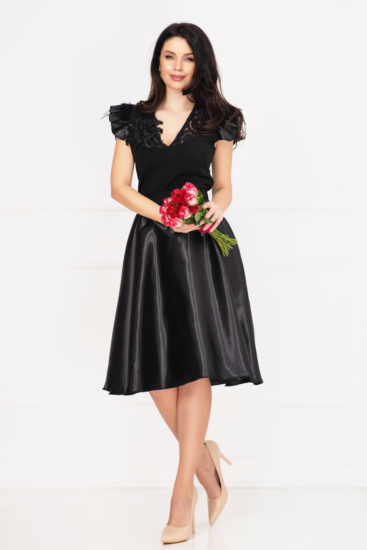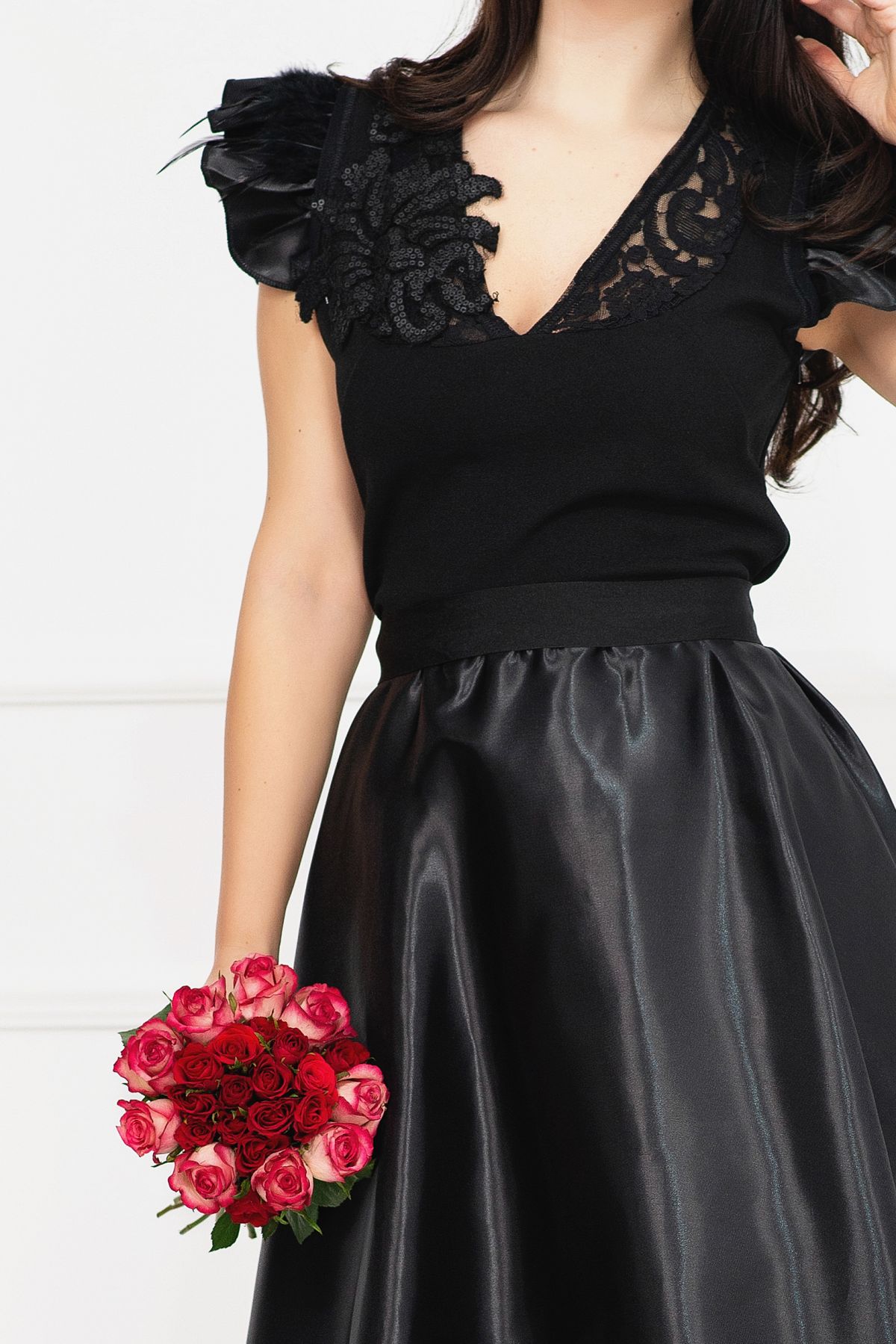 Rochie de ocazie Venezia neagra in clos cu fulgi si broderie ; Culoare: negru ; Croi: clos ; Lungime: midi ; Textura: satin bistrech ; Fusta din satin ; Fara maneci ; Decolteu in V ; Dvolanase satinate la umeri decorate cu fulgi naturali ; Inchidere cu fermoar lateral ; Prezinta cordon detasabil ; Insertie brodata cu paiete discrete in partea de sus ; Compozitie:80% poliester 17% vascoza 3% elastan ; Fabricat in Romania ; * Echipa InPuff face toate eforturile in a prezenta cat mai bine culorile produselor prezentate pe site insa culorile pot diferi de situatia reala si pot varia în functie de setarile monitorului/dispozitivului dvs!