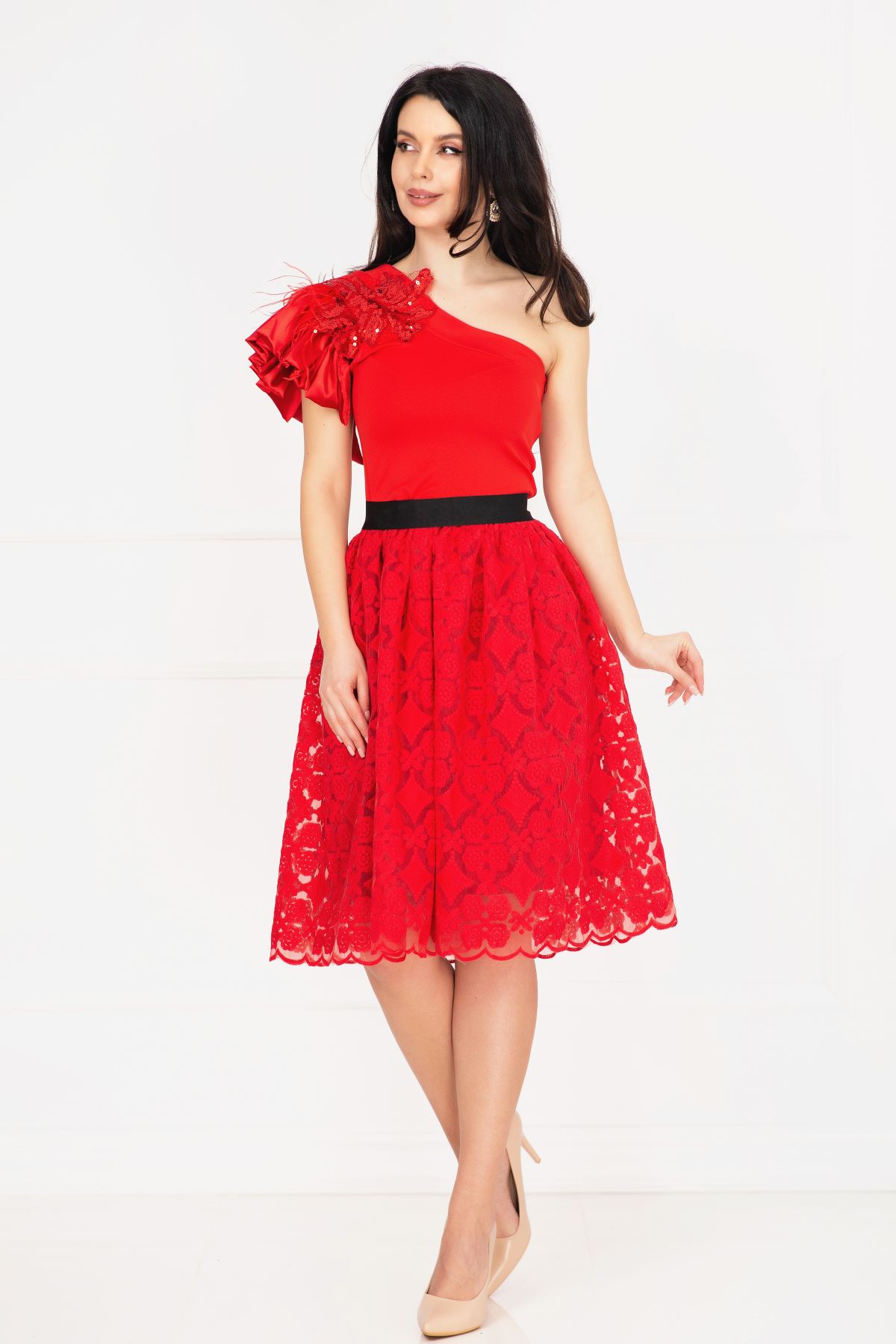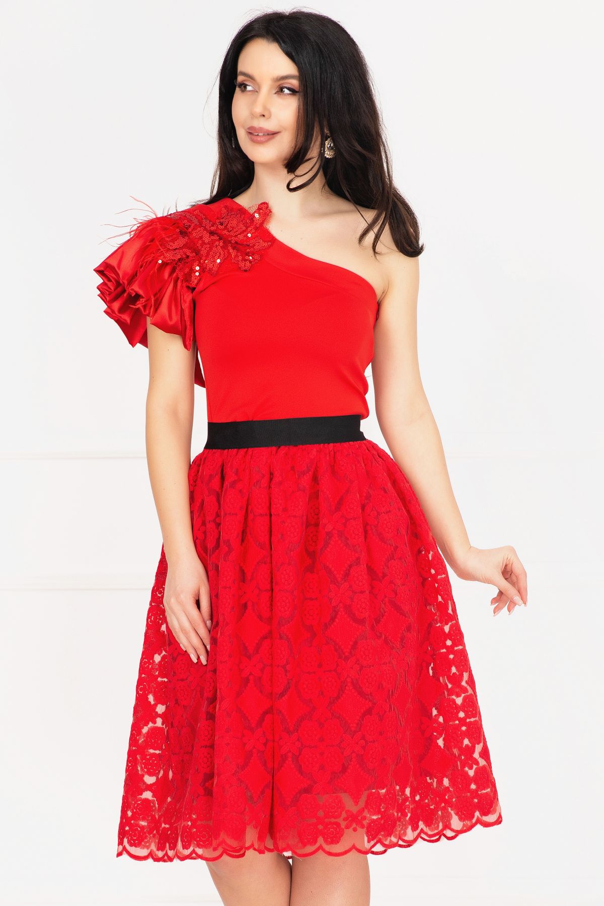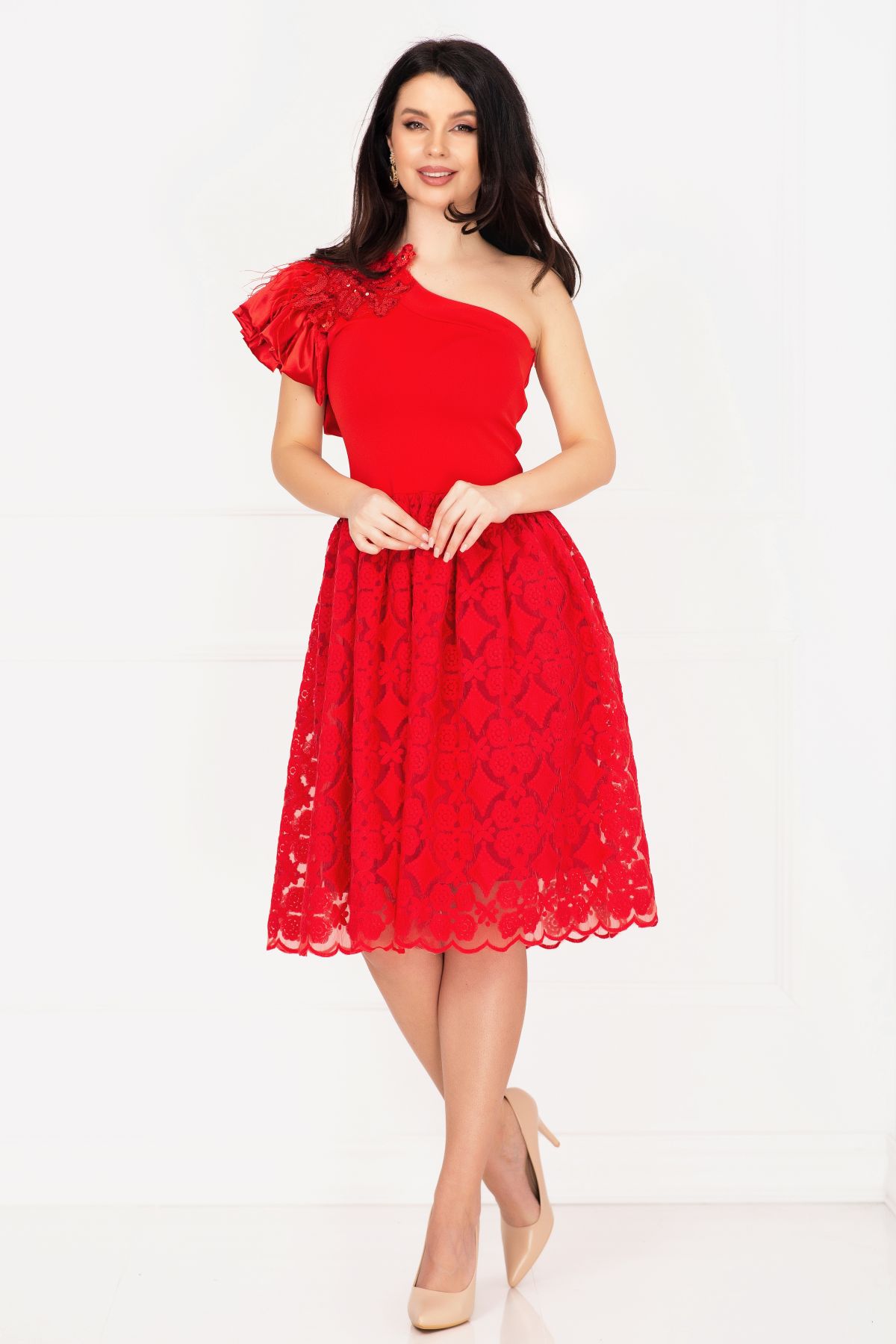 Rochie de ocazie Venezia rosie in clos cu fulgi si broderie ; Culoare: rosu ; Croi: clos ; Lungime: midi ; Textura: bistrech broderie ; Fusta brodata cu motive florale ; Fara maneci ; Decolteu asimetric ; Volan amplu la un umar decorat cu fulgi naturali ; Floare din tulle si paiete aplicata pe umar ; Inchidere cu fermoar lateral ; Prezinta cordon detasabil ; Prezinta dublura ; Compozitie:80% poliester 17% vascoza 3% elastan ; Fabricat in Romania ; * Echipa InPuff face toate eforturile in a prezenta cat mai bine culorile produselor prezentate pe site insa culorile pot diferi de situatia reala si pot varia în functie de setarile monitorului/dispozitivului dvs!
