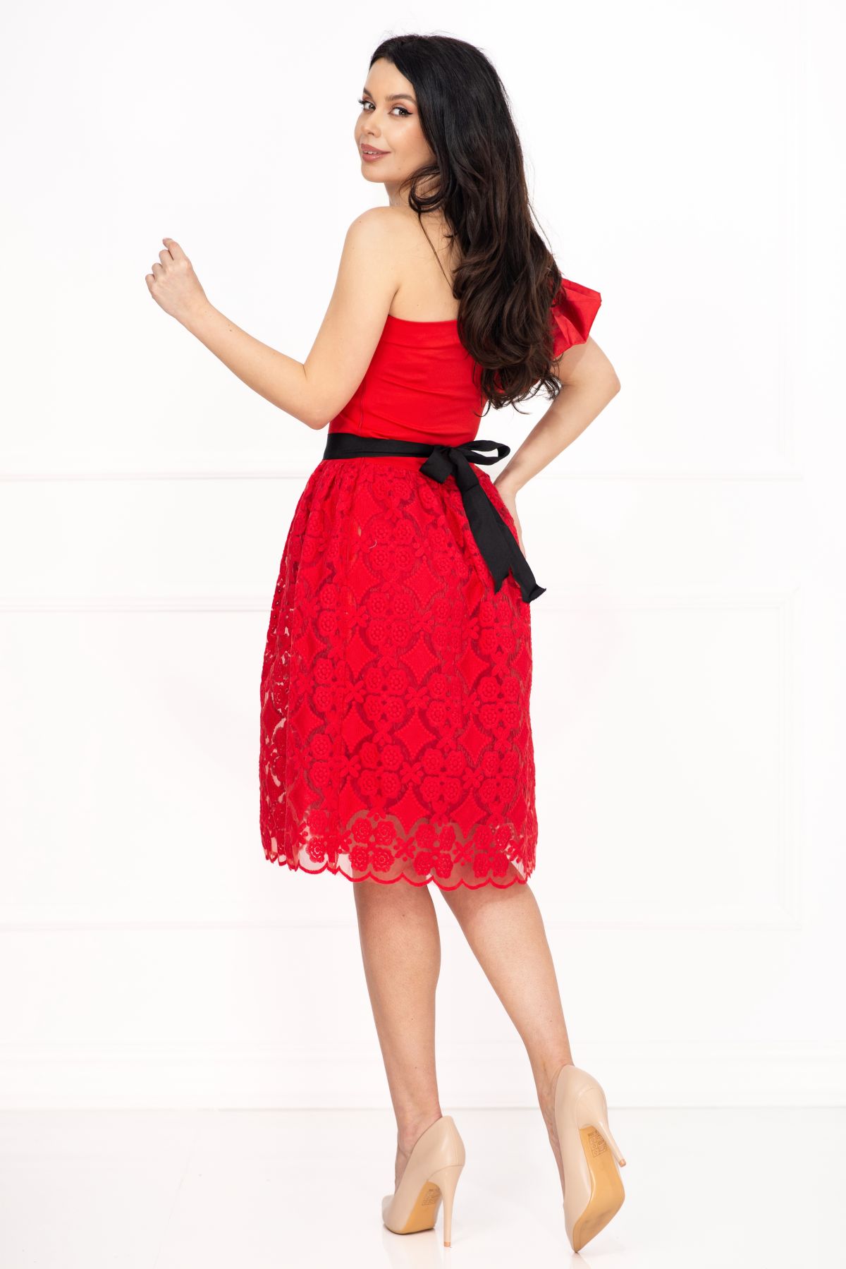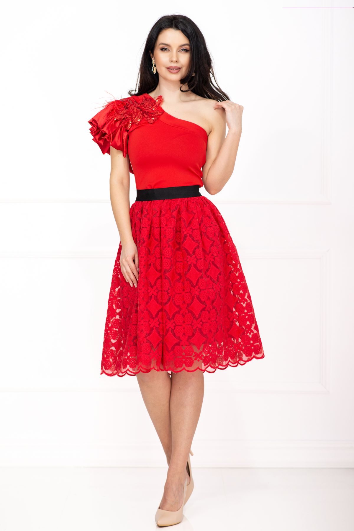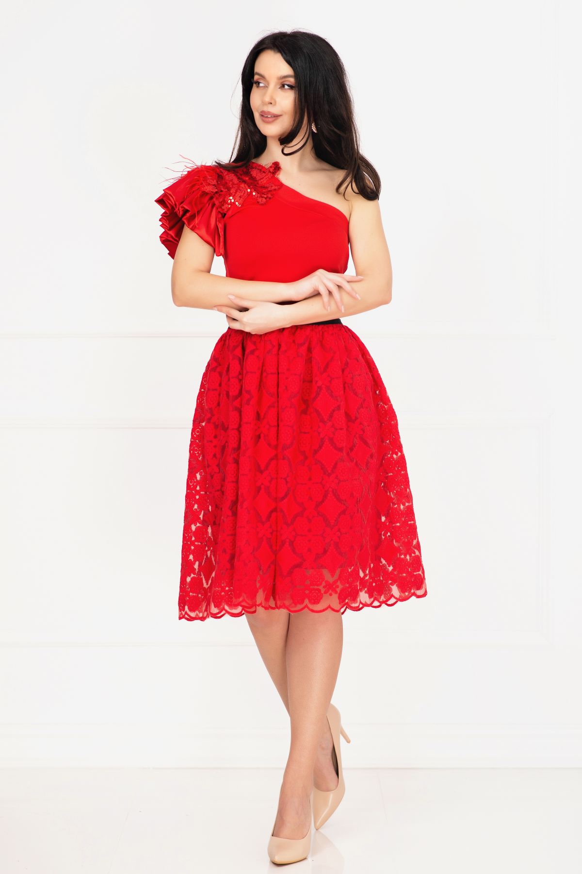 Rochie de ocazie Venezia rosie in clos cu fulgi si broderie ; Culoare: rosu ; Croi: clos ; Lungime: midi ; Textura: bistrech broderie ; Fusta brodata cu motive florale ; Fara maneci ; Decolteu asimetric ; Volan amplu la un umar decorat cu fulgi naturali ; Floare din tulle si paiete aplicata pe umar ; Inchidere cu fermoar lateral ; Prezinta cordon detasabil ; Prezinta dublura ; Compozitie:80% poliester 17% vascoza 3% elastan ; Fabricat in Romania ; * Echipa InPuff face toate eforturile in a prezenta cat mai bine culorile produselor prezentate pe site insa culorile pot diferi de situatia reala si pot varia în functie de setarile monitorului/dispozitivului dvs!