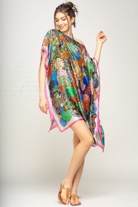 Rochie de plaja tip poncho din matase imprimat cu mandale multicolore cu roz si alb pe margine