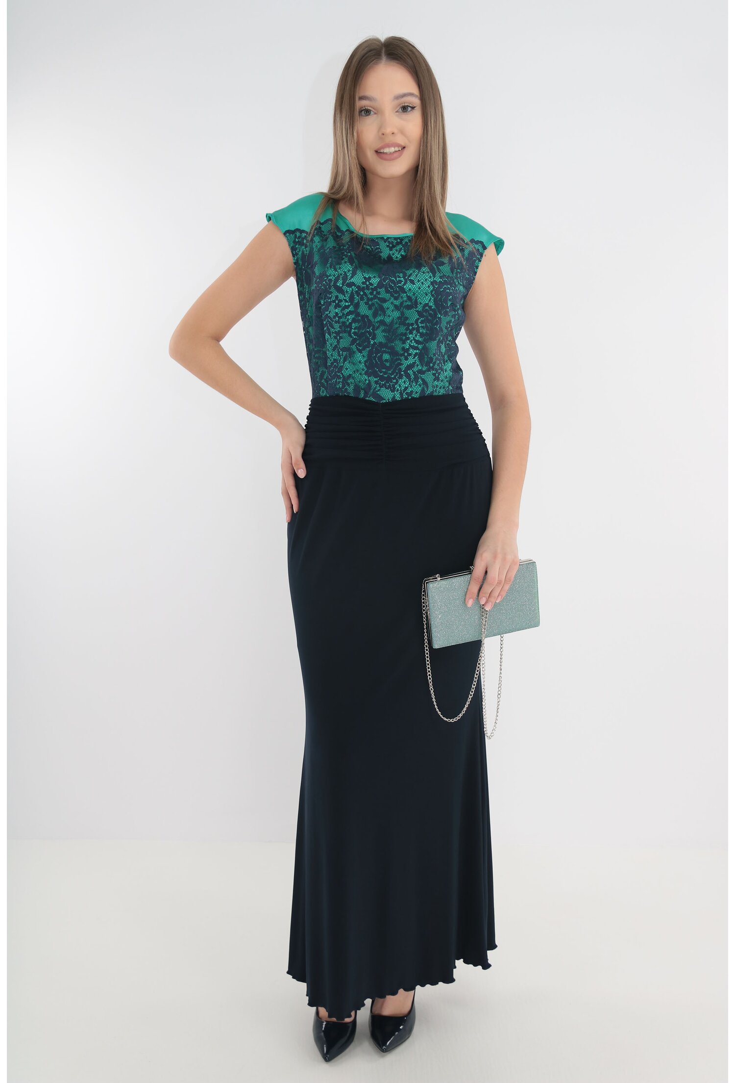 -Rochie de seara bleumarin cu dantela si saten vernil -Cu aplicatii din dantela bleumarin pe bust -Cordon incretit in zona soldurilor -Fusta lunga din material subtire elastic, captusita -Inchidere cu fermoar ascuns la spate -Fabricat in Romania MATERIAL: 65% Poliester, 32% Vascoza, 3% Elastan LUNGIME: 156 cm la marimea 40, lungimea rochiei creste cu 1 cm la fiecare marime