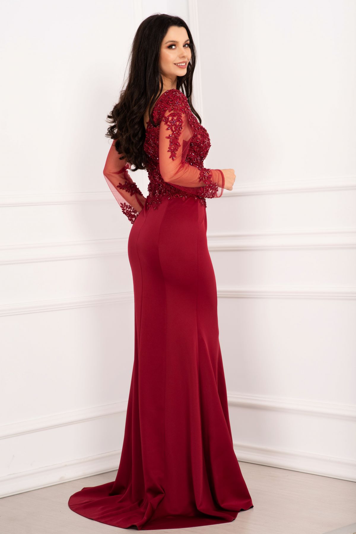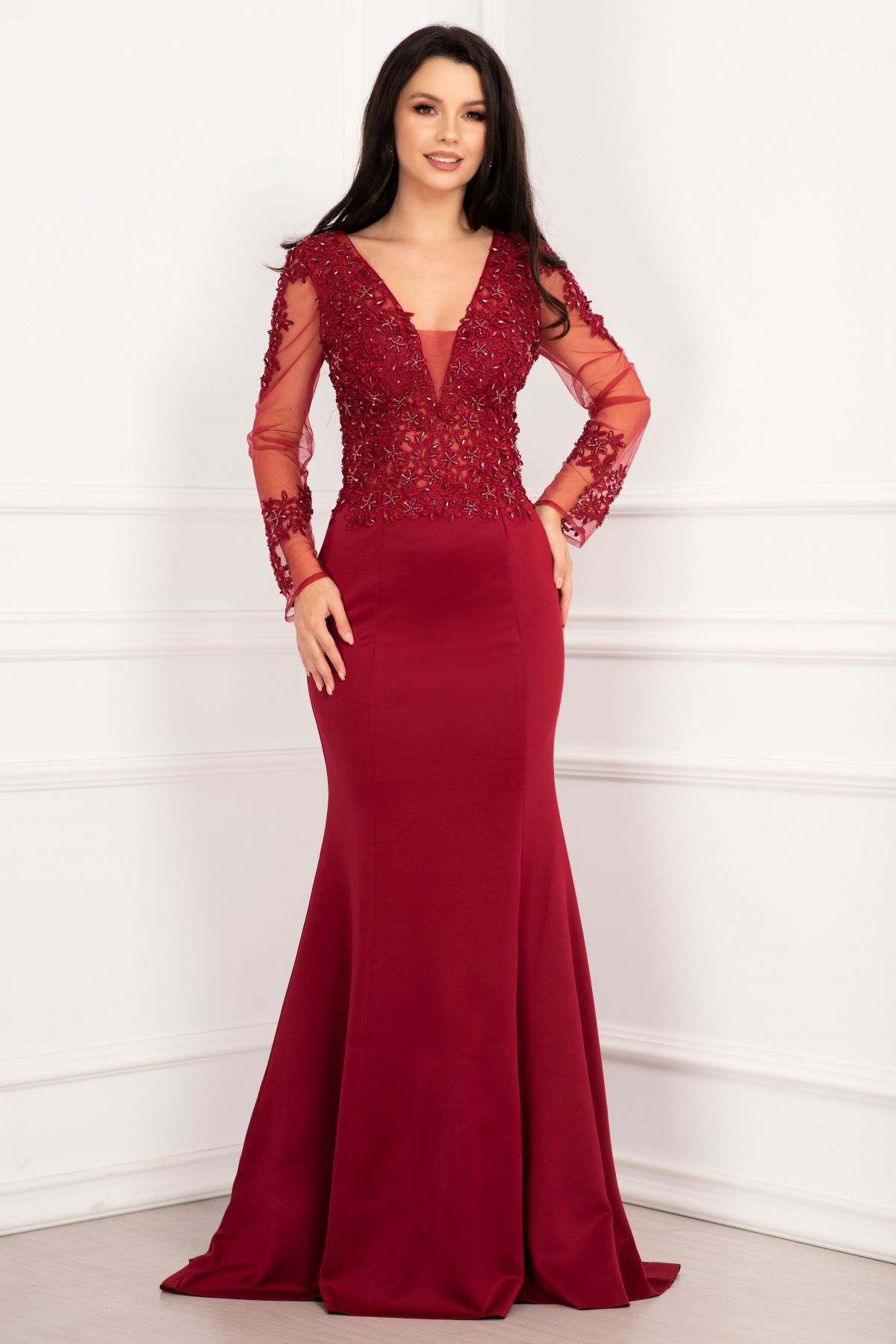 Rochie de seara bordo pretioasa tip sirena cu broderie aplicata si margele ; Culoare:bordo ; Croi:tip sirena ; Textura: scuba broderie margele ; Cupe buretate ; Decolteu in V in fata si in spate ; Maneci lungi din tul ; Bust din tul cu broderie florala aplicata ; Margele bordo cusute manual ; Usor elastica in partea de jos ; Nu prezinta dublura ; Inchidere cu fermoar la spate ; Compozitie: 95% poliester 5% elastan ; * Modelul nostru poarta marimea 36(S) p> * Echipa noastra face toate eforturile in a prezenta cat mai bine culorile produselor prezentate pe site insa culorile pot diferi de situatia reala si pot varia în functie de setarile monitorului/dispozitivului dvs! p>