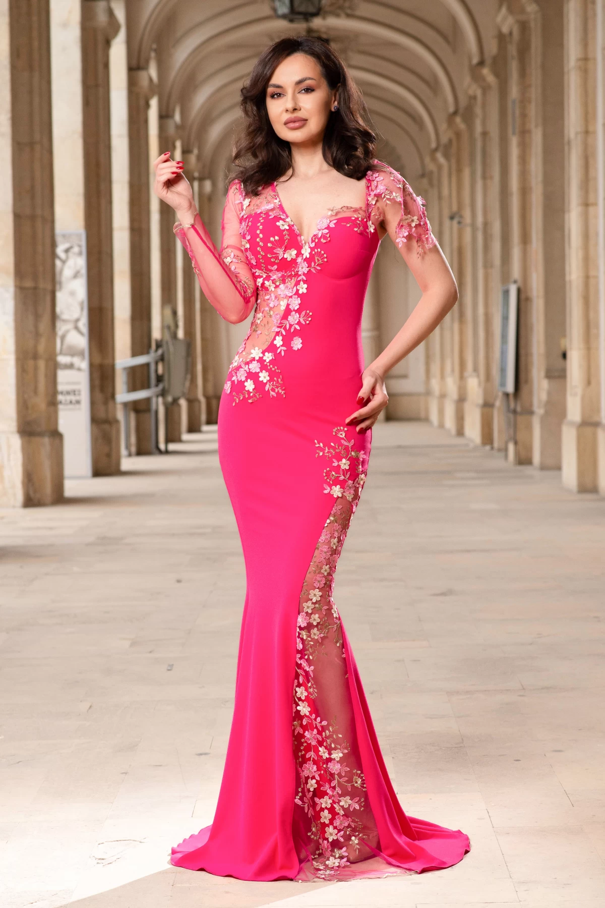 Rochie de seara eleganta lunga roz Anelisse tip sirena cu flori brodate ; Culoare: roz ; Croi: sirena ; Textura: bistrech ; Material usor elastic ; Fara dublura ; Decolteu in V ; Cupe buretate cu push-up ; Maneci lungi din tulle brodat ; Insertii pretioase din flori de cires brodate cu frunzulite aurii ; Inchidere cu fermoar la spate ; Compozitie: 95% poliester 5% elastan ; Fabricat in Romania ; * Echipa noastra face toate eforturile in a prezenta cat mai bine culorile produselor prezentate pe site insa culorile pot diferi de situatia reala si pot varia în functie de setarile monitorului/dispozitivului dvs!