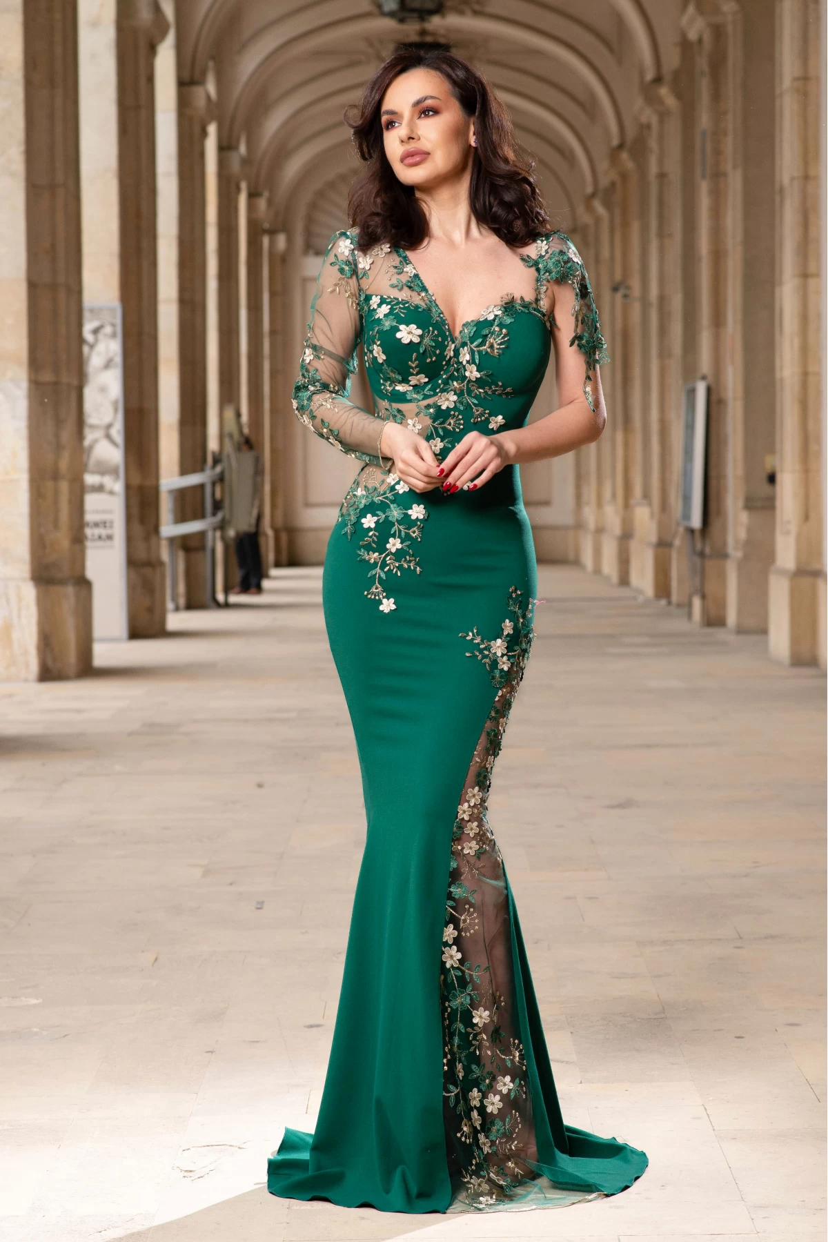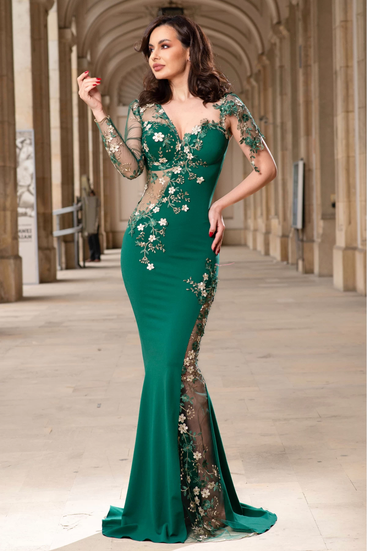 Rochie de seara eleganta lunga verde Anelisse tip sirena cu flori de cires brodate ; Culoare: verde ; Croi: sirena ; Textura: bistrech ; Material usor elastic ; Fara dublura ; Decolteu in V ; Cupe buretate cu push-up ; Maneci lungi din tulle brodat ; Insertii pretioase din flori de cires brodate cu frunzulite aurii ; Inchidere cu fermoar la spate ; Compozitie: 95% poliester 5% elastan ; Fabricat in Romania ; * Echipa noastra face toate eforturile in a prezenta cat mai bine culorile produselor prezentate pe site insa culorile pot diferi de situatia reala si pot varia în functie de setarile monitorului/dispozitivului dvs!