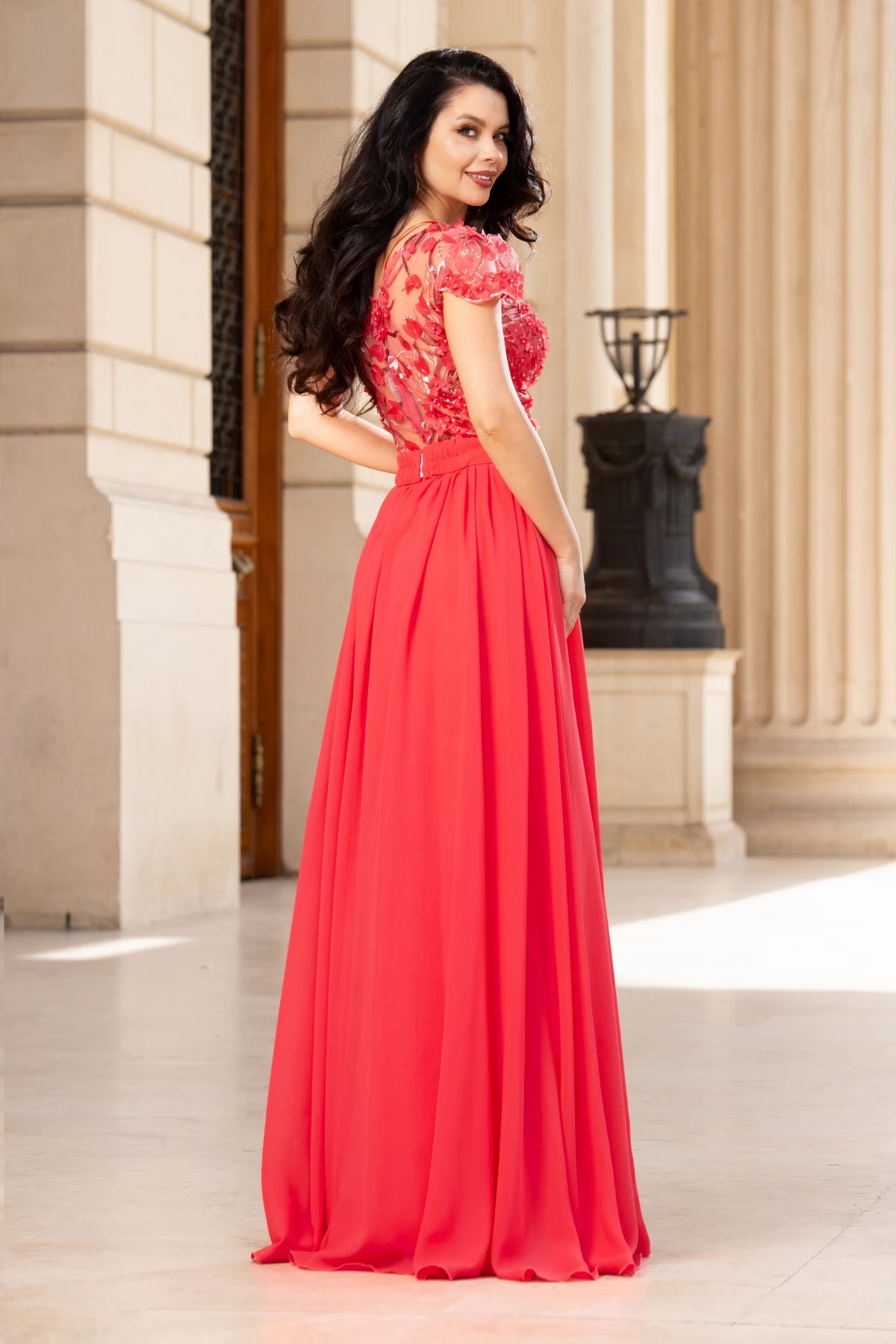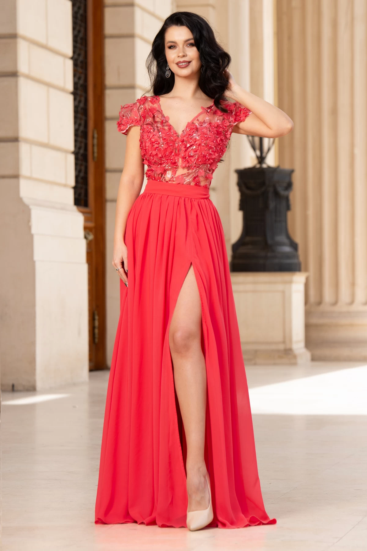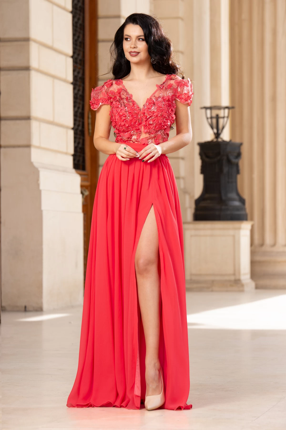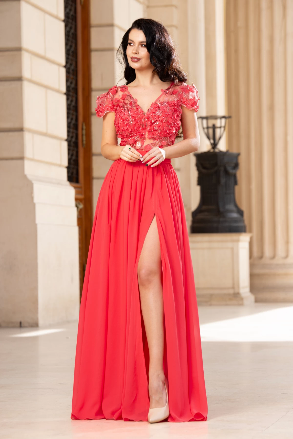 Rochie de seara Larissa coral din voal cu flori 3D ; Culoare: coral ; Textura: voal ; Maneci scurte ; Decolteu in V ; Prezinta dublura ; Cupe buretate cu push-up ; Cordon elastic detasabil in talie ; Partea de sus decorata cu flori 3D margele si paiete ; Inchidere cu fermoar la spate ; Compozitie: 95% poliester 5% elastan ; Fabricat in Romania ; * Echipa noastra face toate eforturile in a prezenta cat mai bine culorile produselor prezentate pe site insa culorile pot diferi de situatia reala si pot varia în functie de setarile monitorului/dispozitivului dvs!