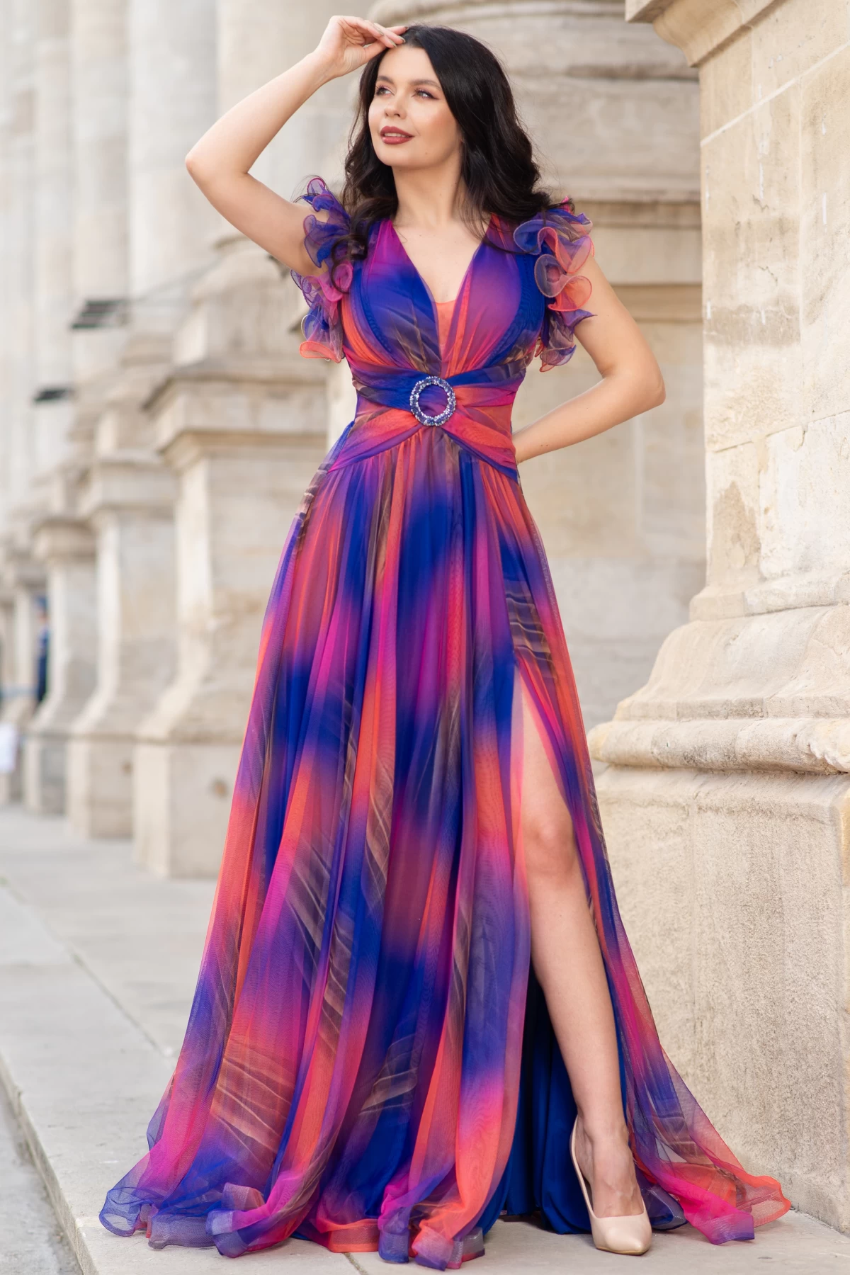 Comandă online o Rochie de seara lunga Tereza albastra cu imprimeu tip pictura cu livrare rapidă prin curier sau easybox!