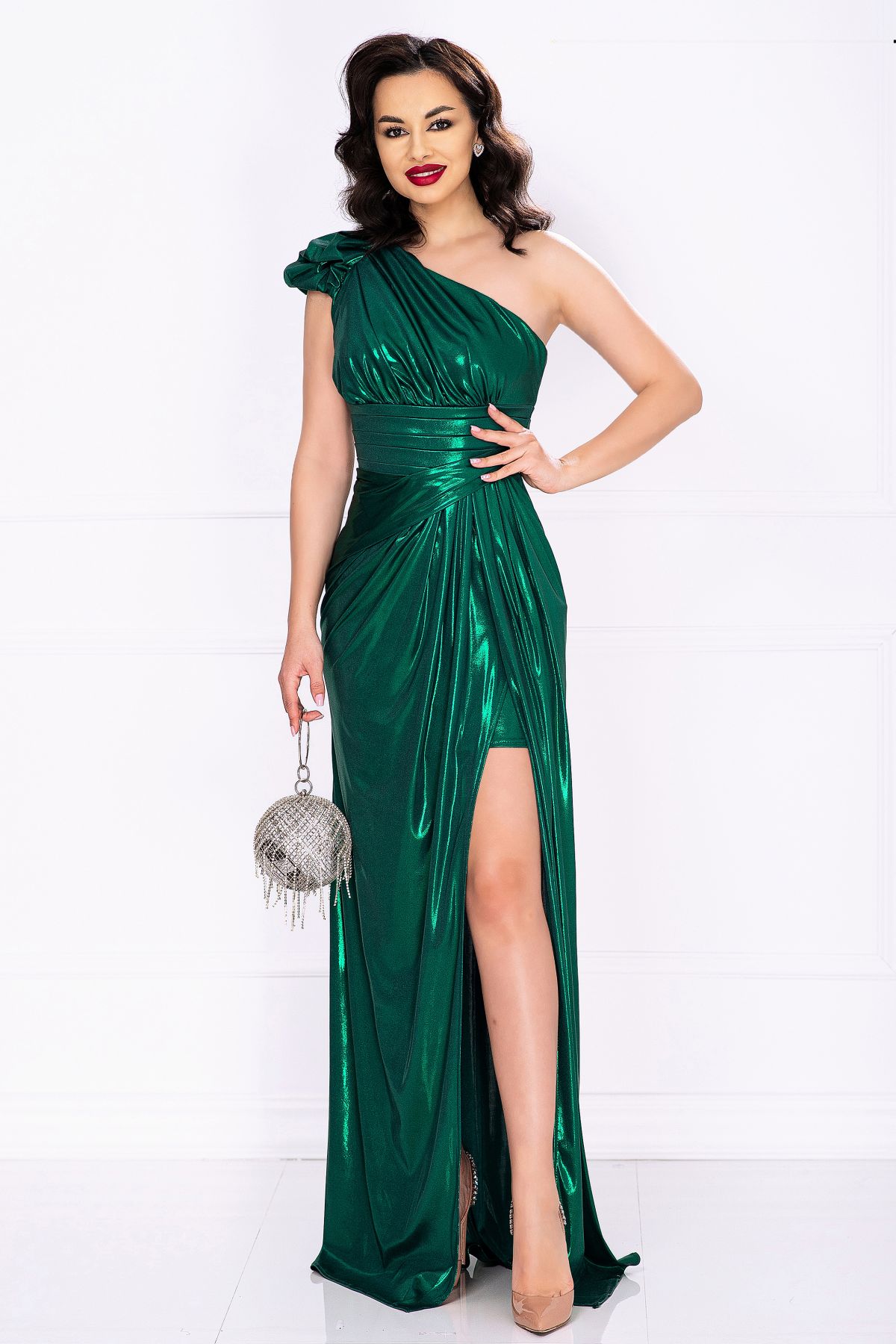 Rochie de seara peliculizata verde Calantha cu floare 3D pe umar ; Culoare: verde ; Material peliculizat ; Fara maneci ; Dublata pe interior ; Spartura ampla pe picior ; Decolteu asimetric ; Talie marcata cu banda lata plisata ; Bust buretat ; Inchidere cu fermoar la spate ; Umar gol cu bretea trasparenta pentru sustinere ; Banda anti-alunecare in interior pe linia bustului ; Floare 3D pe umar ; Compozitie: 100% poliester ; * Echipa noastra face toate eforturile in a prezenta cat mai bine culorile produselor prezentate pe site insa culorile pot diferi de situatia reala si pot varia în functie de setarile monitorului/dispozitivului dvs!