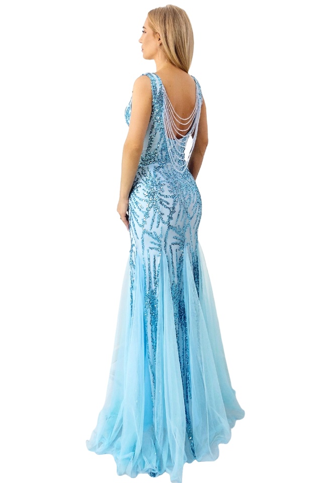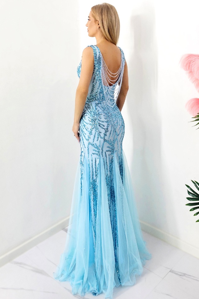 Rochie de seara, tip sirena, Fabyola, cu paiete si insertii din voal, Albastru baby blue
