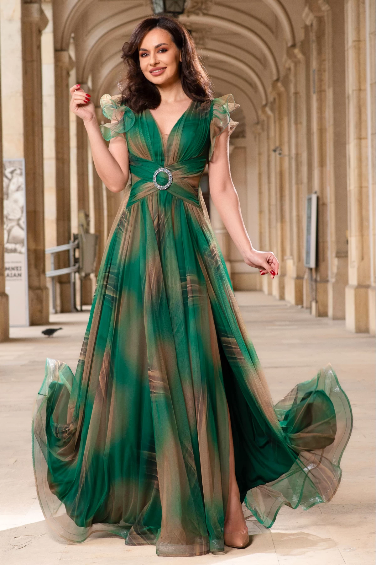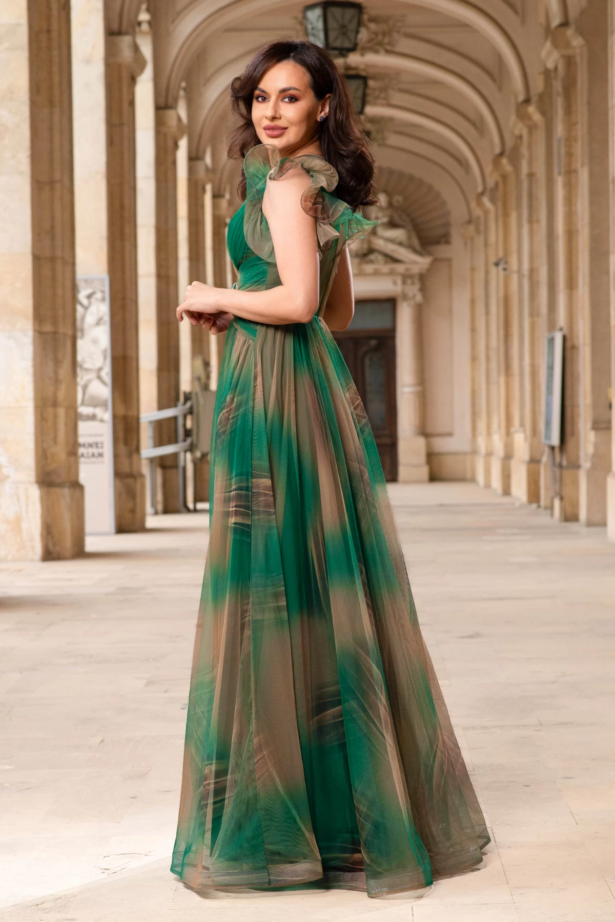 ;strong>Rochie de seara verde lunga Tereza cu imprimeu tip pictura strong> Rochia de lux croita din material premium cu banda lata in zona taliei si fusta ampla cu decupaj senzual pe picior avantajaza orice silueta si este perfecta daca iti doresti o aparitie plina de rafinament la evenimentele speciale. Imprimeul misterios tip pictura atrage toate privirile si defineste perfect frumoasa linie a siluetei. ; Culoare: verde bej ; Croi: clos printesa ; Fara maneci ; Volane elegante la umeri ; Decolteu in V ; Cupe buretate ; Prezinta dublura ; Fronseuri in zona bustului ; Talie lata cu catarama pretioasa cu strassuri ; Crapatura senzuala pe picior ; Rijelina pentru volum in partea de jos ; Inchidere cu fermoar la spate ; Compozitie: 100% poliester ; * Echipa noastra face toate eforturile in a prezenta cat mai bine culorile produselor prezentate pe site insa culorile pot diferi de situatia reala si pot varia în functie de setarile monitorului/dispozitivului dvs!