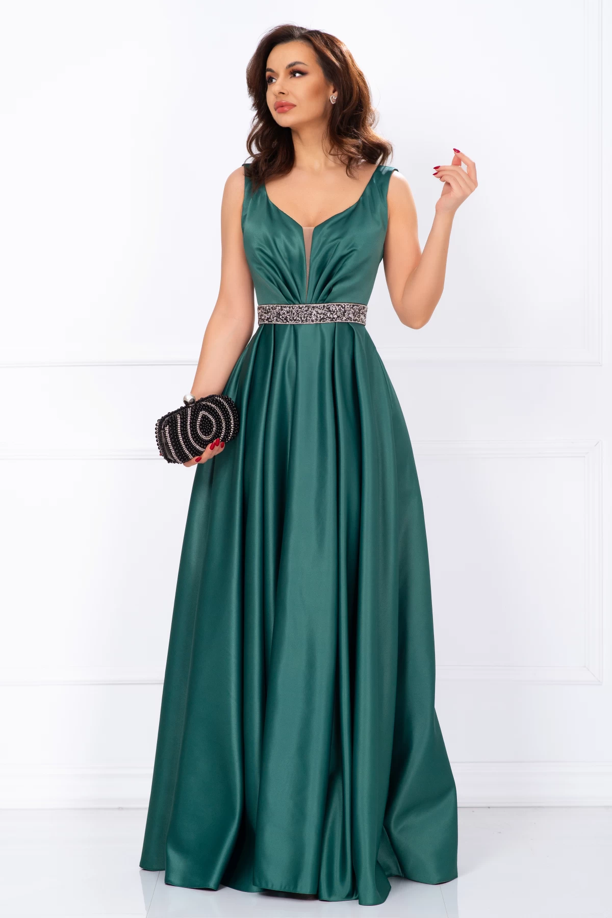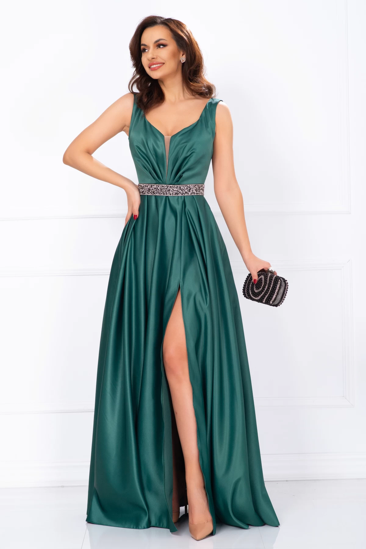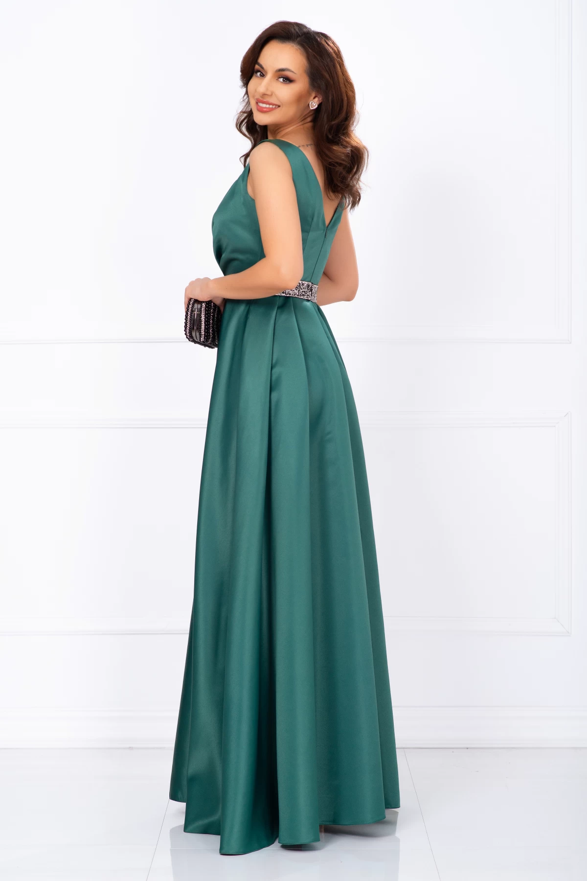 Rochie de soacra lunga Camila din tafta verde ; Culoare: verde ; Textura: tafta subtire ; Decolteu in V ; Fara maneci ; Material plin satinat ; Bust buretat ; Prezinta dublura in zona bustului ; Crapatura ampla pe picior ; Inchidere cu fermoar la spate ; Centura pretioasa detasabila in talie ; Compozitie: 100% poliester ; * Echipa noastra face toate eforturile in a prezenta cat mai bine culorile produselor prezentate pe site insa culorile pot diferi de situatia reala si pot varia în functie de setarile monitorului/dispozitivului dvs!