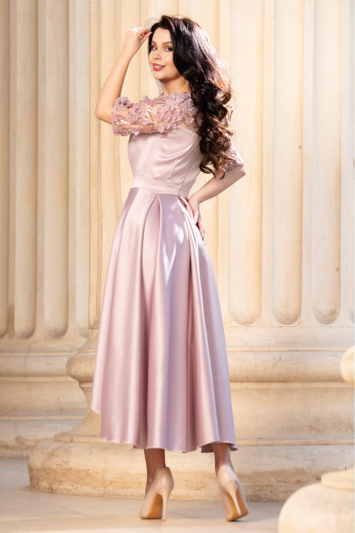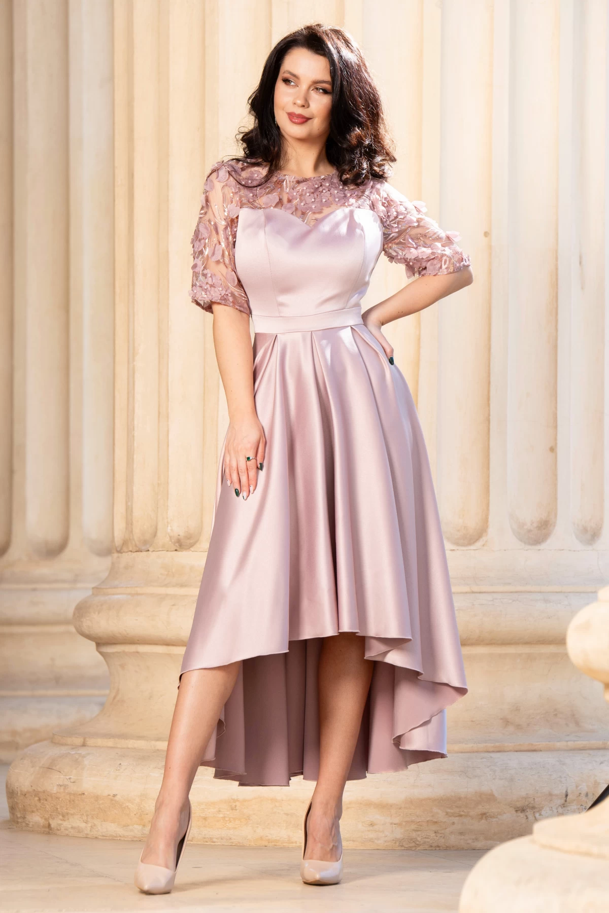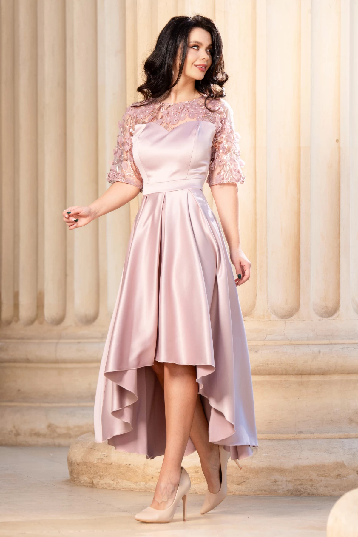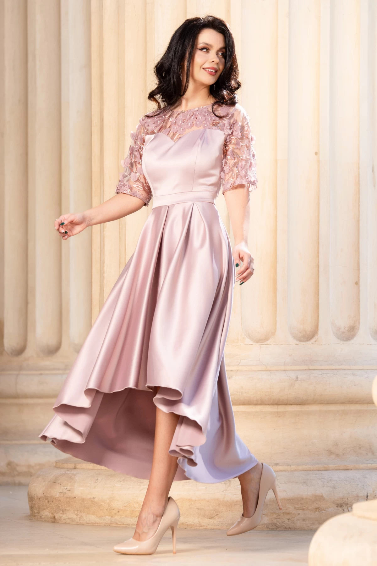 Rochie de soacra rose cu flori 3D si pliseuri ; Culoare: rose ; Croi: clos ; Lungime asimetrica ; Decolteu rotund ; Pliuri din zona taliei ; Maneci scurte ; Broderie cu flori 3D in partea de sus ; Inchidere cu fermoar la spate ; Compozitie: 90% poliester 10% elastan ; Fabricat in Romania ; * Echipa noastra face toate eforturile in a prezenta cat mai bine culorile produselor prezentate pe site insa culorile pot diferi de situatia reala si pot varia în functie de setarile monitorului/dispozitivului dvs!