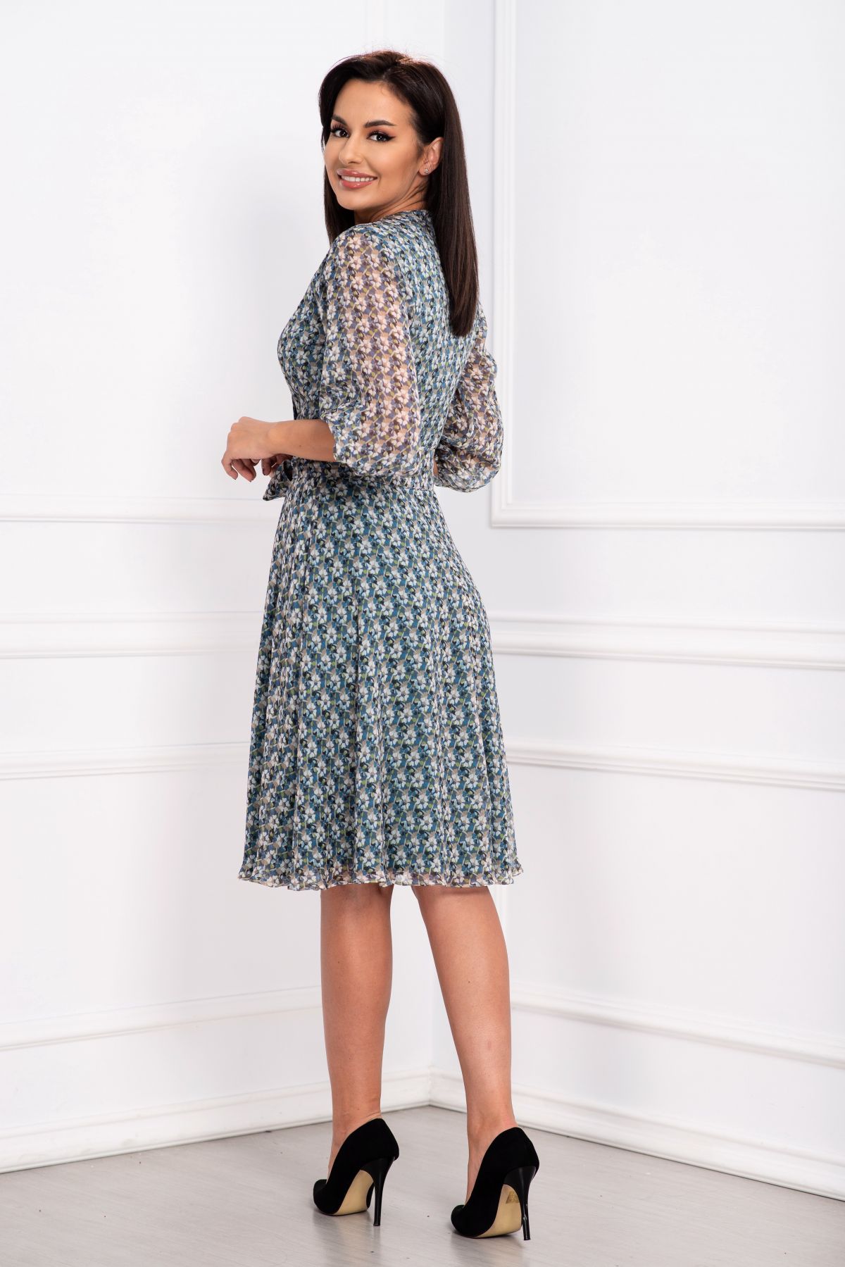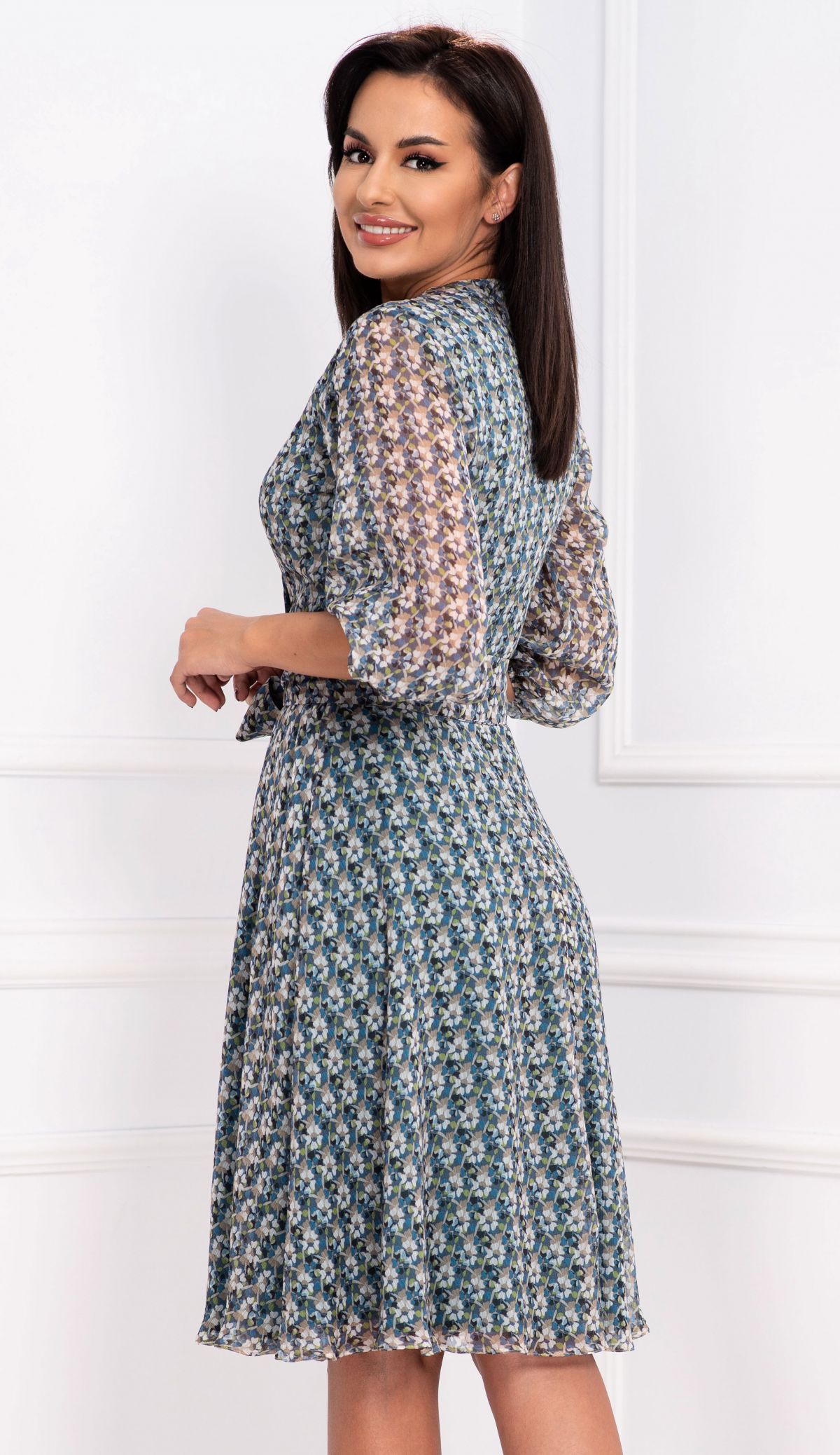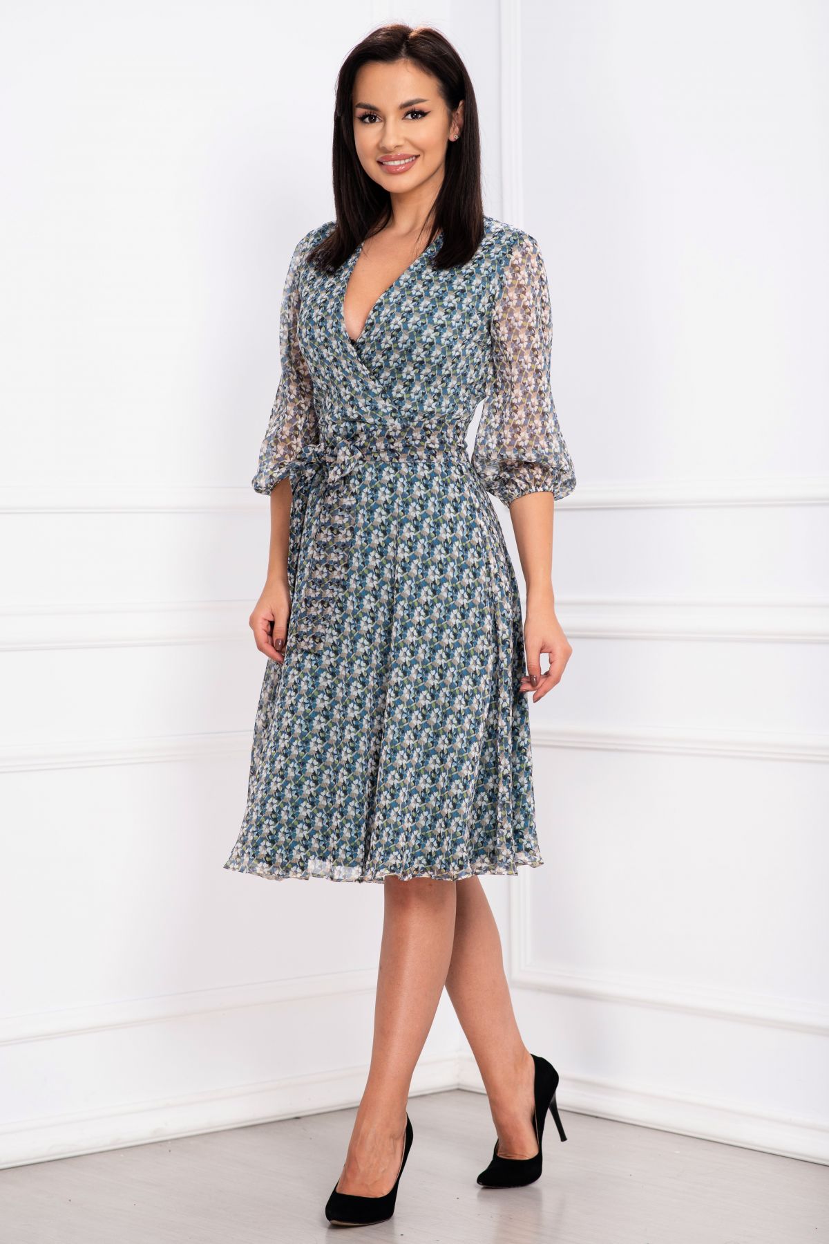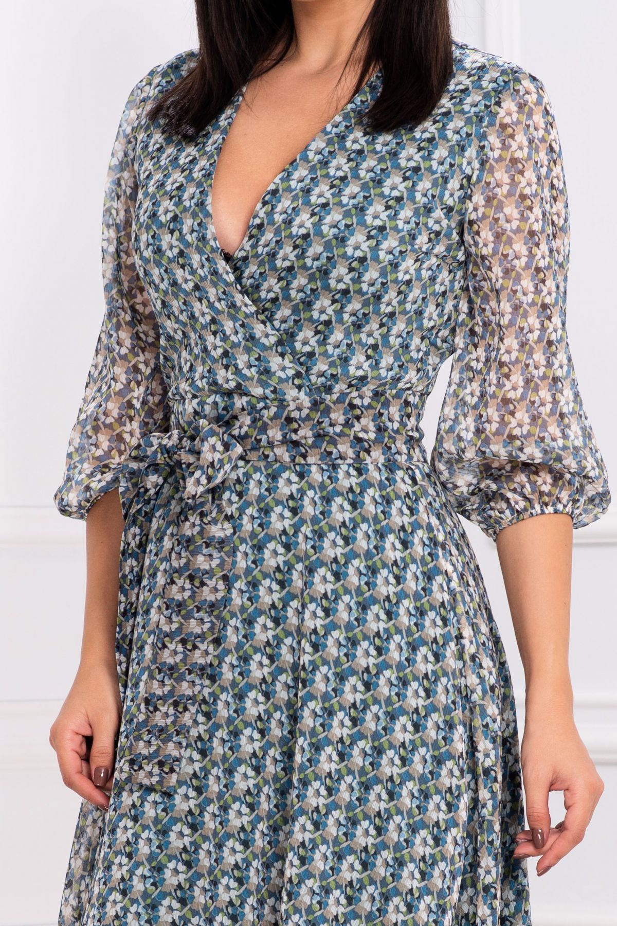 Rochie de toamana Effect din voal texturat cu print floral ; Culoare: albastru verde bej ; Imprimeu floral deosebit ; Textura: voal ; Material texturat ; Decolteu in V petrecut ; Croi: clos ; Prezinta dublura ; Inchidere cu fermoar la spate ; Maneca trei sferturi cu elastic la terminatie ; Cordon detasabil in talie ; Compozitie: 80% poliester 20% elastan ; Fabricat in Romania ; * Echipa InPuff face toate eforturile in a prezenta cat mai bine culorile produselor prezentate pe site insa culorile pot diferi de situatia reala si pot varia în functie de setarile monitorului/dispozitivului dvs!