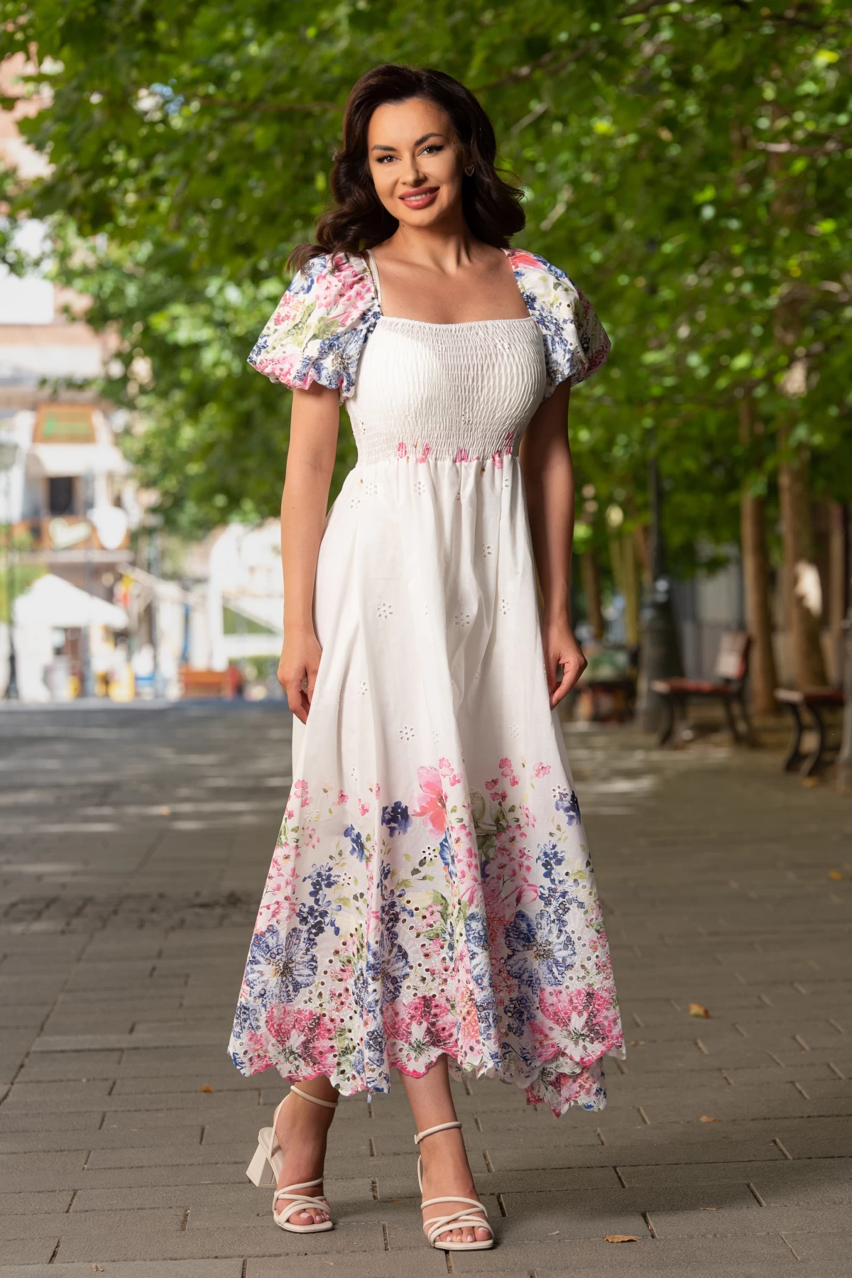 Rochie de vara alba din bumbac perforat cu imprimeu florala Culoare: albTextura: bumbacBust incretit elasticDecolteu patratManeci scurte bufanteFara sistem de inchidere Mansete eleasticeMaterial perforat cu model floralPrezinta dubluraImprimeu floral tip picturaCompozitie: 100% bumbac* Echipa noastra face toate eforturile in a prezenta cat mai bine culorile produselor prezentate pe site insa culorile pot diferi de situatia reala si pot varia în functie de setarile monitorului/dispozitivului dvs!