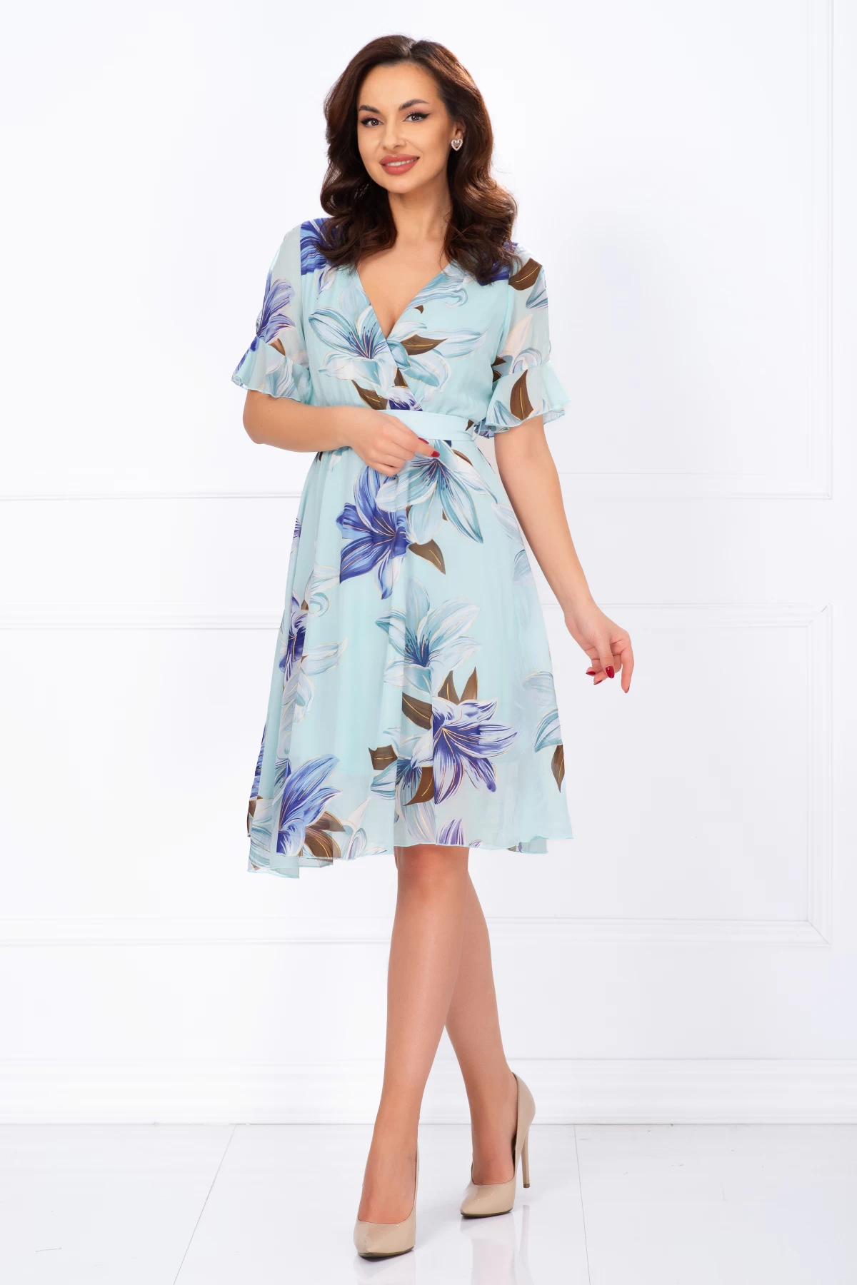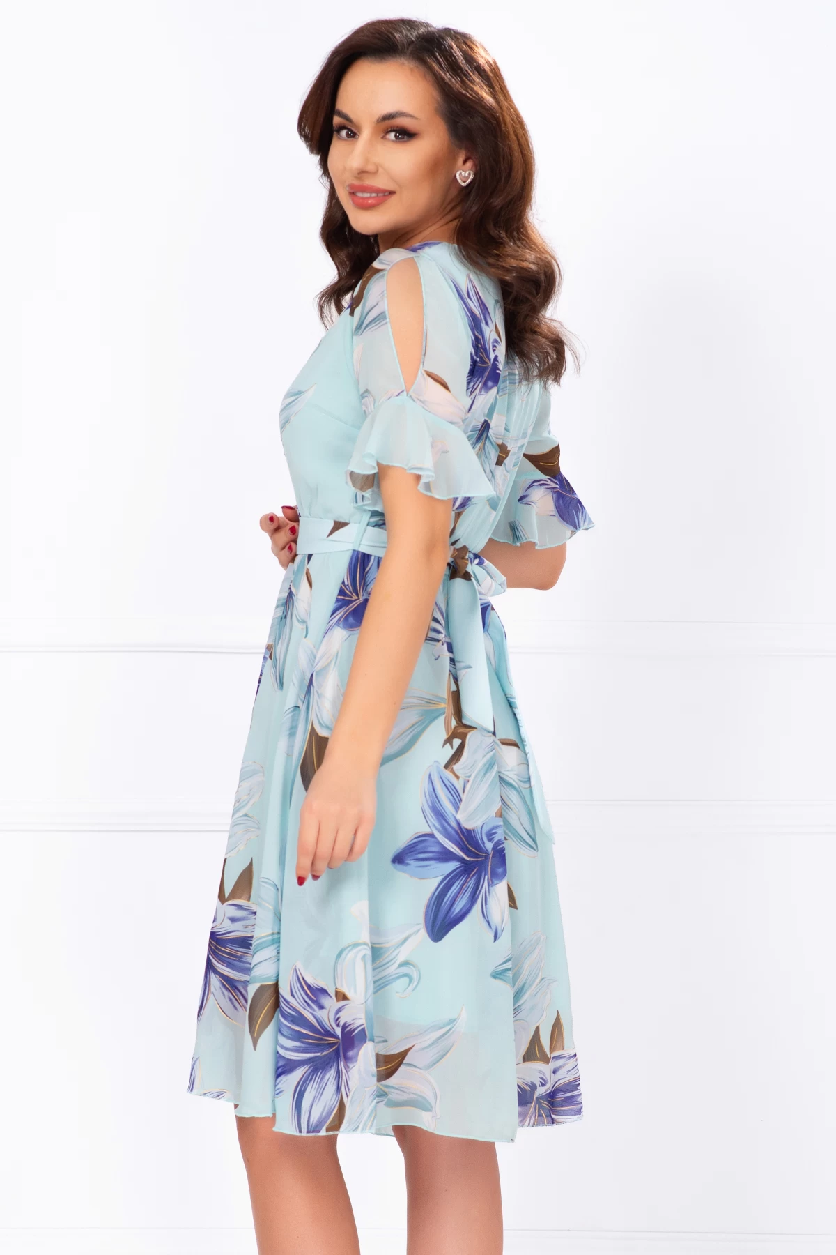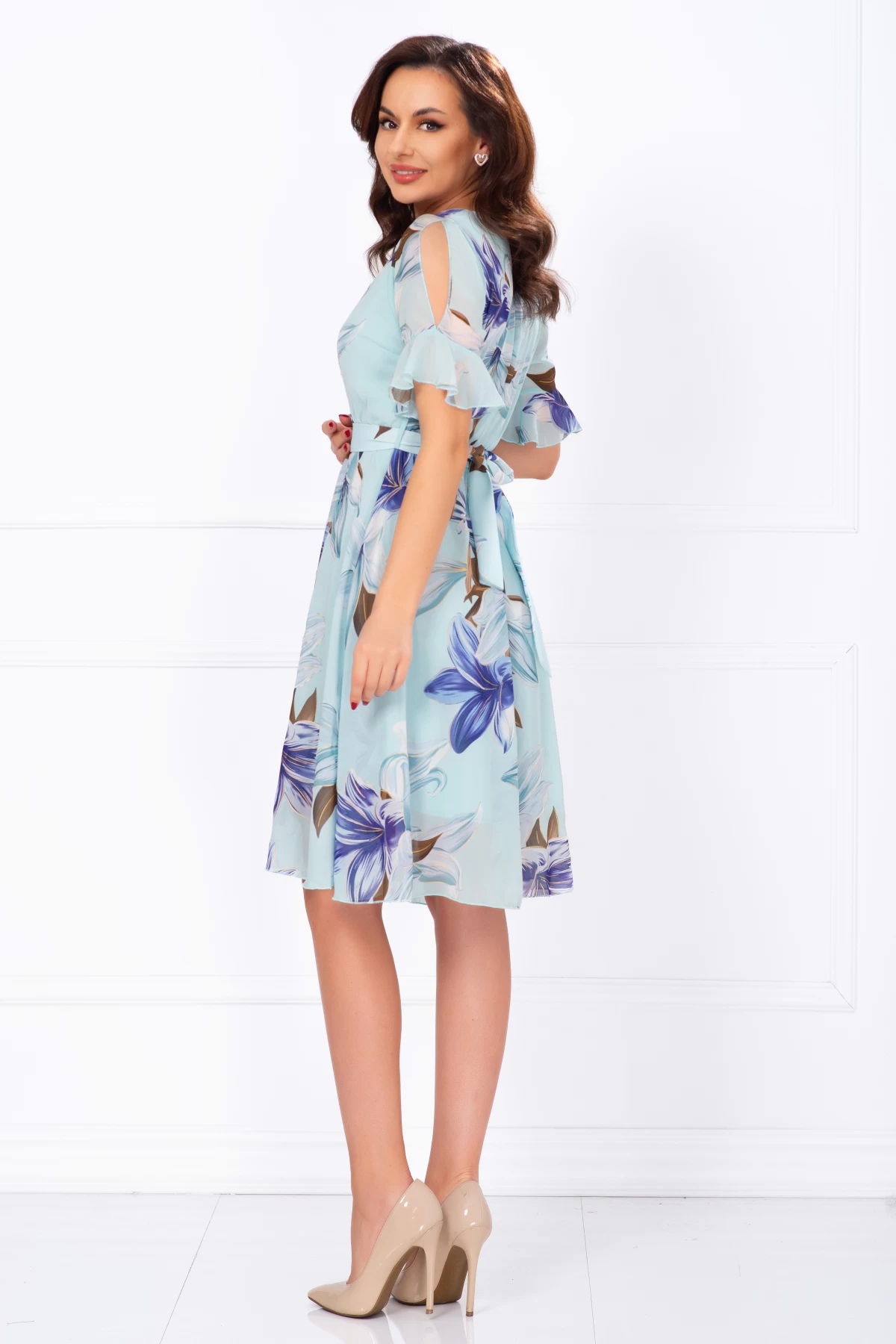 Comandă online o Rochie de zi din voal bleu in clos cu imprimeu floral cu livrare rapidă prin curier sau easybox!