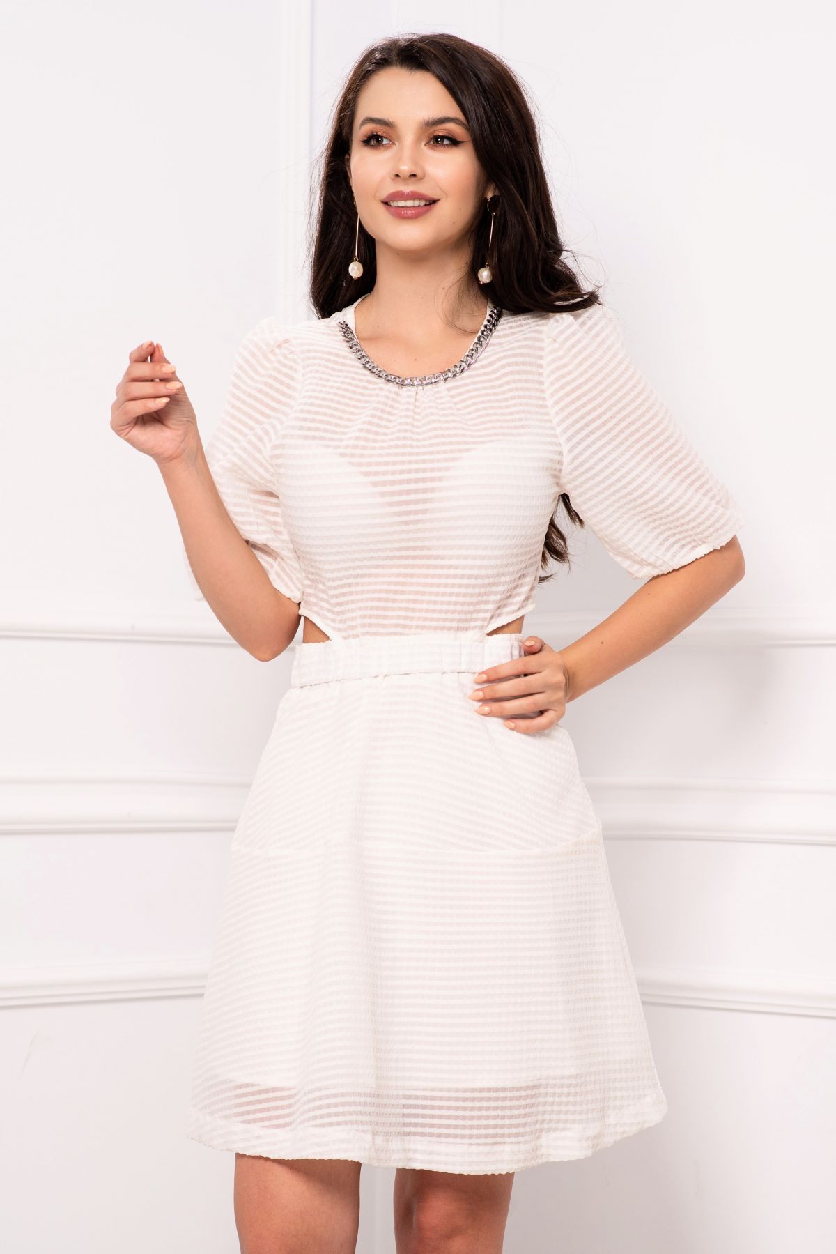 Rochie de zi eleganta alba cu decupaj la spate ; Culoare: alb ; Croi: clos ; Textura: material gofrat ; Decolteu rotund ; Lant decorativ argintiu ; Maneci scurte bufante ; Elastic in talie ; Inchidere cu nasturi la spate ; Prezinta dublura ; Decupaj pe spate ; Compozitie: 100% poliester ; * Echipa InPuff face toate eforturile in a prezenta cat mai bine culorile produselor prezentate pe site insa culorile pot diferi de situatia reala si pot varia în functie de setarile monitorului/dispozitivului dvs!