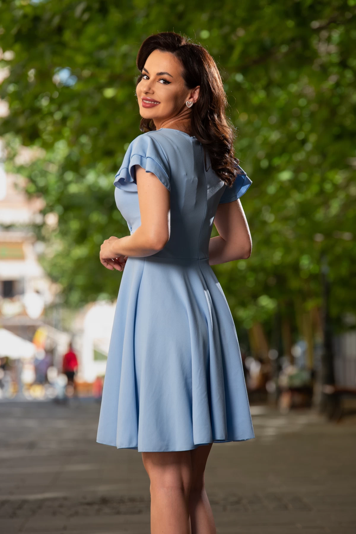 Rochie de zi eleganta bleu in clos cu volane la umeri ; Culoare: bleu ; Croi: clos ; Textura: bistrech ; Fara dublura ; Cupe buretate ; Talie marcata ; Decolteu in V petrecut ; Volane la umeri ; Inchidere cu fermoar la spate ; Compozitie: 95% poliester 5% elastan ; * Echipa noastra face toate eforturile in a prezenta cat mai bine culorile produselor prezentate pe site insa culorile pot diferi de situatia reala si pot varia în functie de setarile monitorului/dispozitivului dvs!