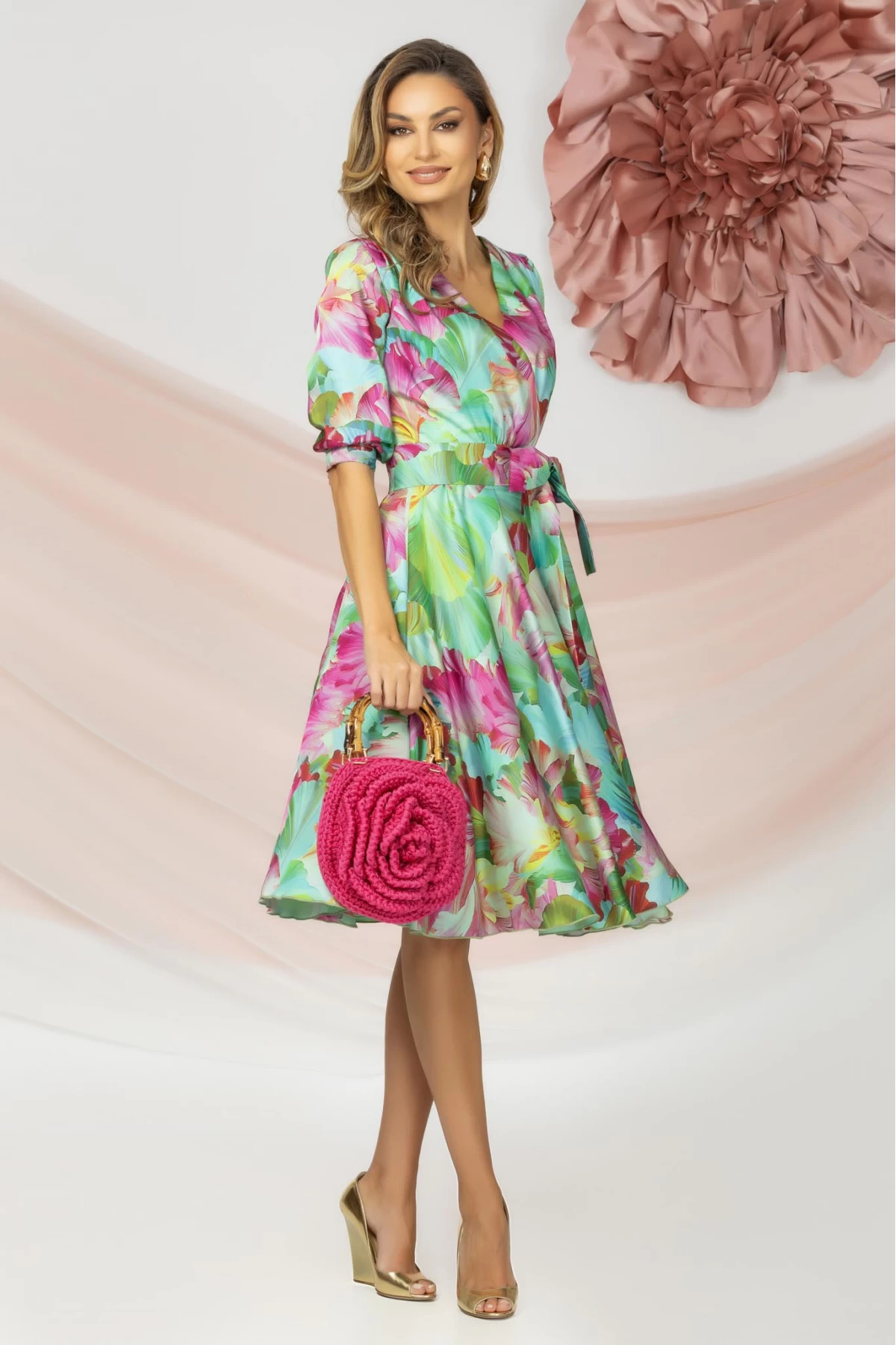 Rochie de zi eleganta in clos cu imprimeu floral multicolor- Pretty Girl Rochie vaporoasa în clos cu imprimeu floralBust petrecutUmar usor încretitMâneca deasupra cotului usor bufanta cu manseta la terminatieManseta se închide cu un nasturel tip perlaCordon amplu detasabilFusta în clos cu tiv surjeLungime fusta din talie: 70 cmȚesatura vaporoasa usor satinataCaptusita cu satin elasticCuloare: verdeCompozitie: 100% poliester; 98% poliester 2% elastanProdus fabricat în România.* Echipa noastra face toate eforturile in a prezenta cat mai bine culorile produselor prezentate pe site insa culorile pot diferi de situatia reala si pot varia în functie de setarile monitorului/dispozitivului dvs!