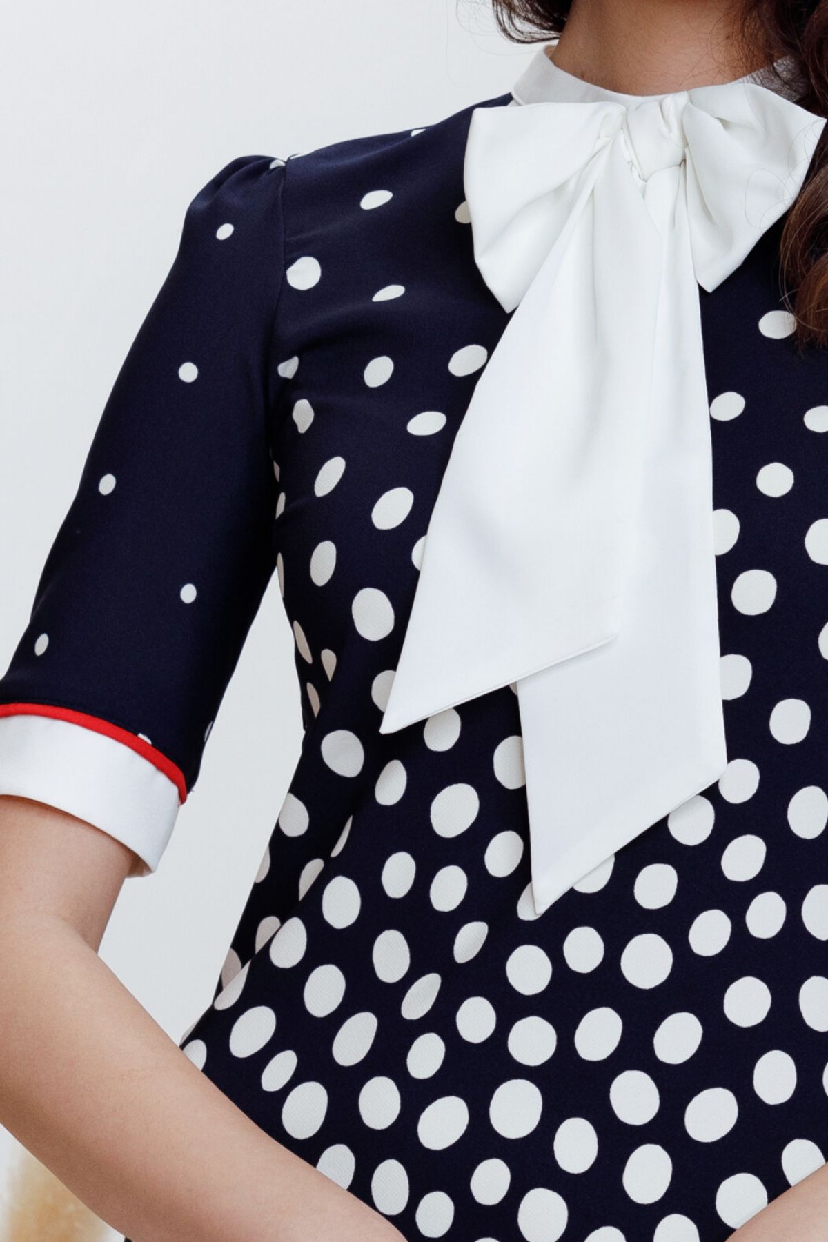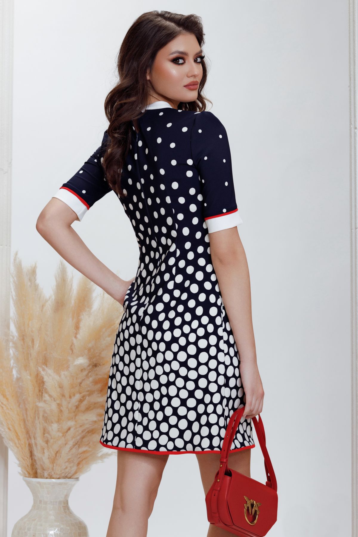 Rochie de zi Fofy in A cu buline degrade si funda stilizata ; Culoare: bleumarin ; Croi: lejer tip A ; Maneci scurte ; Mansete albe conturate cu banda rosie ; Imprimeu buline in degrade ; Guler alb cu funda stilizata tip esarfa ; Fara dublura ; Banda rosie la terminatie ; Inchidere cu fermoar si doi nasturi la spate ; Buzunare laterale functionale ; Compozitie: 95% poliester 5% elastan ; Fabricat in Romania ; * Echipa InPuff face toate eforturile in a prezenta cat mai bine culorile produselor prezentate pe site insa culorile pot diferi de situatia reala si pot varia în functie de setarile monitorului/dispozitivului dvs