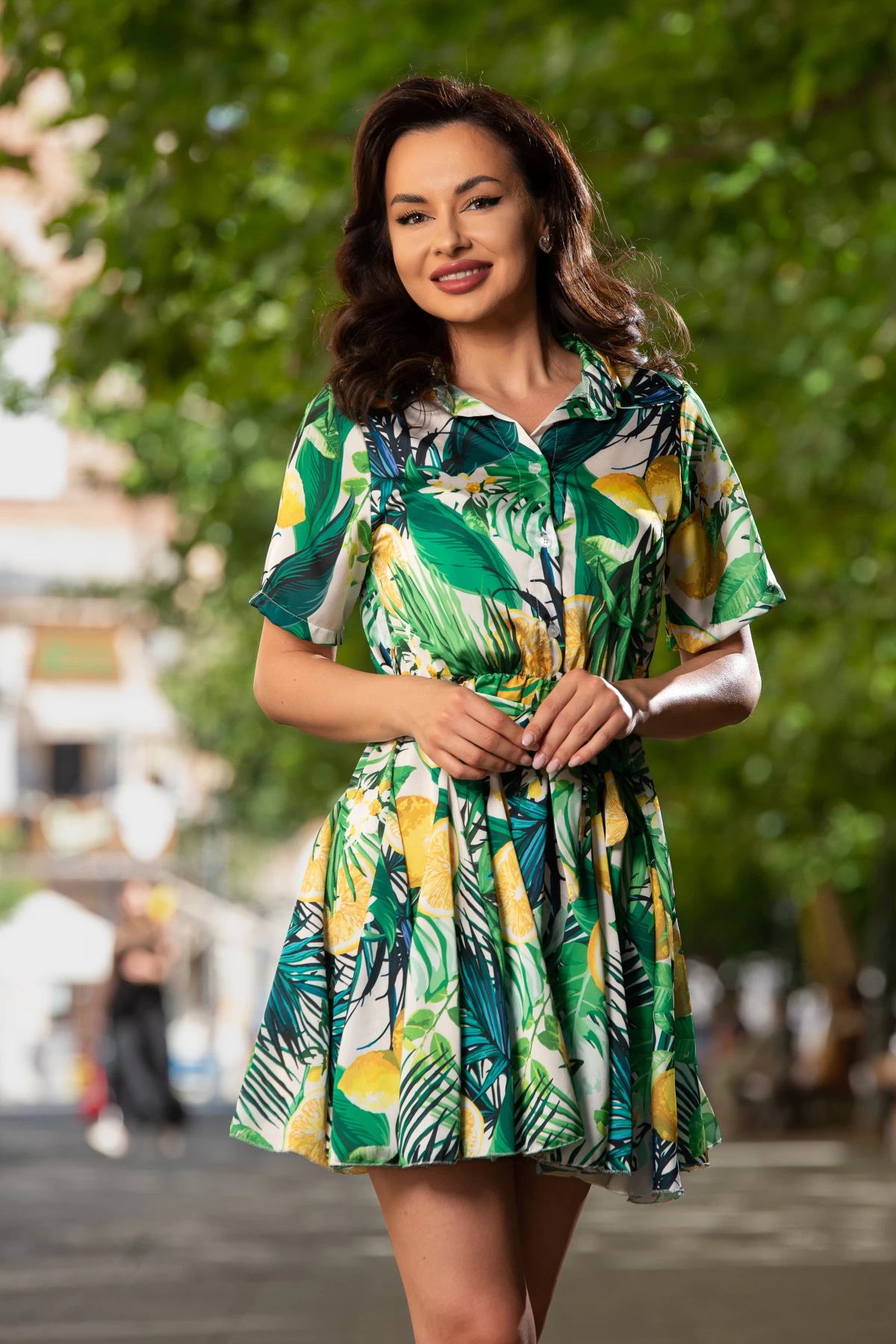 Rochie de zi in clos cu imprimeu lamai ; Culoare: verde ecru galben ; Croi: clos ; Material satinat ; Inchidere frontala cu nasturi ; Guler tip camasa ; Fara dublura ; Maneca scurta ; Elastic si cordon in talie ; Imprimeu lamai ; * Echipa noastra face toate eforturile in a prezenta cat mai bine culorile produselor prezentate pe site insa culorile pot diferi de situatia reala si pot varia în functie de setarile monitorului/dispozitivului dvs!