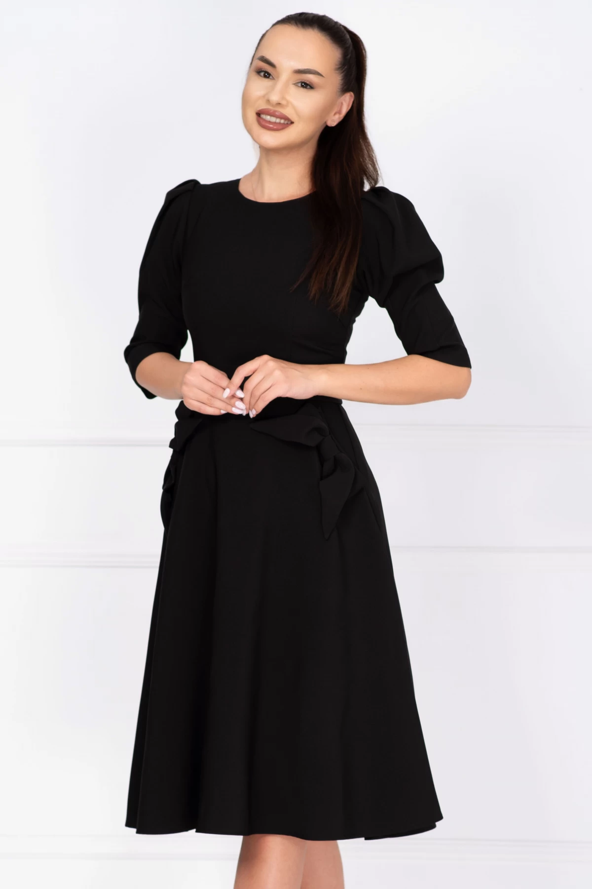 Comandă online o Rochie de zi in clos neagra Helene cu fundite decorative cu livrare rapidă prin curier sau easybox!