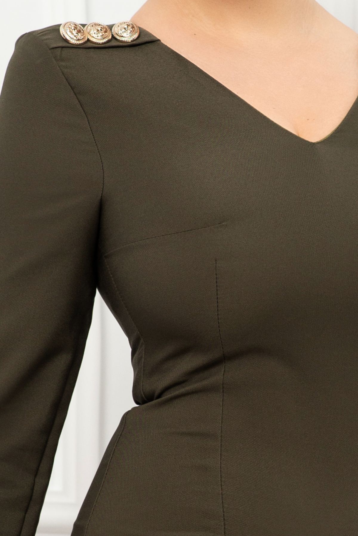 Rochie de zi kaki cu nasturi decorativi si volan in partea de jos ; Culoare:kaki ; Croi conic ; Textura: stofa subtire ; Nu prezinta dublura in partea de jos ; Maneci trei sferturi ; Inchidere cu fermoar la spate ; Decolteu in V ; Nasturi metalici decorativi la umeri ; Volan in partea de jos ; Compozitie: 95% poliester 5% elastan ; Produs de import ☑️ Calitate verificata InPuff ; * Modelul nostru poarta marimea 36(S)! * Echipa InPuff face toate eforturile in a prezenta cat mai bine culorile produselor prezentate pe site insa culorile pot diferi de situatia reala si pot varia în functie de setarile monitorului/dispozitivului dvs!