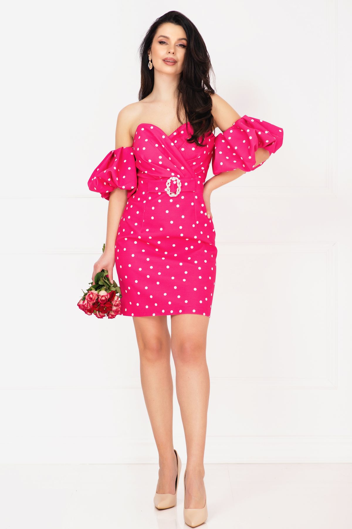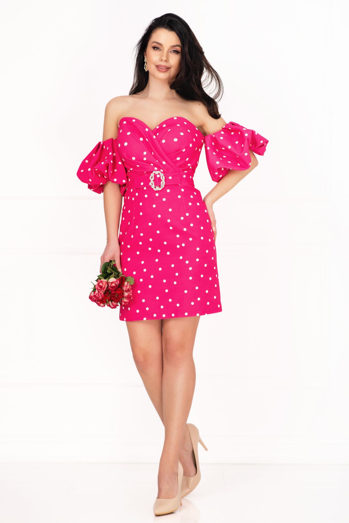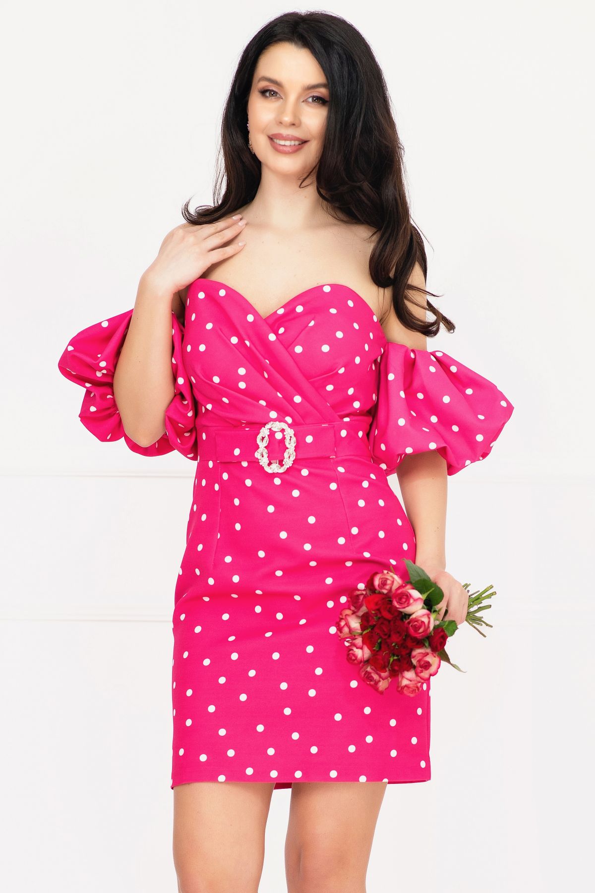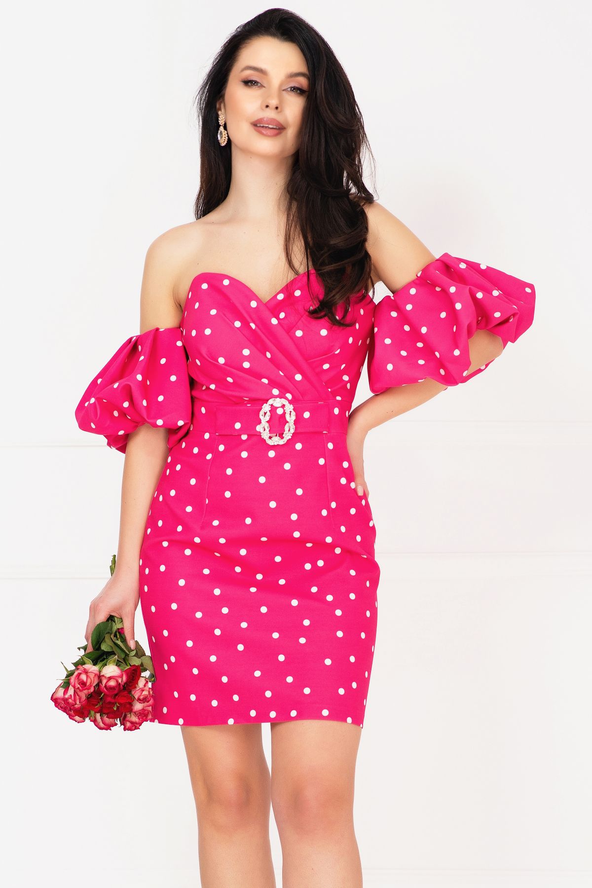 Rochie de zi Layla ciclame cu buline si maneci gogosar ; Culoare: ciclame ; Croi: conic ; Umeri goi ; Decolteu tip inima ; Bust buretat ; Maneci bufante tip gogosar ; Pliuri in zona bustului ; Imprimeu buline ; Inchidere cu fermoar la spate ; Material plin nu este elastic ; Funda stilizata ; Accesoriu pretios nedetasabil in talie ; Fara dublura ; Compozitie: 95% poliester 5% elastan ; * Echipa noastra face toate eforturile in a prezenta cat mai bine culorile produselor prezentate pe site insa culorile pot diferi de situatia reala si pot varia în functie de setarile monitorului/dispozitivului dvs!