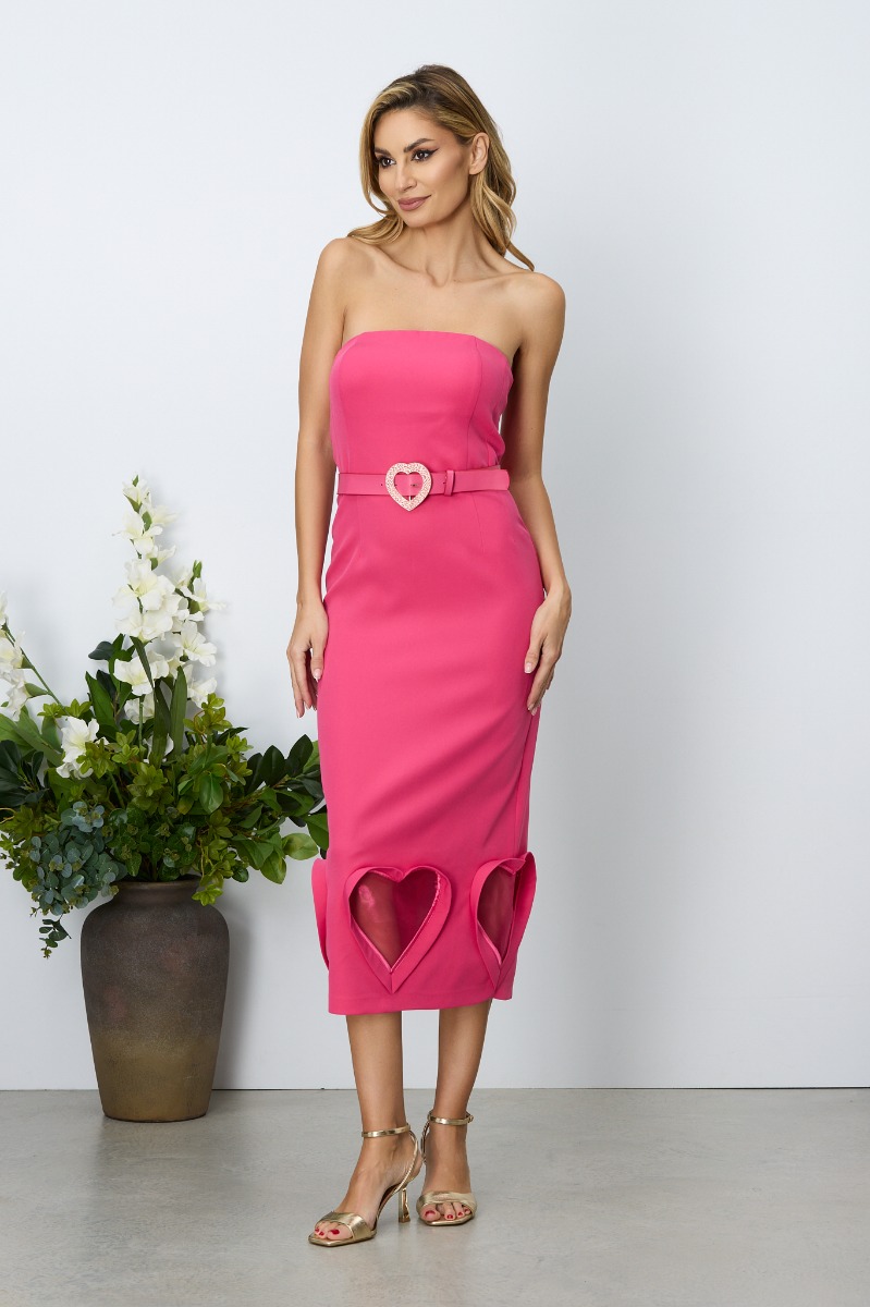 Rochie midi ciclam fara bretele are un croi elegant ce iti pune in valoare feminitatea. Purtata cu tocuri, vei obtine un look modern, in tendintele sezonului. Design-ul precum si materialul deosebit, va conferi tinutei tale stil si sigur vei atrage priviri asupra ta. material usor elastic fermoar la spate bust buretat crepeu la spate fara jupon decupaje prevazute cu tull in partea inferioara Dimensiuni disponibile: S, M, L, XL