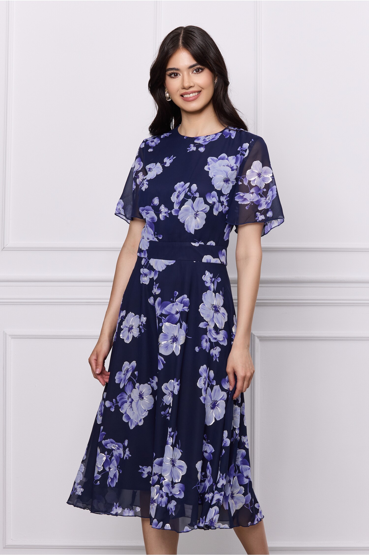 Rochie DY Fashion bleumarin din voal cu imprimeuri florale bleu
