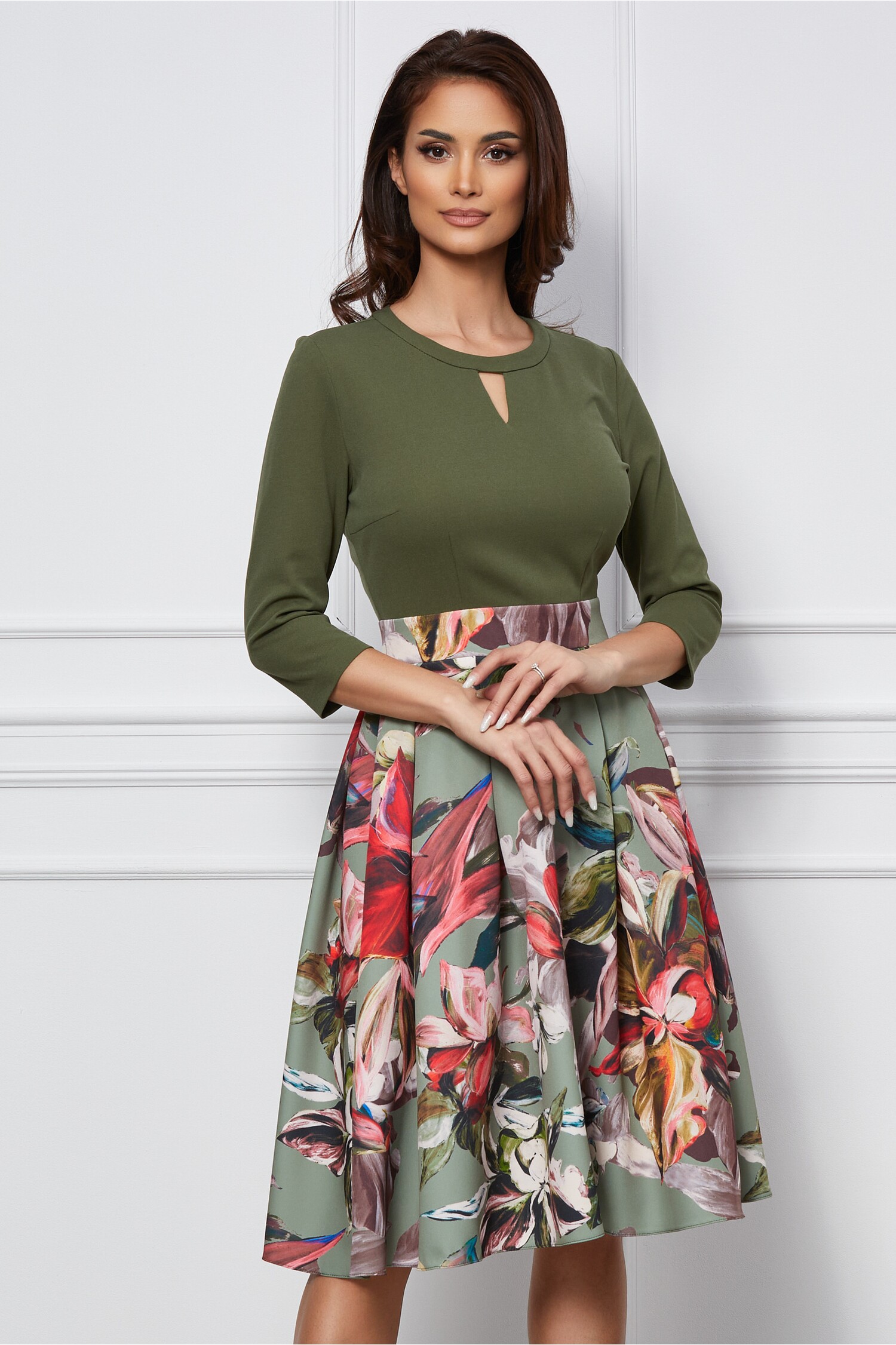 Comandă o Rochie Dy Fashion kaki cu imprimeu rosu pe fusta cu LIVRARE și RETUR GRATUIT!