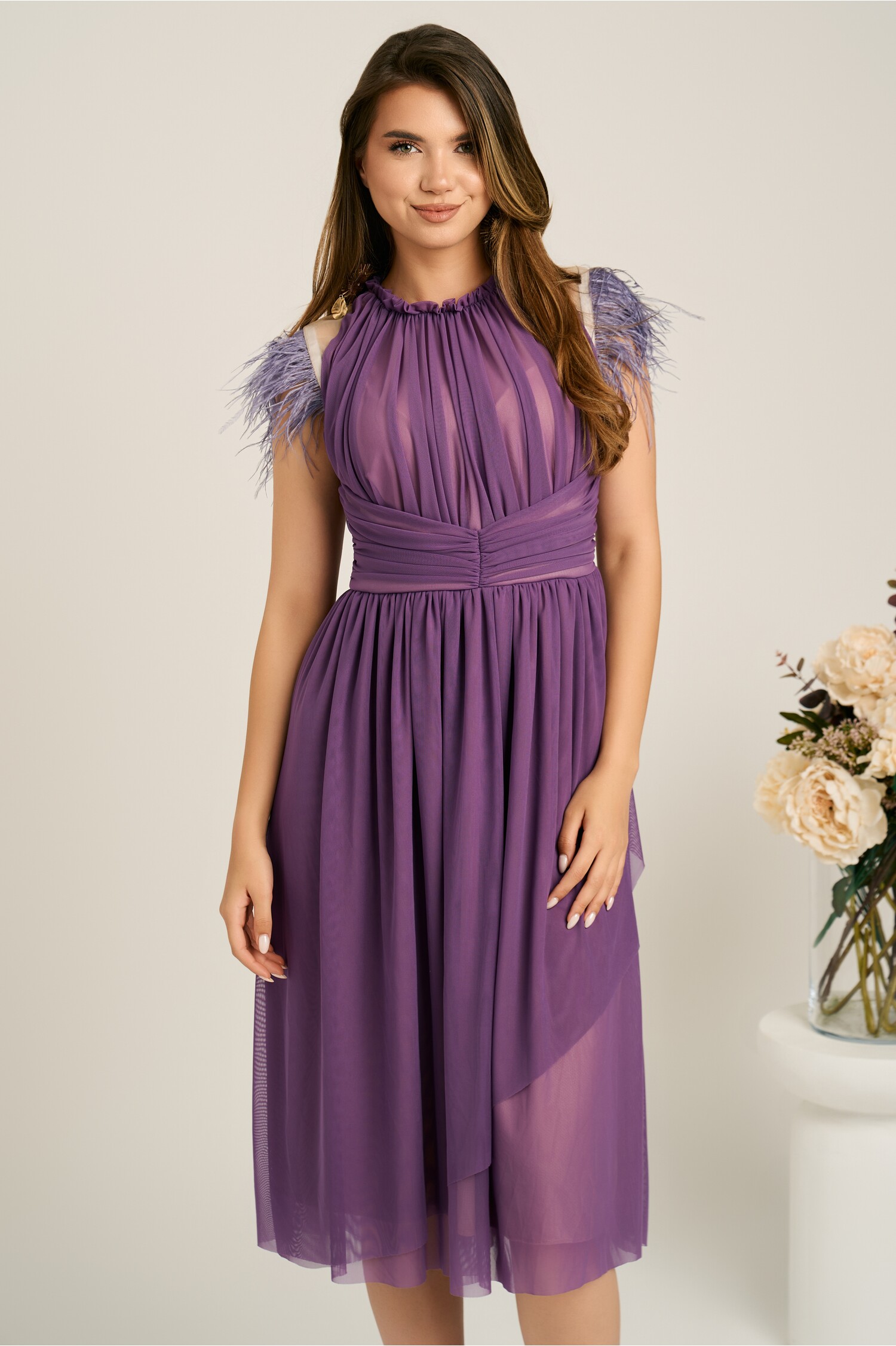 Rochie midi eleganta din tull cu pene la umeri. Are decolteu rotund, manecute scurte din pene si croi clos. Rochie midi eleganta Decolteu rotund Maneci scurte Croi clos Captusita pe interior Inchidere cu fermoar la spate Material: Tull Compozitie: 92% Poliester, 8% Spandex Fotomodelul poartă mărimea: S | Înălțime: 173 cm Fiecare produs este măsurat individual. Te rugăm să consulți ghidul de mărimi pentru alegerea corectă a mărimii!