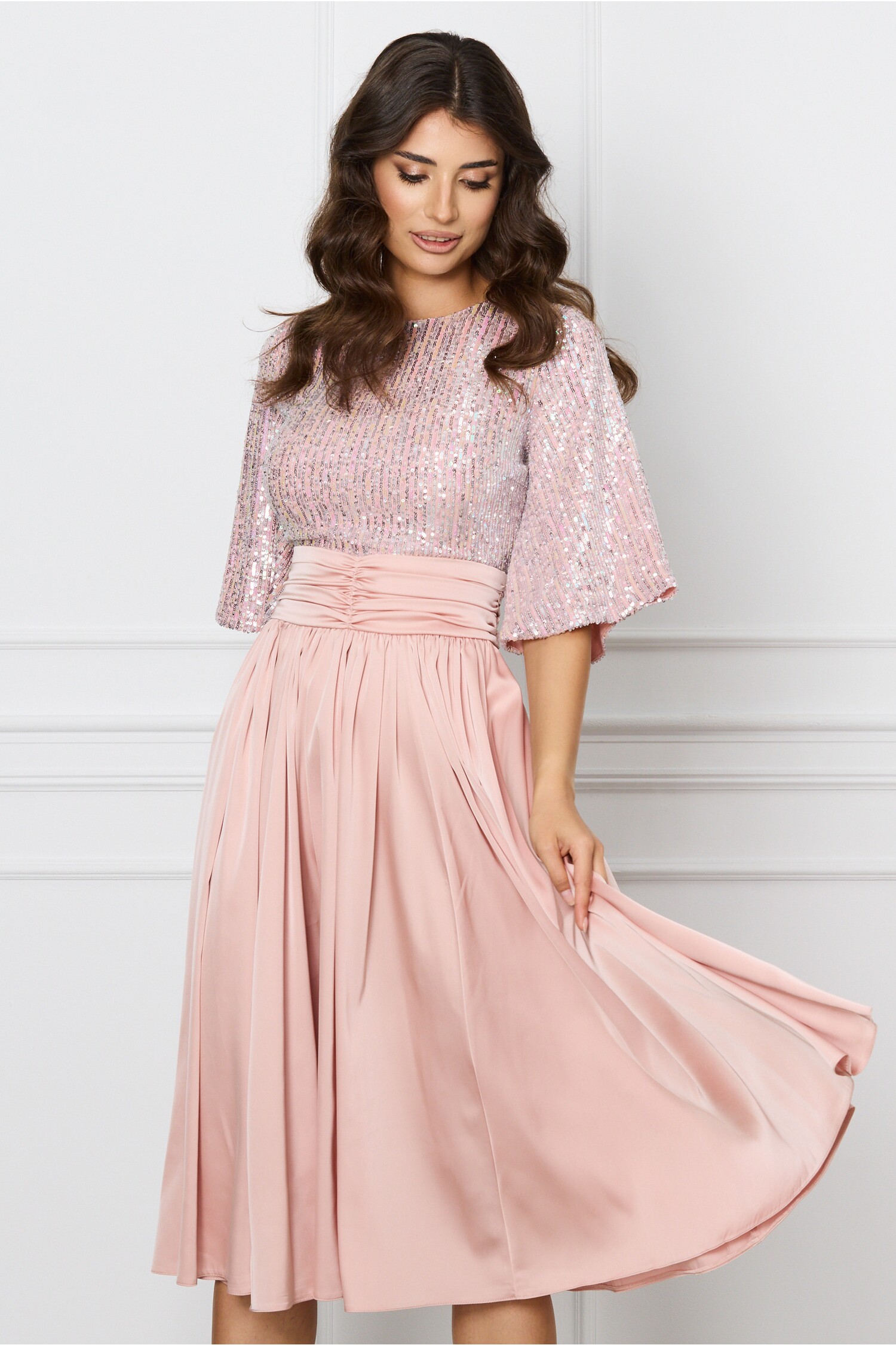 Rochie Dy Fashion roz cu paiete la bust si fusta din satin