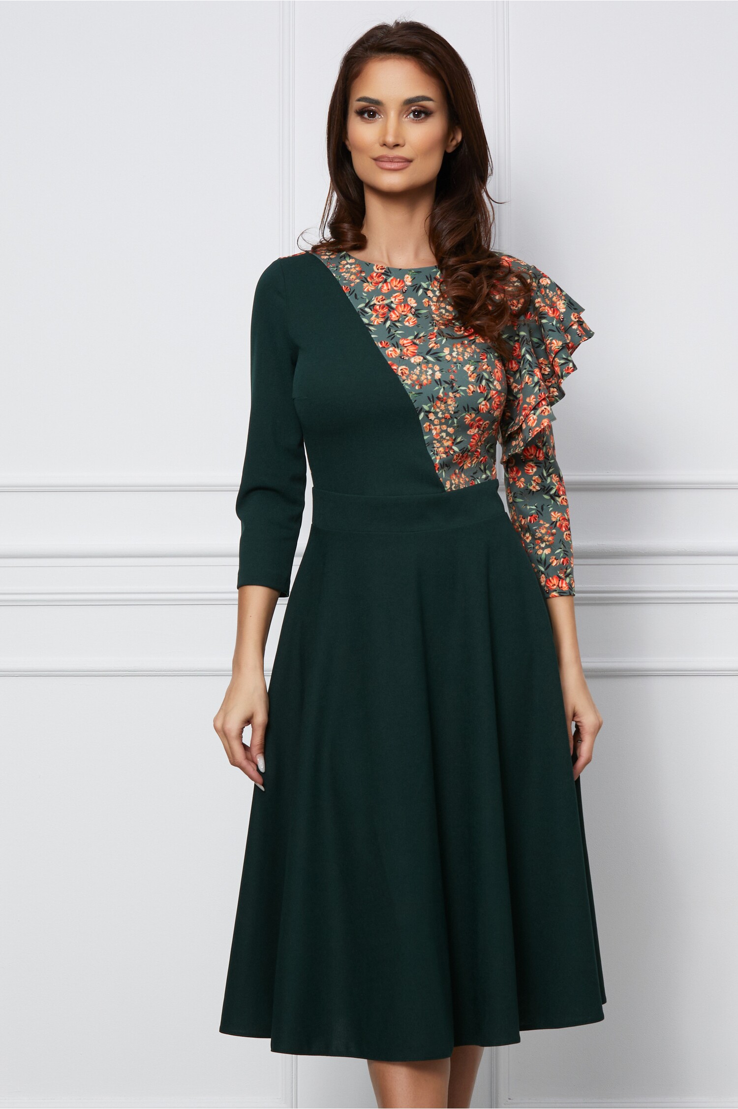 Rochie Dy Fashion verde inchis cu imprimeu orange si volan la bust