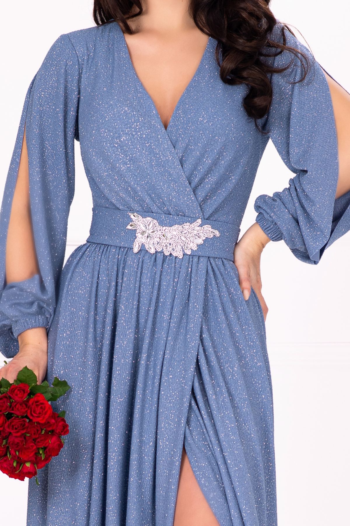 Rochie eleganta Chantal din lurex bleu lunga cu sclipici ; Culoare: bleu ; Textura: lurex ; Decolteu in V petrecut ; Sclipici pe toata suprafata ; Maneci lungi cu decupaj ; Mansete elastice ; Prezinta dublura ; Inchidere cu fermoar la spate ; Crapatura ampla pe picior ; Elastic in talie ; Centura detasabila decorata cu strassuri ; Compozitie: 95% poliester 5% elastan ; Fabricat in Romania ; * Echipa noastra face toate eforturile in a prezenta cat mai bine culorile produselor prezentate pe site insa culorile pot diferi de situatia reala si pot varia în functie de setarile monitorului/dispozitivului dvs!