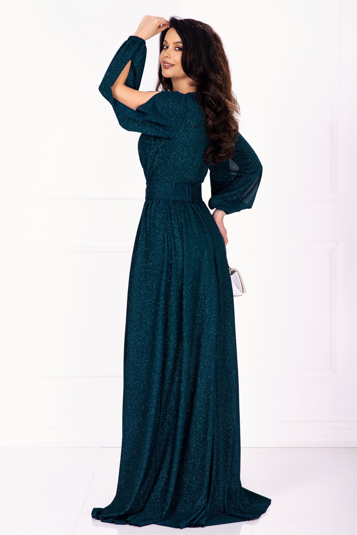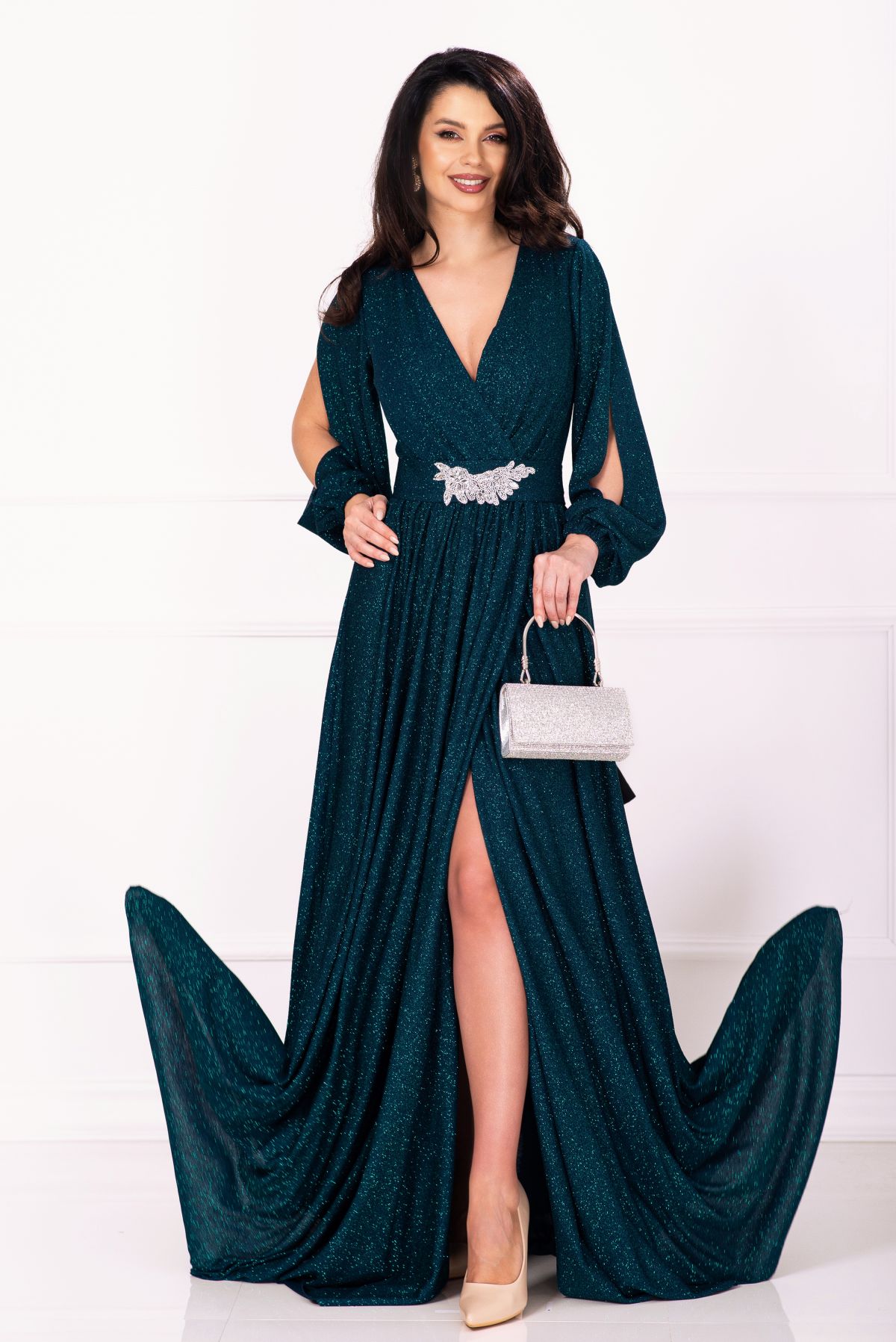 Rochie eleganta Chantal din lurex verde lunga cu sclipici ; Culoare: verde ; Textura: lurex ; Decolteu in V petrecut ; Sclipici pe toata suprafata ; Maneci lungi cu decupaj ; Mansete elastice ; Prezinta dublura ; Inchidere cu fermoar la spate ; Crapatura ampla pe picior ; Elastic in talie ; Centura detasabila decorata cu strassuri ; Compozitie: 95% poliester 5% elastan ; Fabricat in Romania ; * Echipa noastra face toate eforturile in a prezenta cat mai bine culorile produselor prezentate pe site insa culorile pot diferi de situatia reala si pot varia în functie de setarile monitorului/dispozitivului dvs!