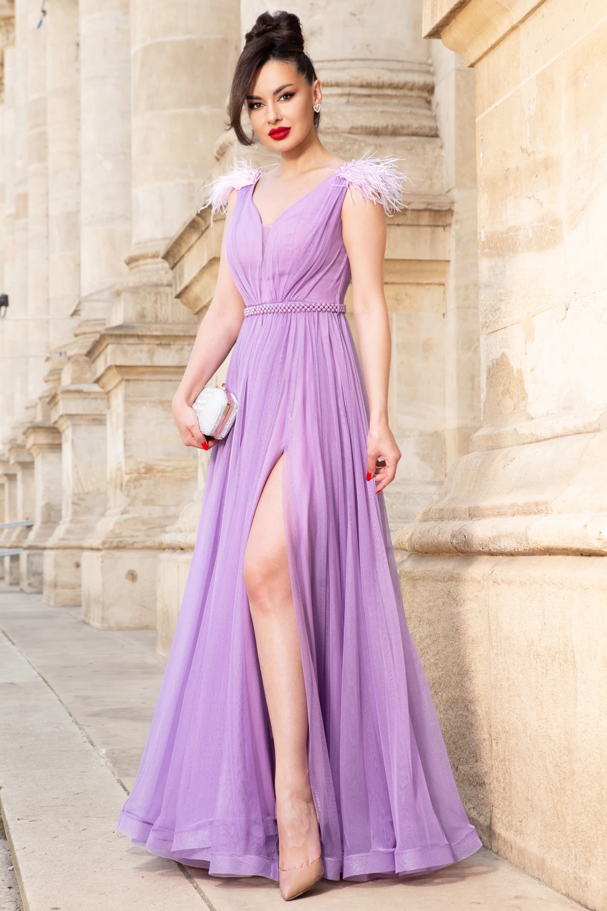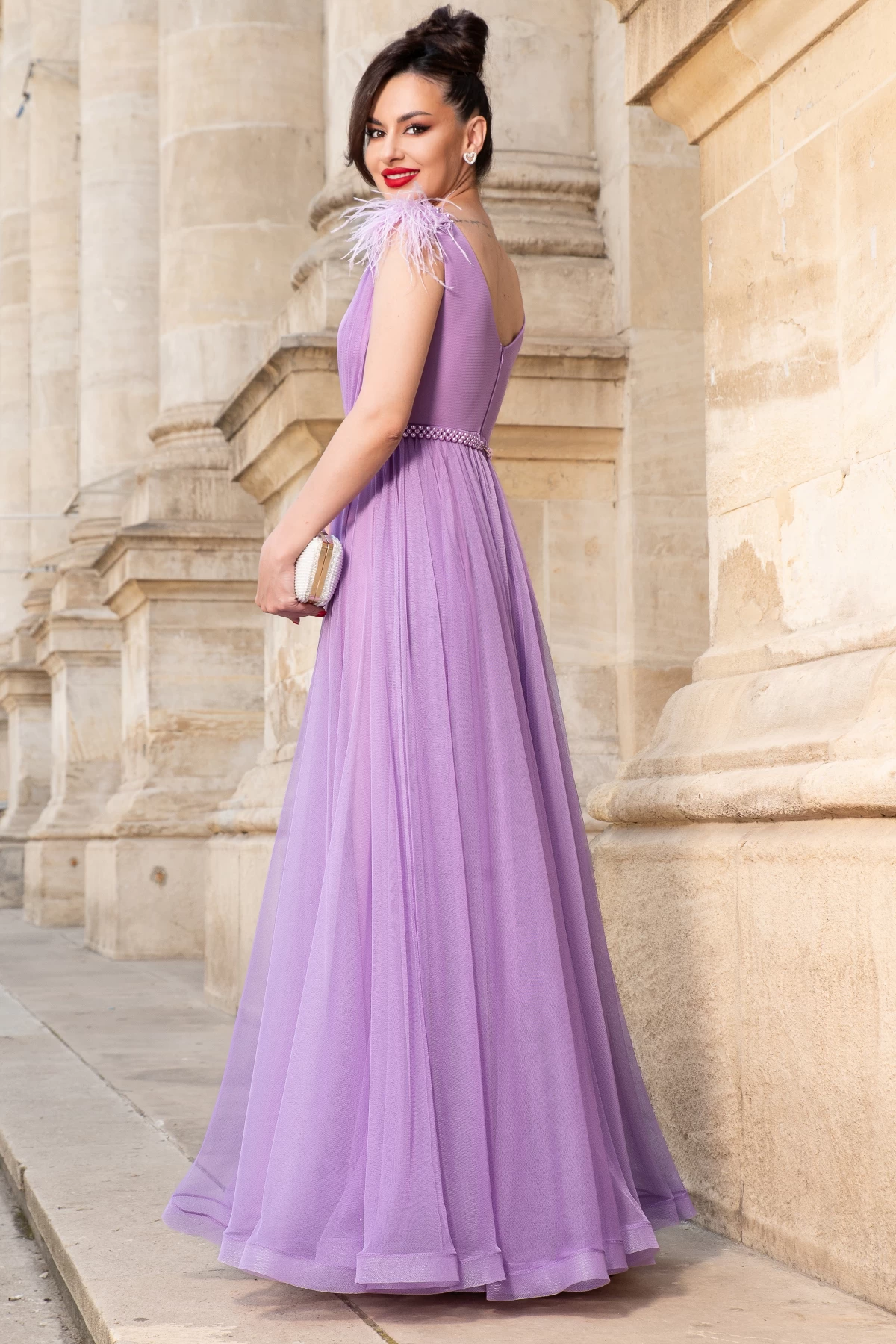 Rochie eleganta de seara lunga lila Gratiela cu perle in talie si fulgi pe umeri ; Culoare: lila ; Croi: printesa ; Fara maneci ; Pliuri in zona bustului si la umeri ; Decolteu in V petrecut ; Cupe buretate ; Material vaporos ; Inchidere cu fermoar la spate ; Prezinta dublura ; Rejansa in partea de jos ; Crapatura ampla pe picior ; Cordon detasabil din perle in talie ; Accesorizata cu fulgi si perle sidefate pe umeri ; Compozitie: 100% poliester ; * Echipa noastra face toate eforturile in a prezenta cat mai bine culorile produselor prezentate pe site insa culorile pot diferi de situatia reala si pot varia în functie de setarile monitorului/dispozitivului dvs!