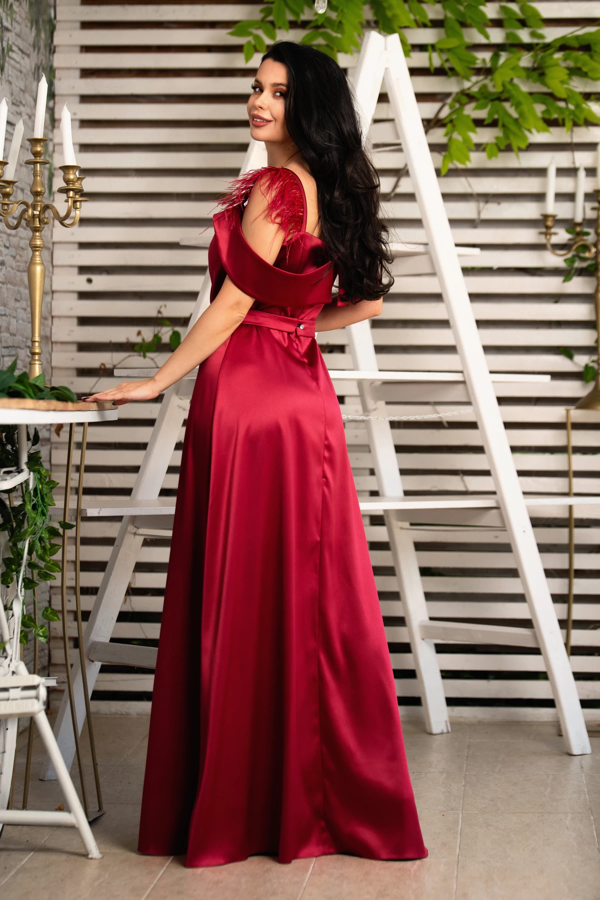 Rochie eleganta de soacra Miley lunga din tafta bordo ; Culoare: bordo ; Croi: clos ; Textura: tafta ; Prezinta dublura ; Crapatura ampla pe picior ; Umeri cazuti ; Bretele subtiri decorate cu fulgi ; Decolteu tip inima ; Cupe buretate ; Inchidere cu fermoar la spate ; Cordon detasabil accesorizat cu floare din strassuri si margele ; Compozitie: 97% poliester 3% elastan ; Fabricat in Romania ; * Echipa noastra face toate eforturile in a prezenta cat mai bine culorile produselor prezentate pe site insa culorile pot diferi de situatia reala si pot varia în functie de setarile monitorului/dispozitivului dvs!