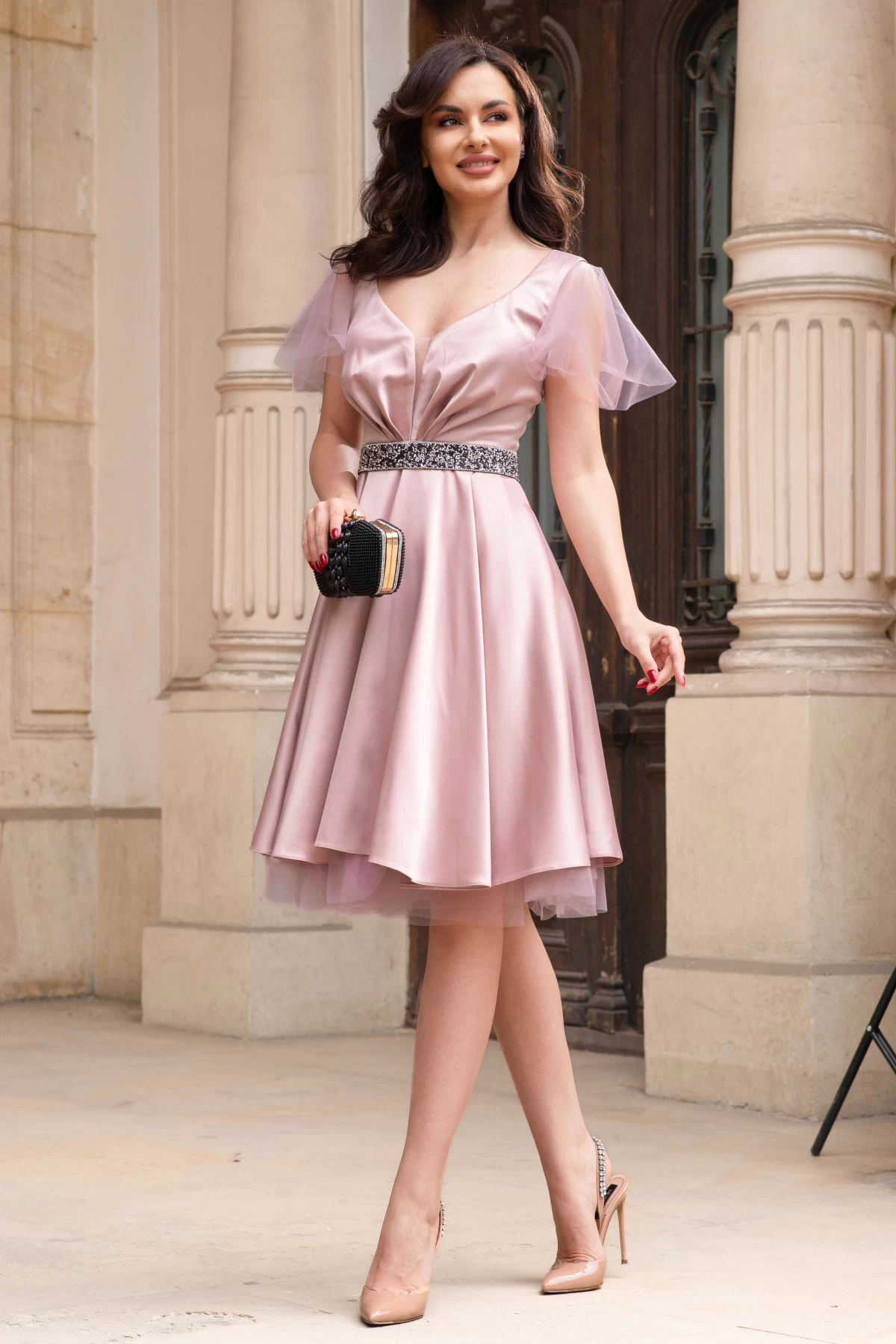 Rochie eleganta de zi roz Argentina in clos cu volane din tulle ; Culoare: roz ; Croi: clos baby-doll ; Textura: tafta ; Volan din tulle la maneci ; Prezinta dublura ; Fronseuri in zona bustului ; Decolteu in V ; Cupe buretate ; Buzunare laterale functionale ; Volan din tulle la terminatie ; Centura detasabila in talie cu pietre decorative ; Inchidere cu fermoar la spate ; Compozitie: 100% poliester ; Fabricat in Romania ; * Echipa noastra face toate eforturile in a prezenta cat mai bine culorile produselor prezentate pe site insa culorile pot diferi de situatia reala si pot varia în functie de setarile monitorului/dispozitivului dvs!