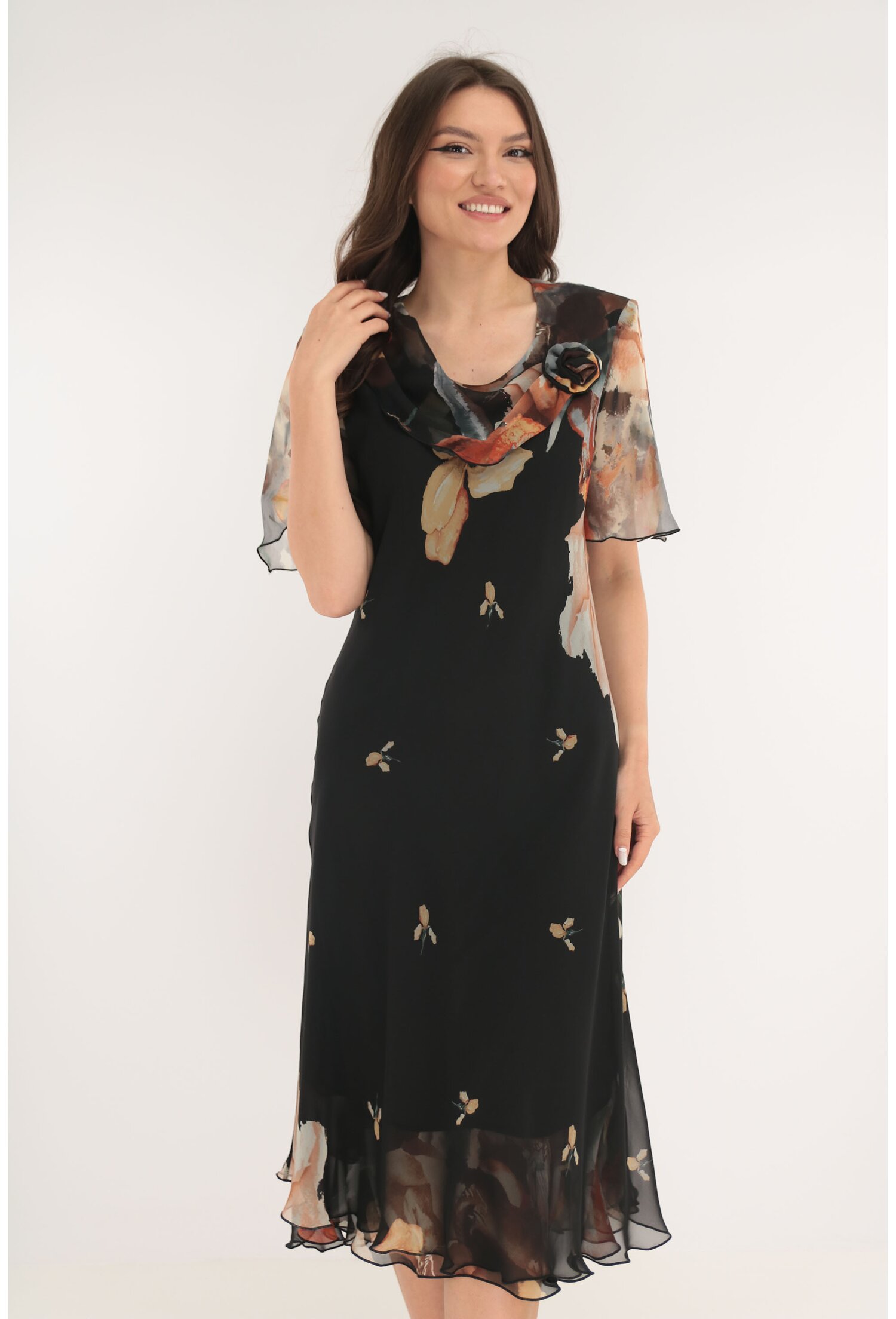-Rochie eleganta din voal negru cu print floral orange -Croiala lejera -Captusita, cu volan dublu la tiv -Decolteu rotund cu esarfa si floare din material textil -Maneci scurte din voal MATERIAL: 100% Poliester LUNGIME: 122 cm la marimea 44, lungimea produsului creste cu 1 cm la fiecare marime