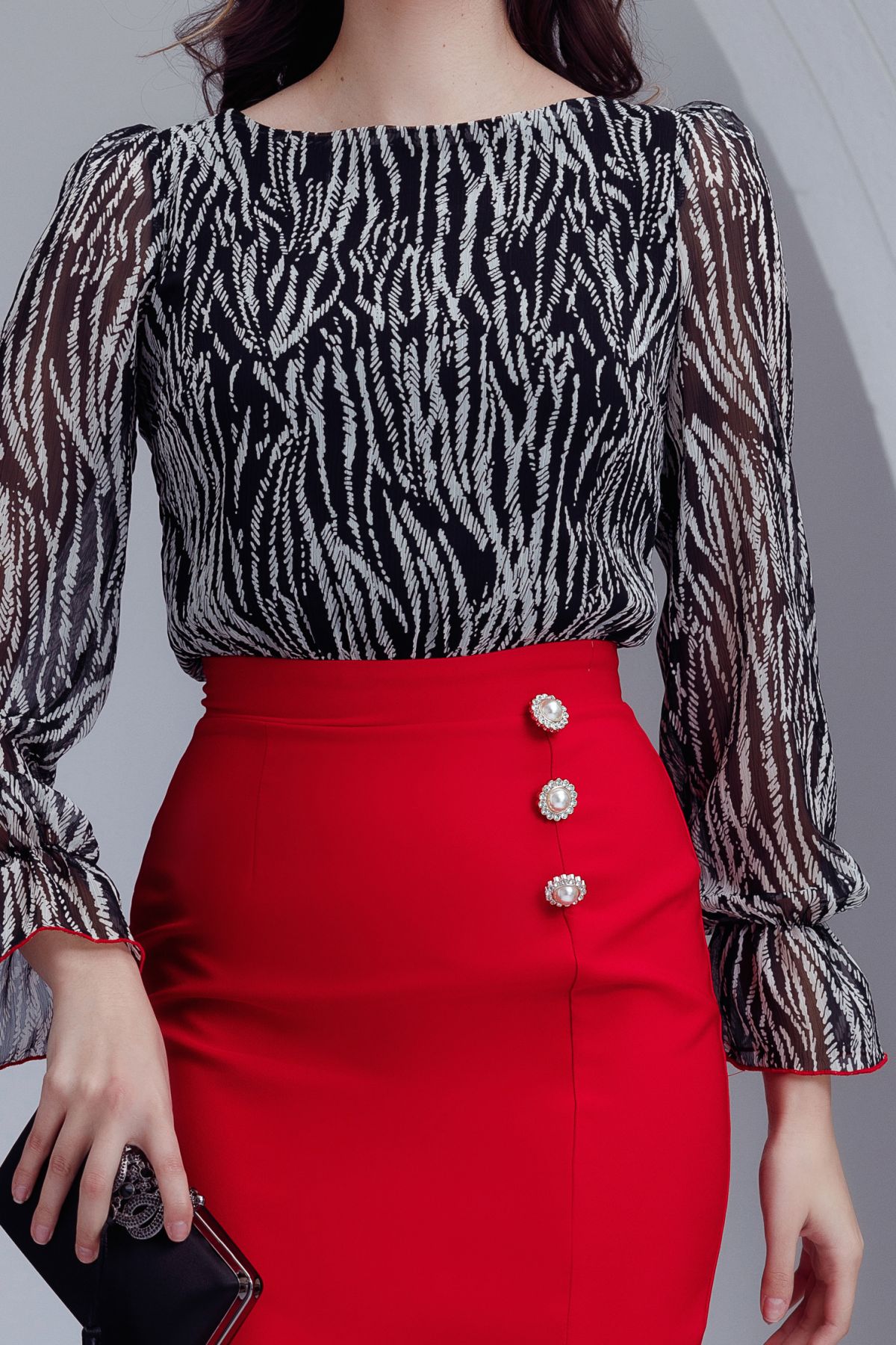 Rochie eleganta Fofy cu fusta rosie si bust din voal imprimat ; Culoare: rosu negru alb ; Croi: conic ; Bust si maneci din voal ; Decolteu barcuta ; Elastic si volanas la terminatia manecii conturat cu cusatura rosie ; Imprimeu tip dungi ; Fusta rosie din stofa sutire ; Crapatura frontala ; Trei nasturi decorativi cu perla si strassuri ; Inchidere cu fermoar si nasture la spate ; Compozitie: 95% poliester 5% elastan ; Fabricat in Romania ; * Echipa InPuff face toate eforturile in a prezenta cat mai bine culorile produselor prezentate pe site insa culorile pot diferi de situatia reala si pot varia în functie de setarile monitorului/dispozitivului dvs!