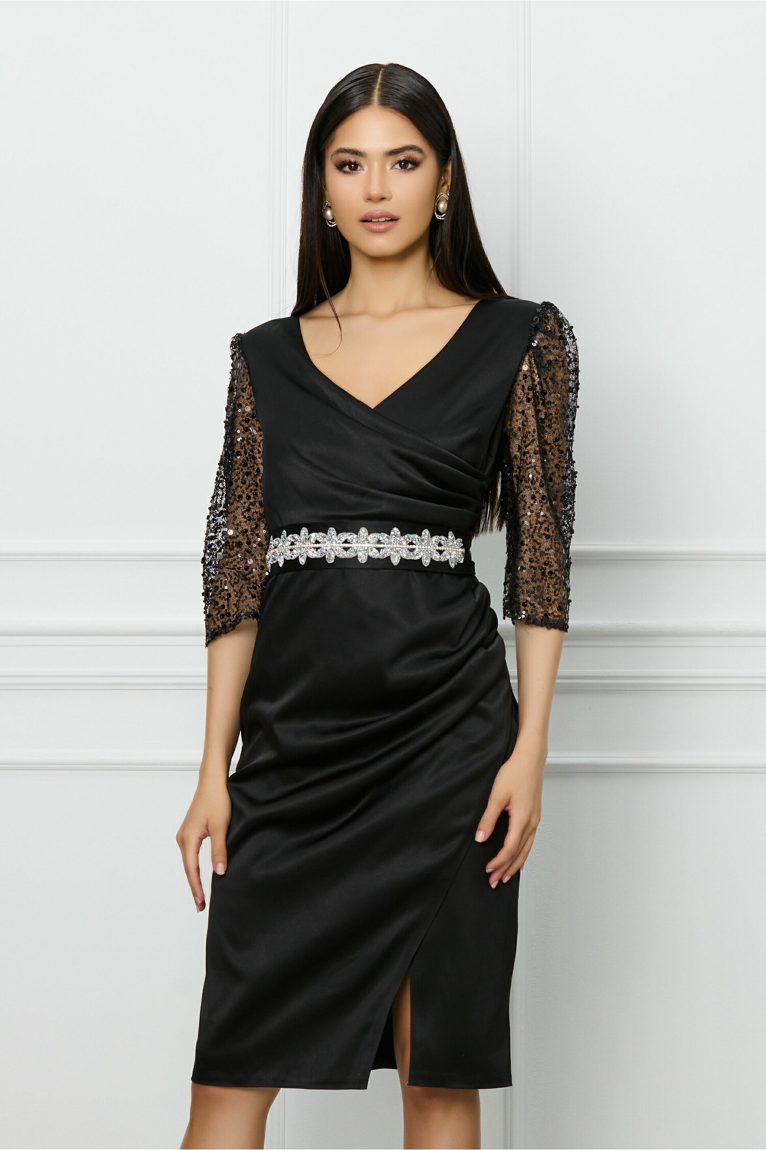 Rochie eleganta cu fronseu si maneci din dantela. Are decolteu in V petrecut, croi conic si fusta petrecuta. Rochie eleganta Decolteu in V Maneci lungi Croi conic Fusta petrecuta Captusita pe interior Inchidere cu fermoar la spate Material: Satin Compozitie: 60% Poliester, 40% Elastan *Va rugam verificati eticheta produsului inainte de curatare! *Va rugam sa retineti ca o usoara discrepanta de culoare ar trebui sa fie acceptabila datorita luminii si luminozitatii ecranului. *Va rugam verificati ghidul de marimi, in cm, pentru a alege corect marimea.