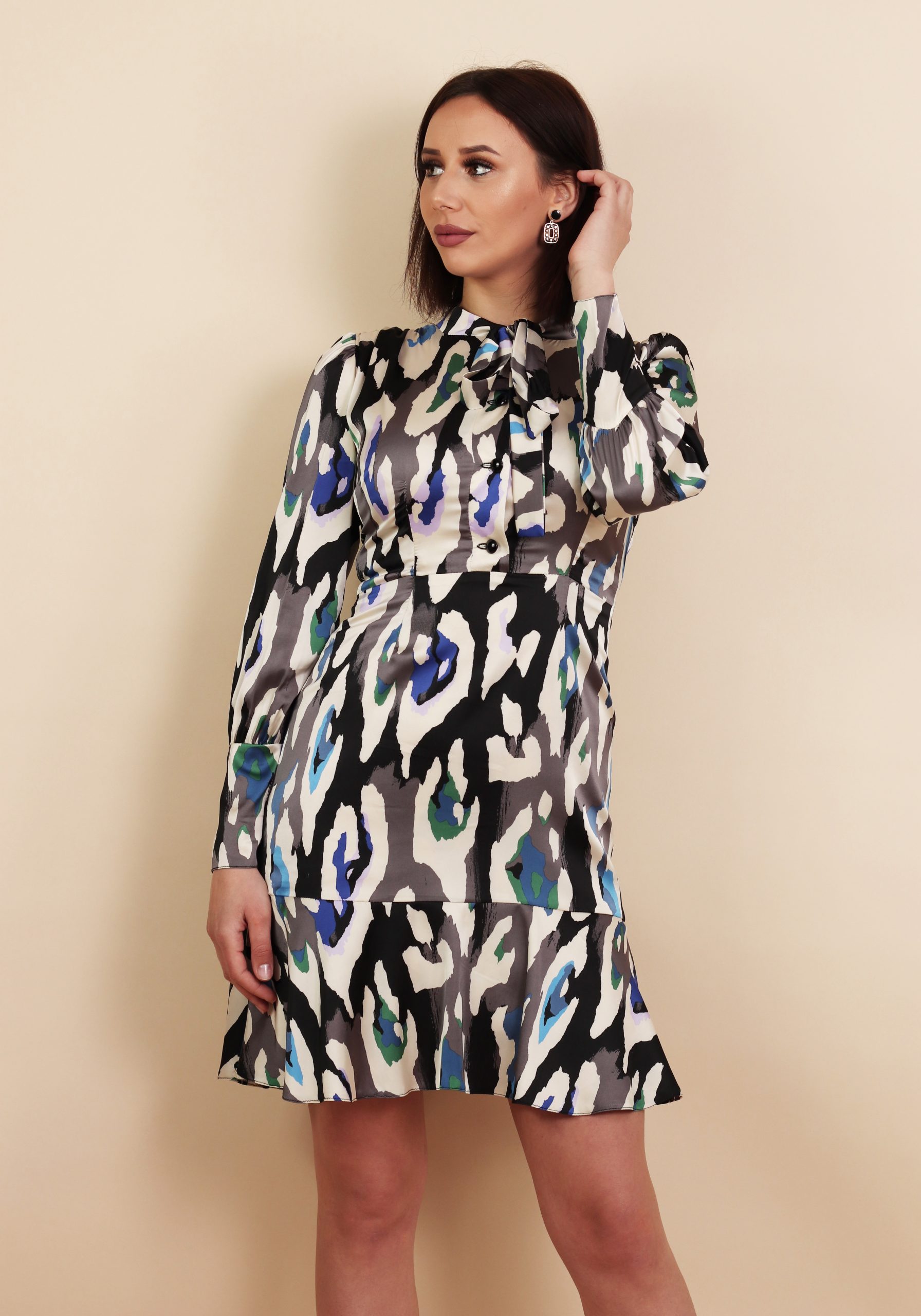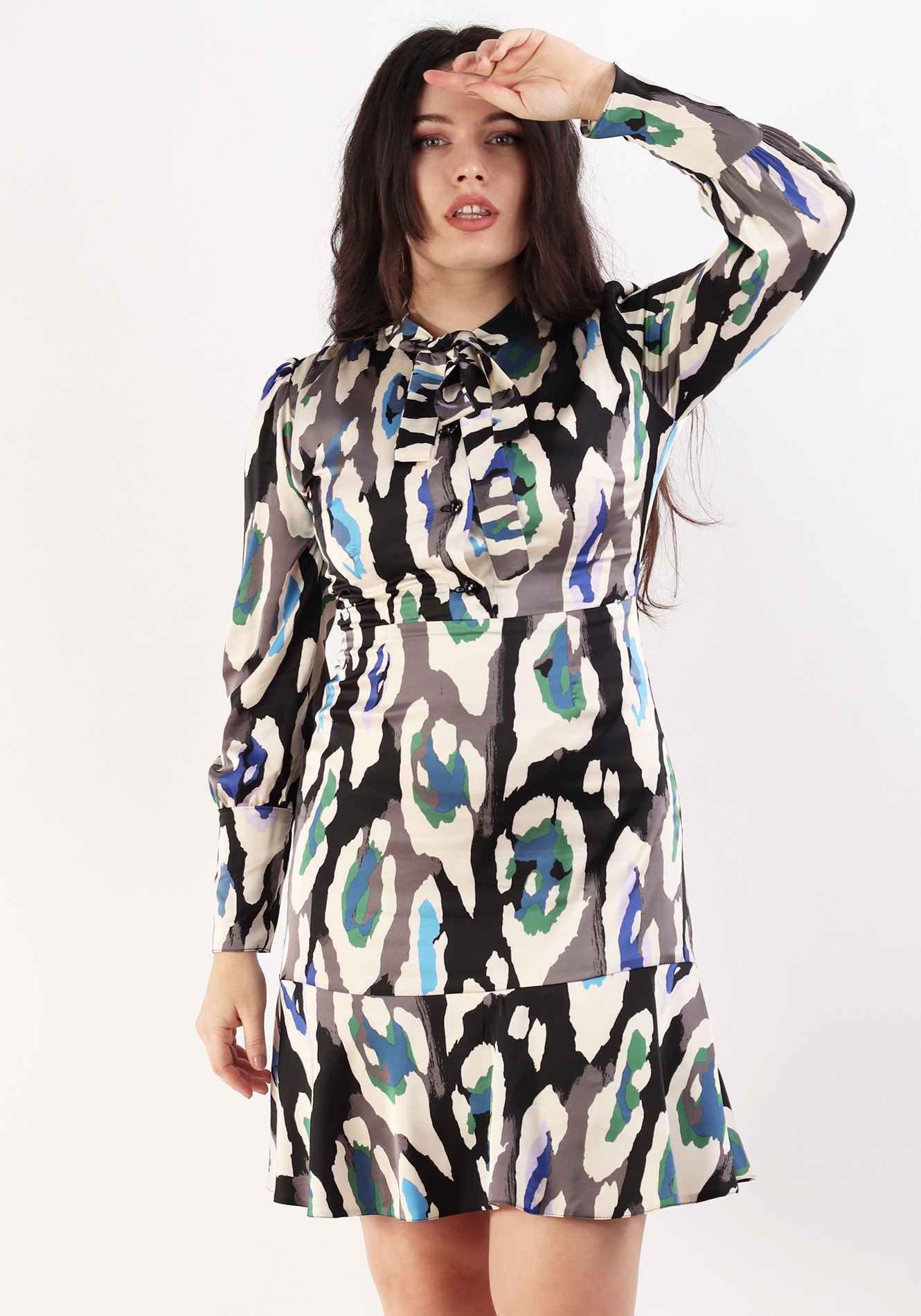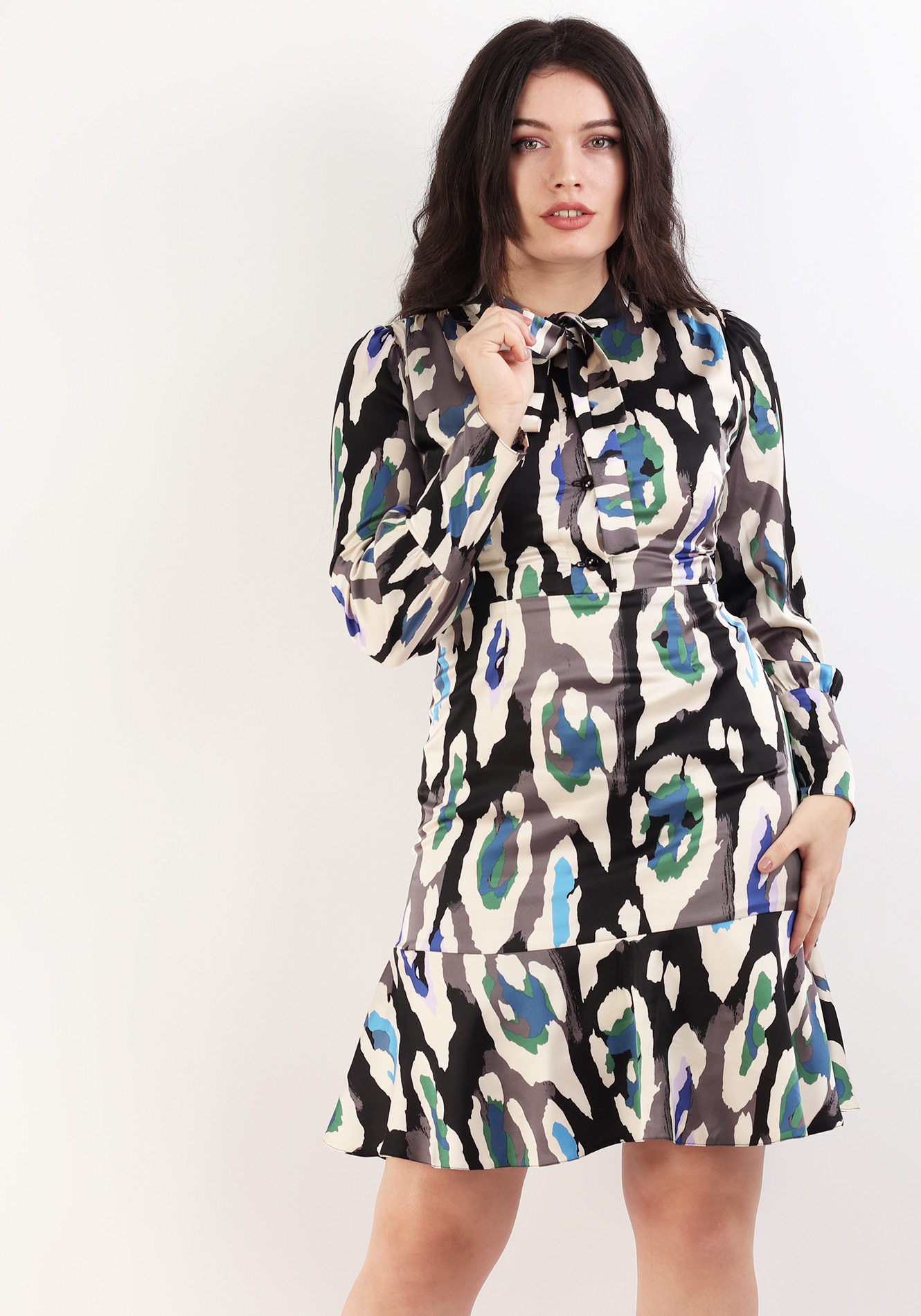 Rochie evazata cu esarfa,maneca lunga cu cret in zona umerilor si manseta lata,bustul cambrat cu cret in zona umerilor,taiata in talie,fusta evazata cu volan la baza,captusita,inchidere la spate cu fermoar ascuns