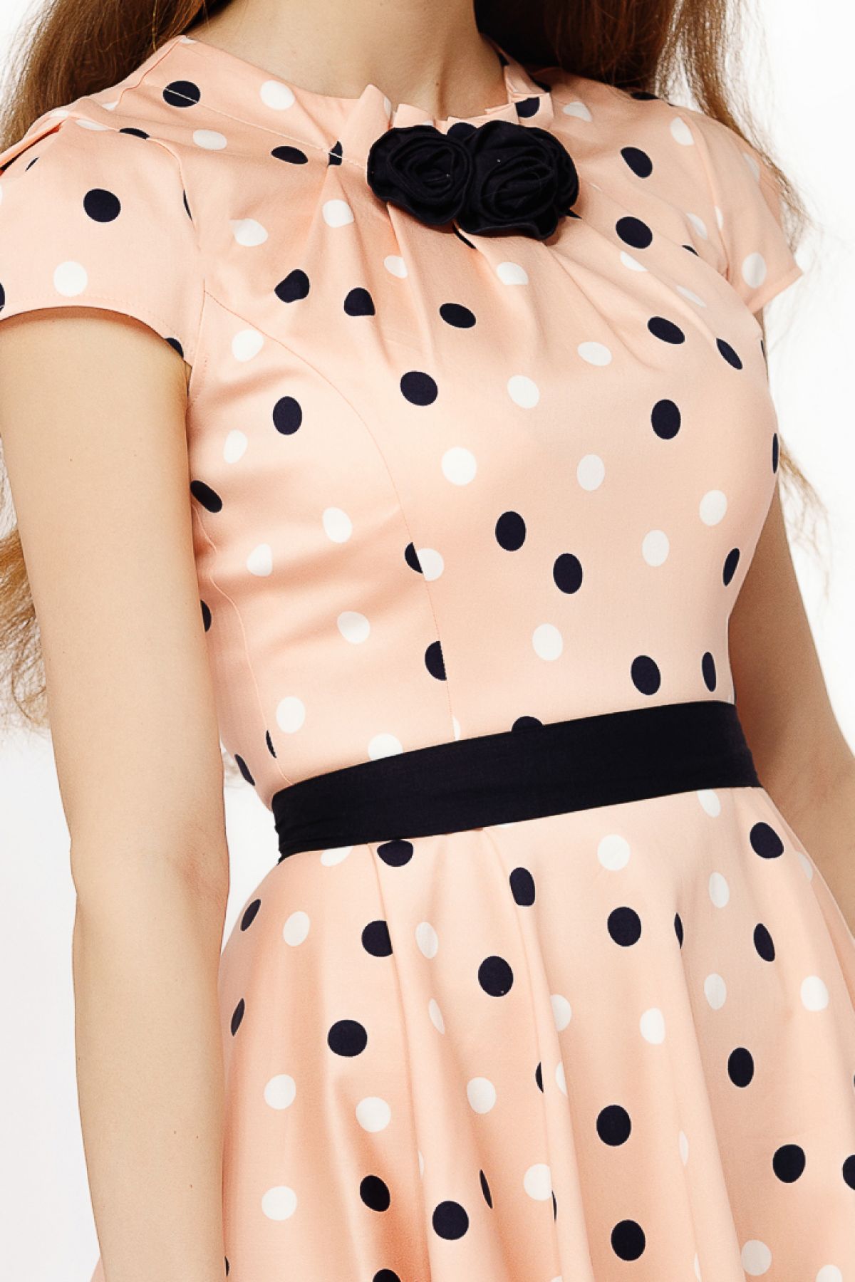 Rochie Fofy de vara peach in clos cu trandafiri decorativi si buline ; Culoare: peach ecru negru ; Maneca scurta ; Croi clos ; Buzunare laterale functionale ; Nu are dublura ; Textura: bistrech ; Imprimeu buline ; Trandafiri detasabili la baza gatului ; Inchidere cu fermoar si nasture la spate ; Cordon detasabil in talie ; Compozitie:100% poliester ; Fabricat in Romania ; Rasfata-te InPuff cu cele mai elegante rochii! * Modelul nostru poarta marimea 36(S)! * Echipa InPuff face toate eforturile in a prezenta cat mai bine culorile produselor prezentate pe site insa culorile pot diferi de situatia reala si pot varia în functie de setarile monitorului/dispozitivului dvs!