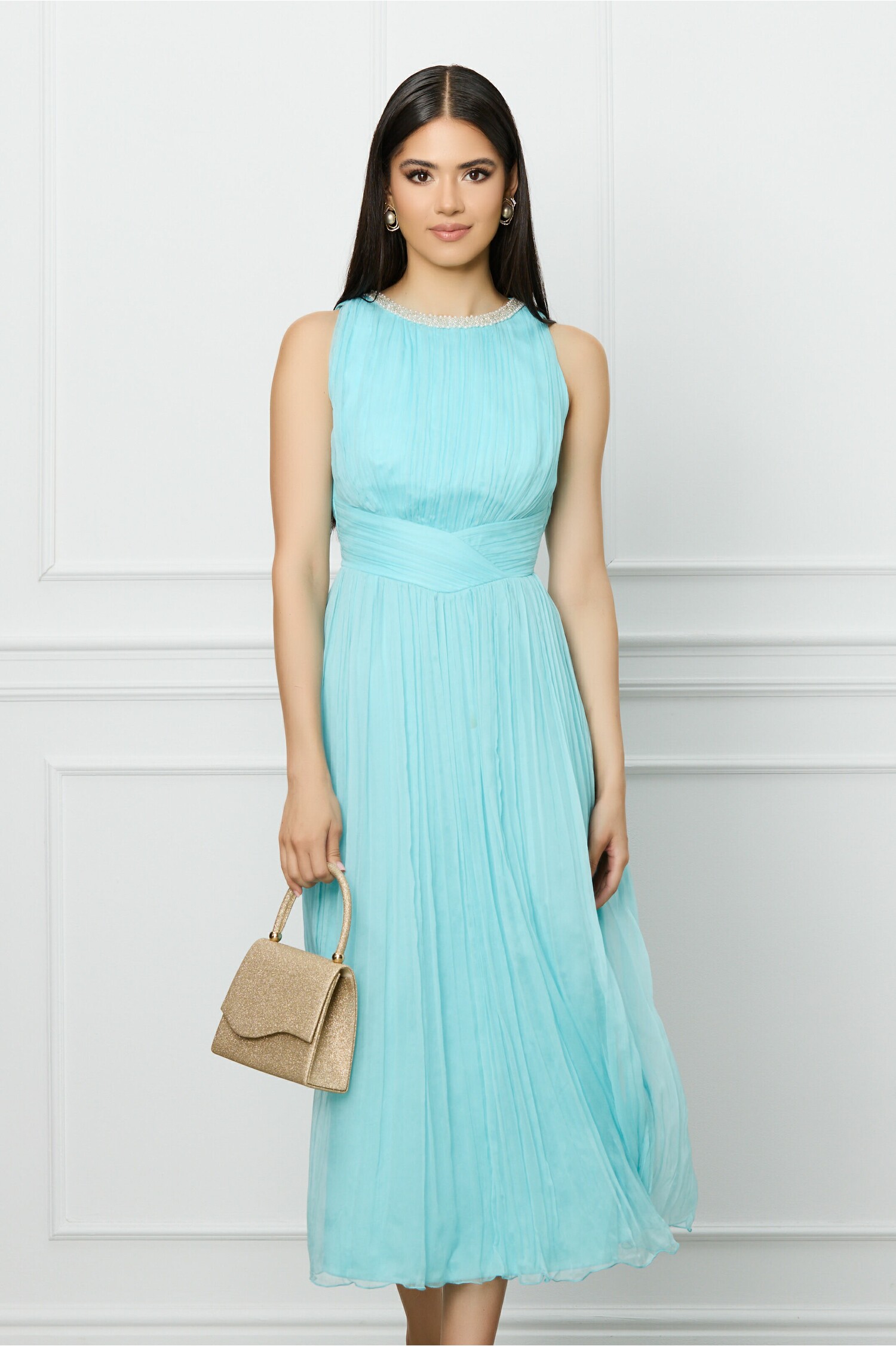Rochie eleganta din matase naturala accesorizata cu perle la decolteu. Nu are maneci, are decolteu rotund, iar croiul este clos. Rochie eleganta Decolteu rotund Fara maneci Croi clos Captusita pe interior Inchidere cu fermoar la spate Material: Matase Compozitie: 100% Matase *Va rugam verificati eticheta produsului inainte de curatare! *Va rugam sa retineti ca o usoara discrepanta de culoare ar trebui sa fie acceptabila datorita luminii si luminozitatii ecranului. *Va rugam verificati ghidul de marimi, in cm, pentru a alege corect marimea.