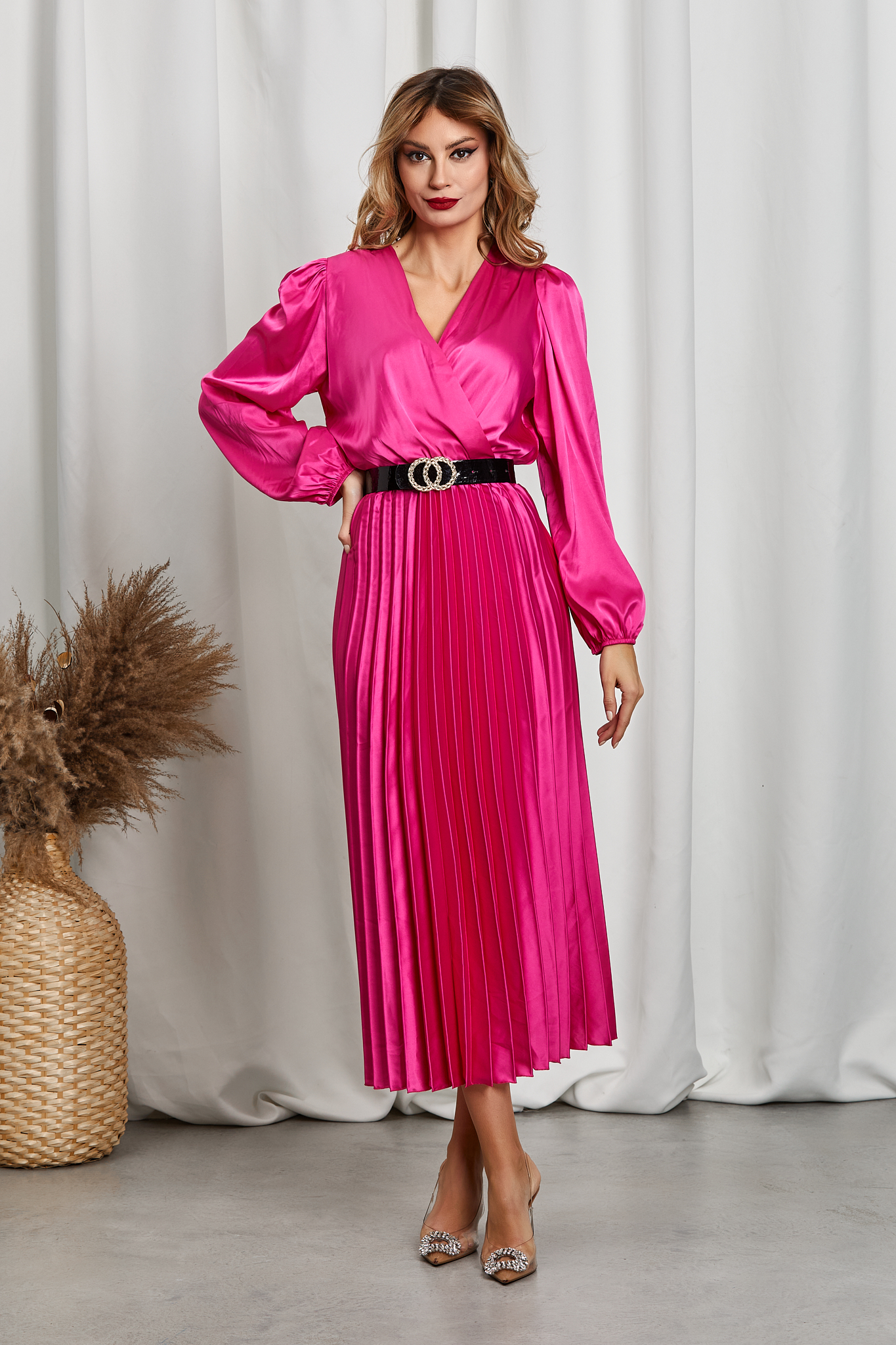 Rochie eleganta ciclam midi din satin cu pliuri in partea inferioara are un design simplu, dar in acelasi timp chic. Croiul lejer si materialul vaporos te vor face sa te simti confortabil la orice eveniment urmeaza sa participi. material neelastic fara fermoar decolteu in V petrecut elastic in talie pliuri in partea inferioara fara jupon Dimensiuni disponibile: XL, XXL, 3XL