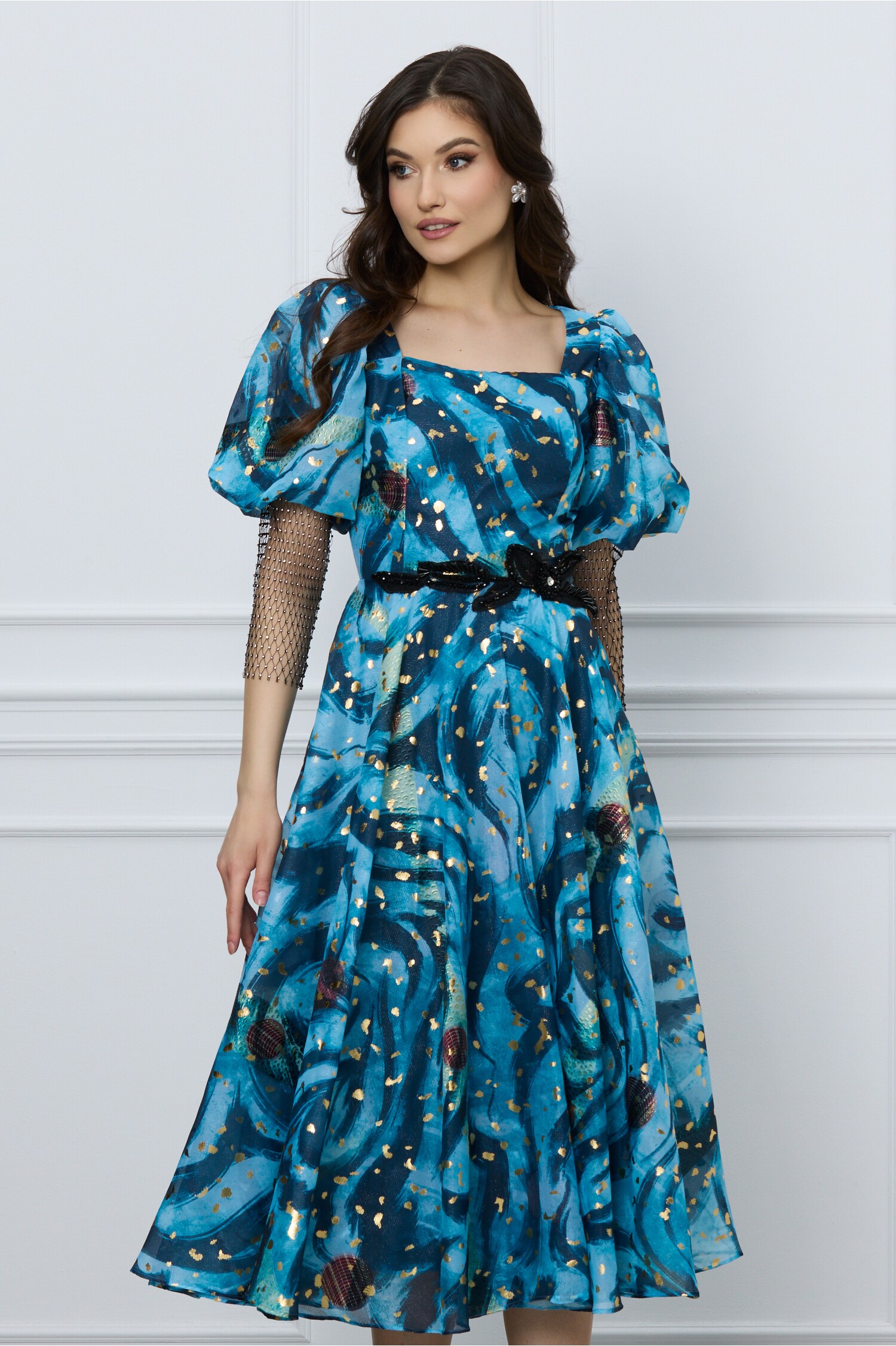 Rochie eleganta din organza cu imprimeuri si strasuri. Are decolteu drept, maneci scurte bufante si croi clos. Rochie eleganta Decolteu drept Maneci scurte Croi clos Are captuseala Se inchide cu fermoar la spate Material: Organza Compozitie: 95% Poliester, 5% Elastan *Va rugam verificati eticheta produsului inainte de curatare! *Modelul are inaltimea de 177 cm. *Pozitia tiparului imprimeului poate fi diferita datorita taierii. *Va rugam sa retineti ca o usoara discrepanta de culoare ar trebui sa fie acceptabila datorita luminii si luminozitatii ecranului. *Va rugam verificati ghidul de marimi, in cm, pentru a alege corect marimea.