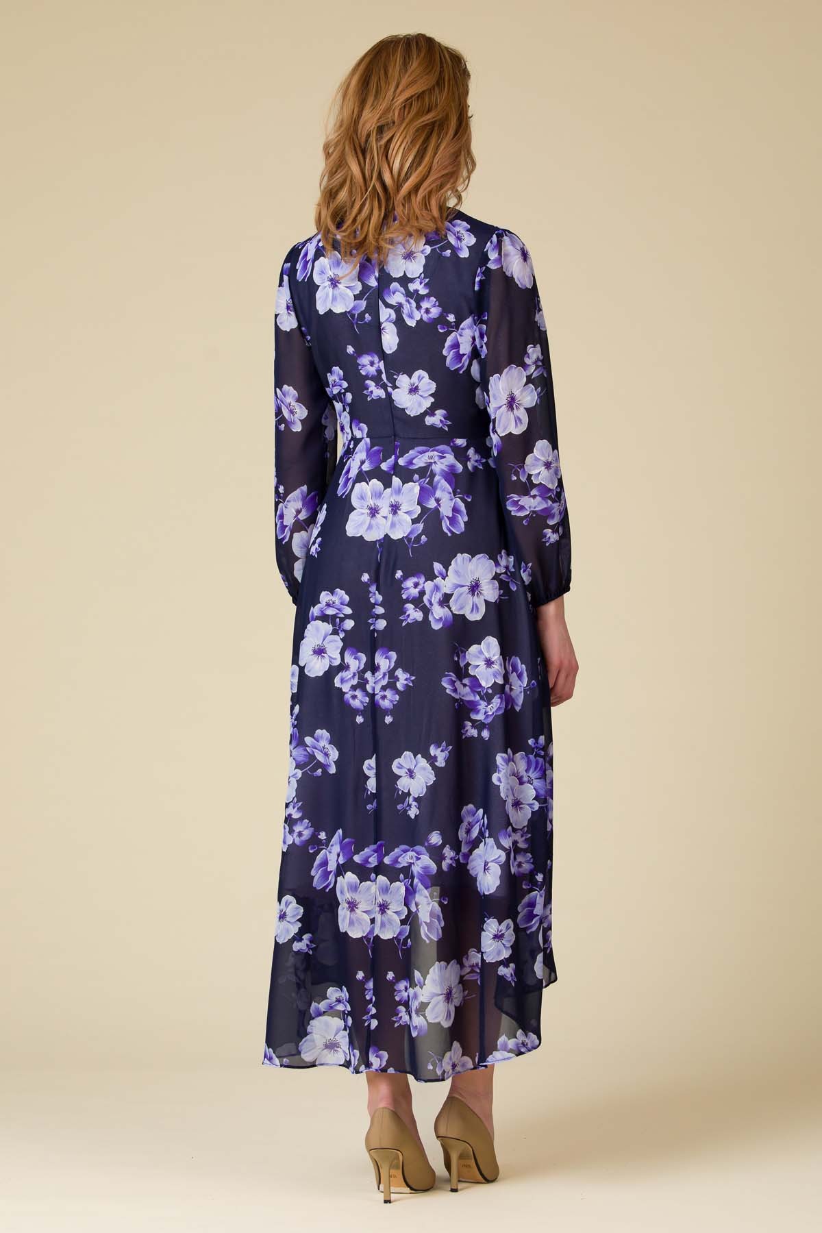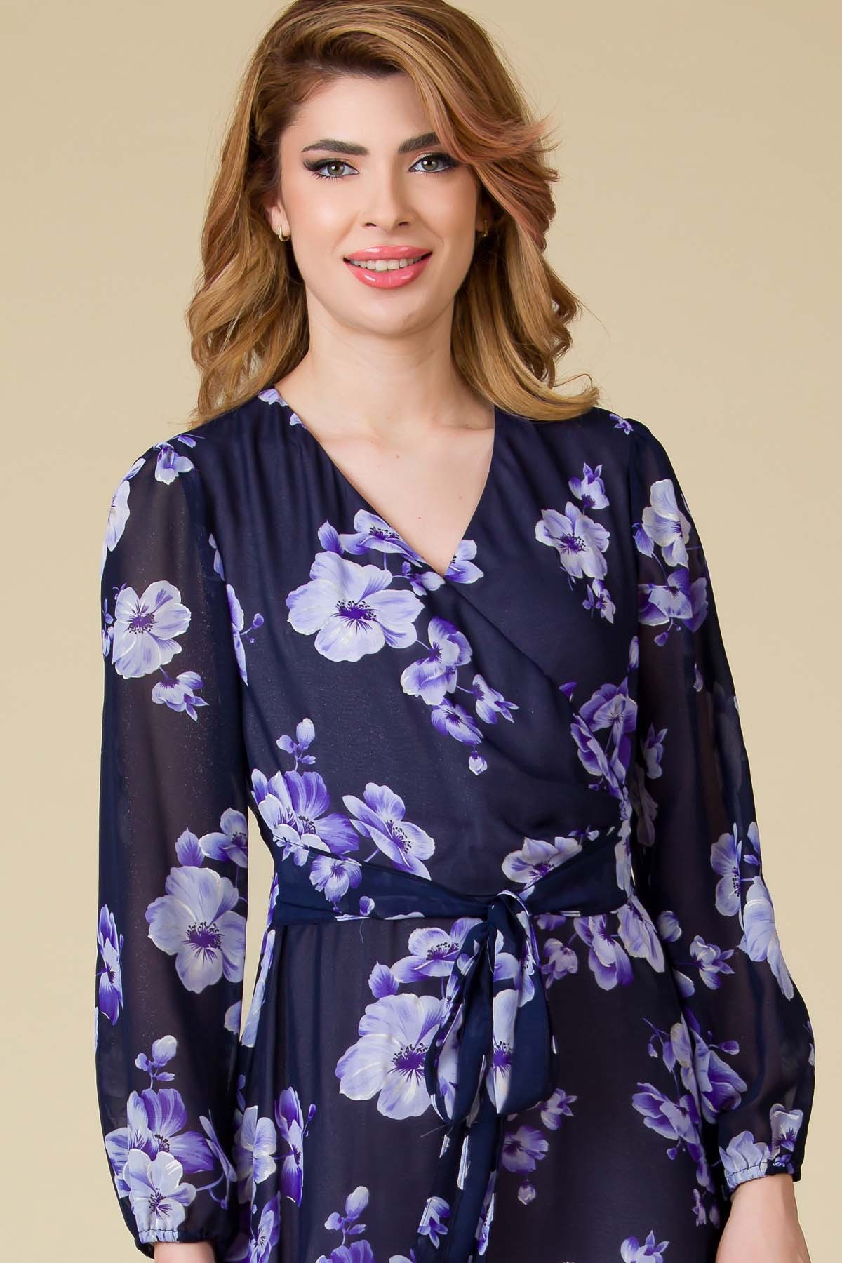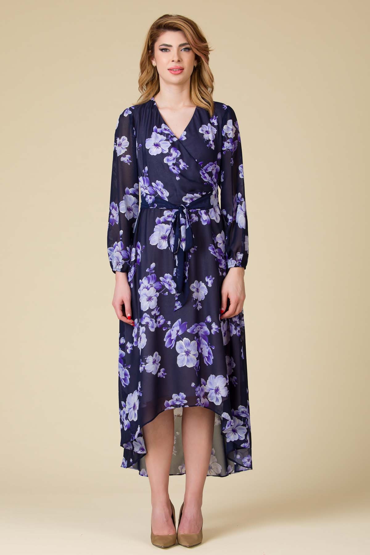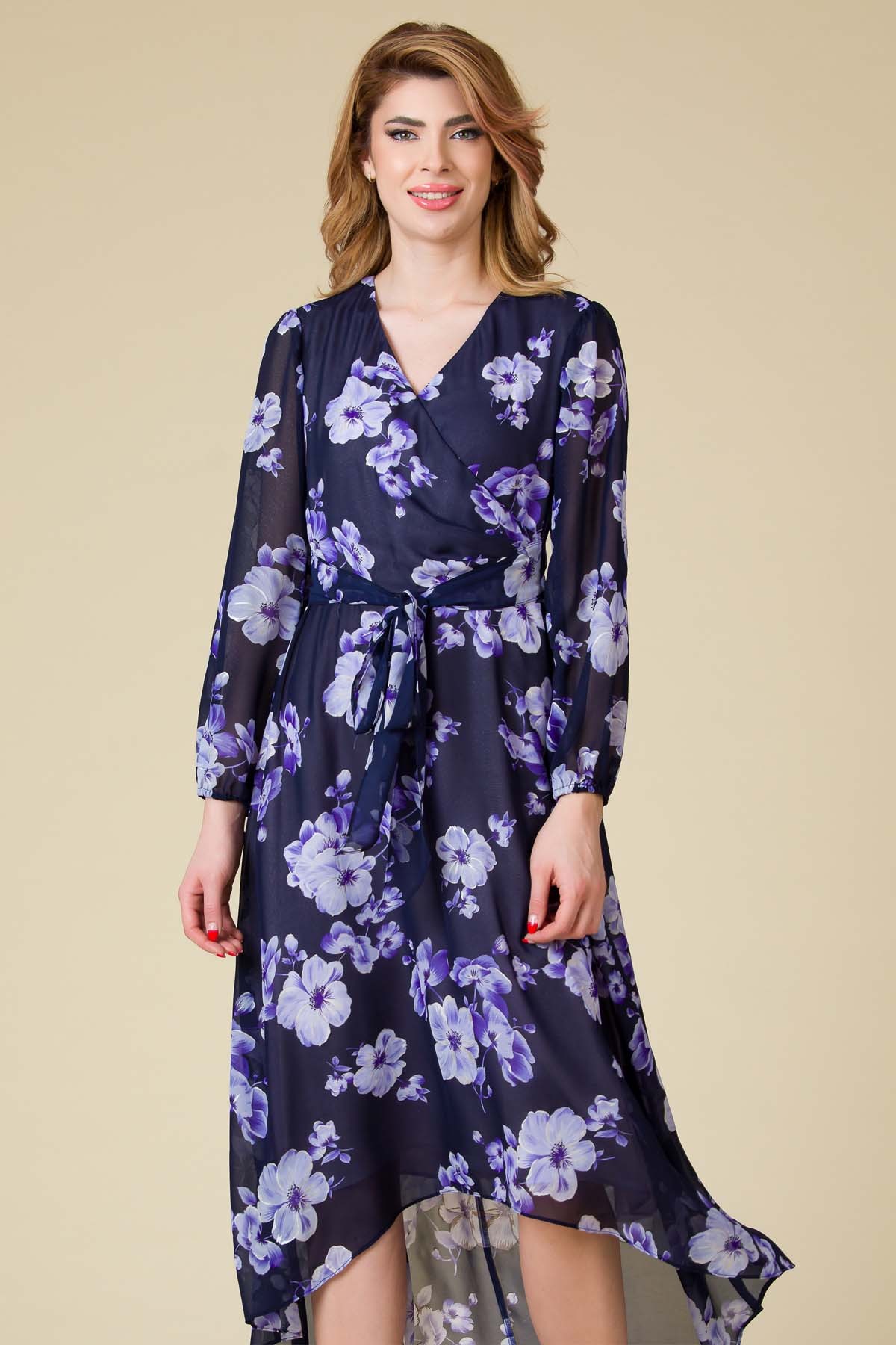 Rochie Larra din voal imprimat, croi asimetric, mai scurta in fata, cordon in talie si decolteu in V.
