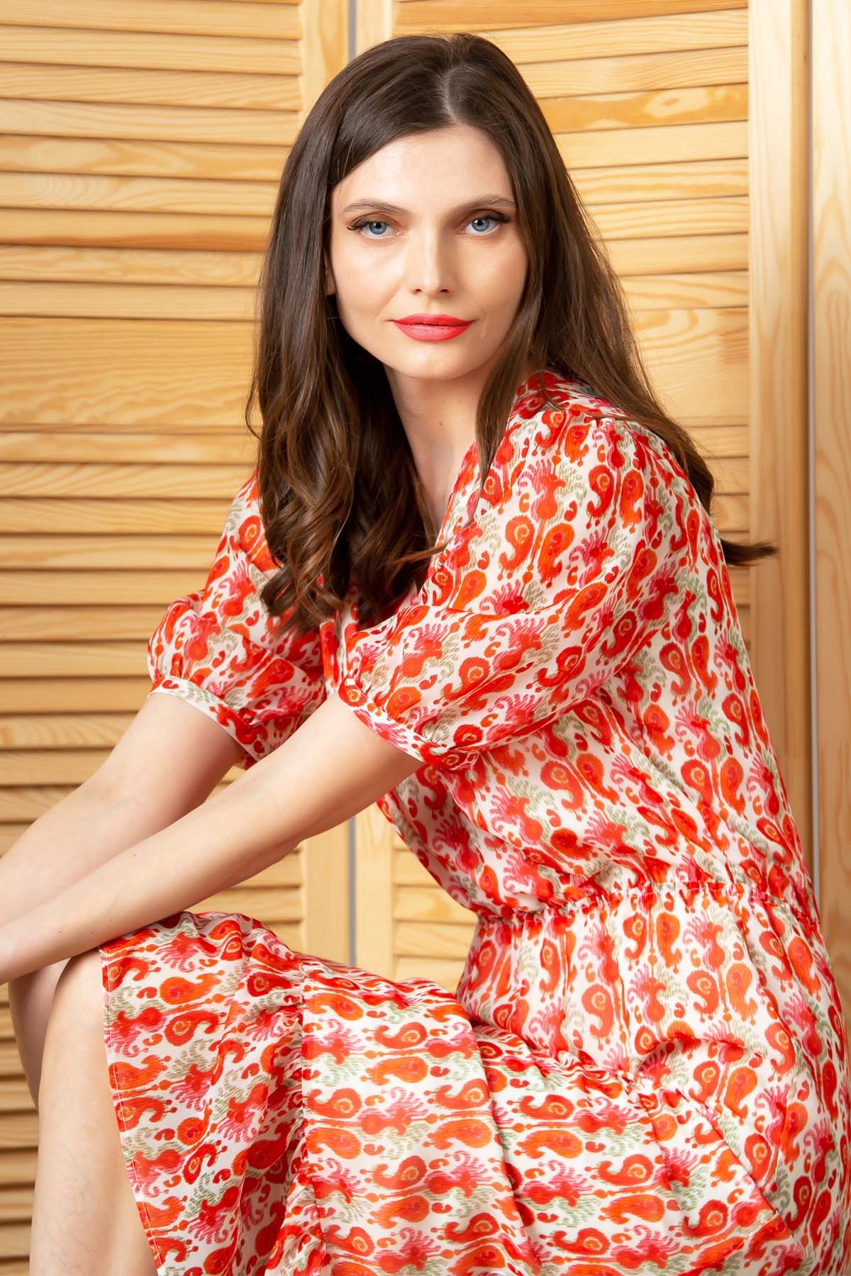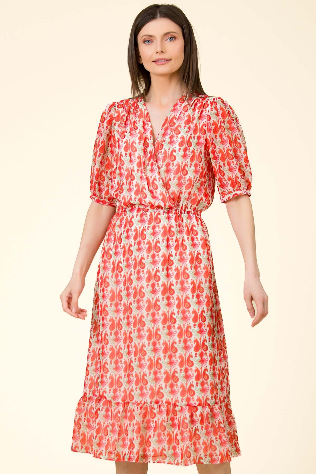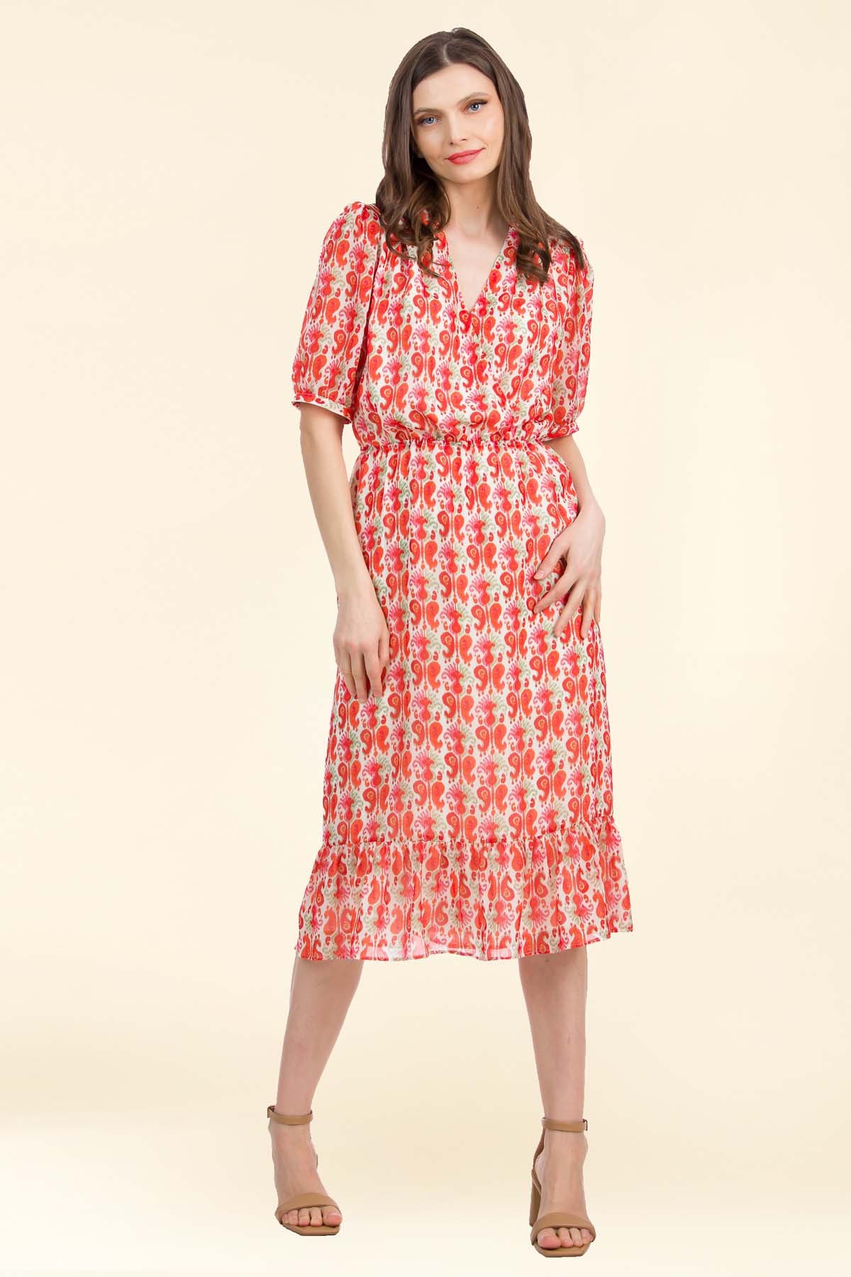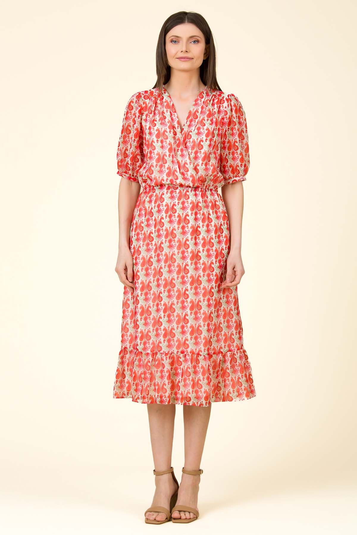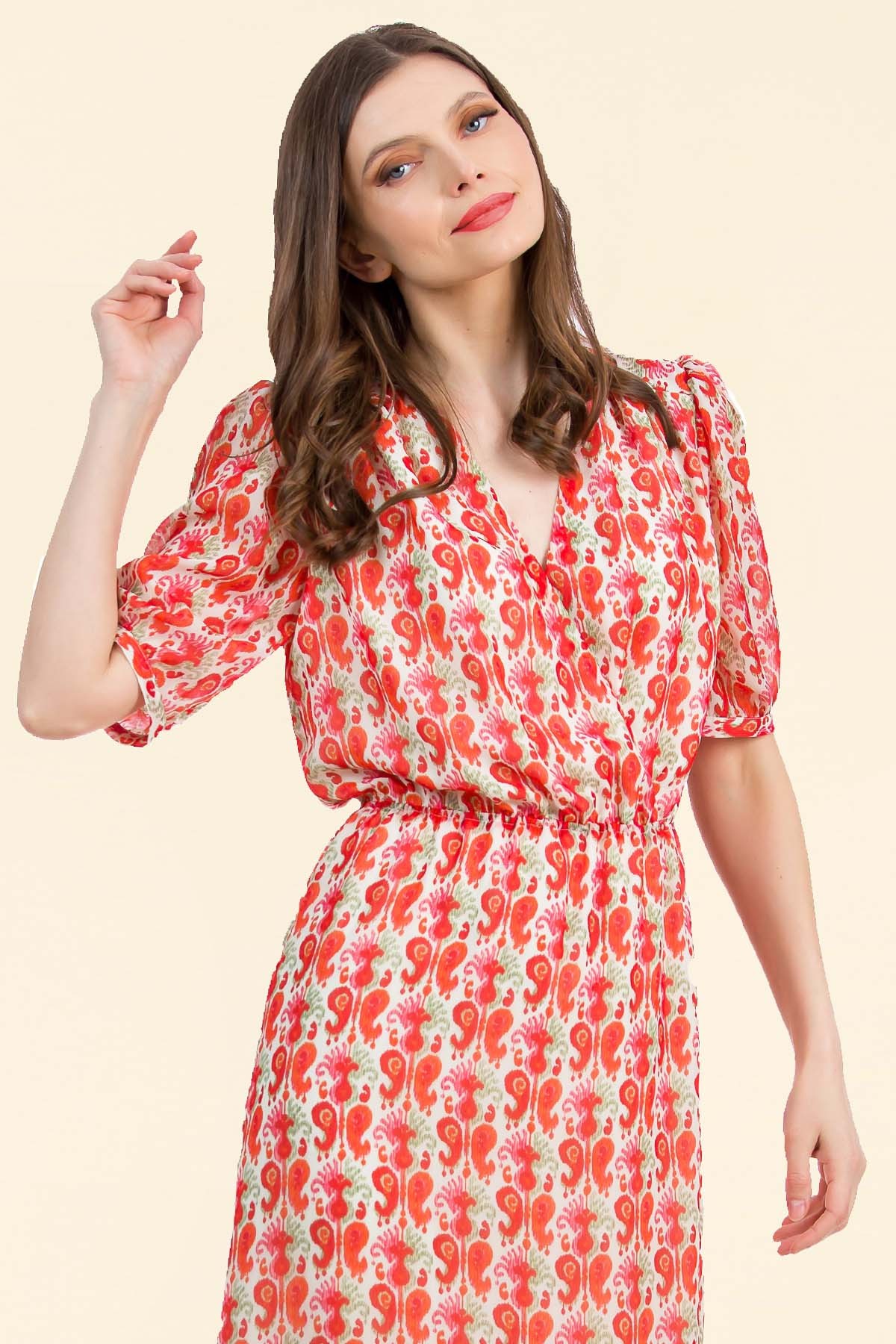 Rochie Marisa din voal imprimat, croi feminin cu incretire in talie, maneci bufante si volan la terminatie.