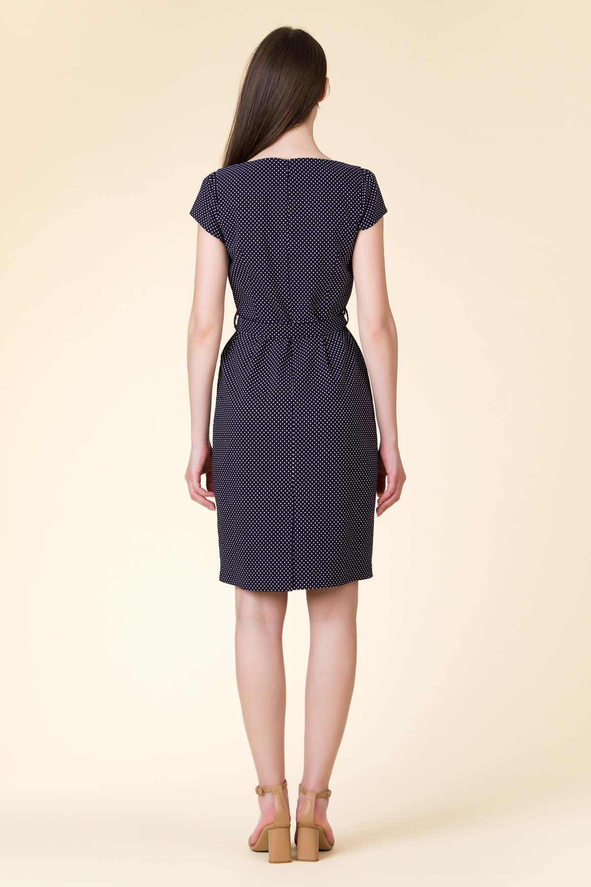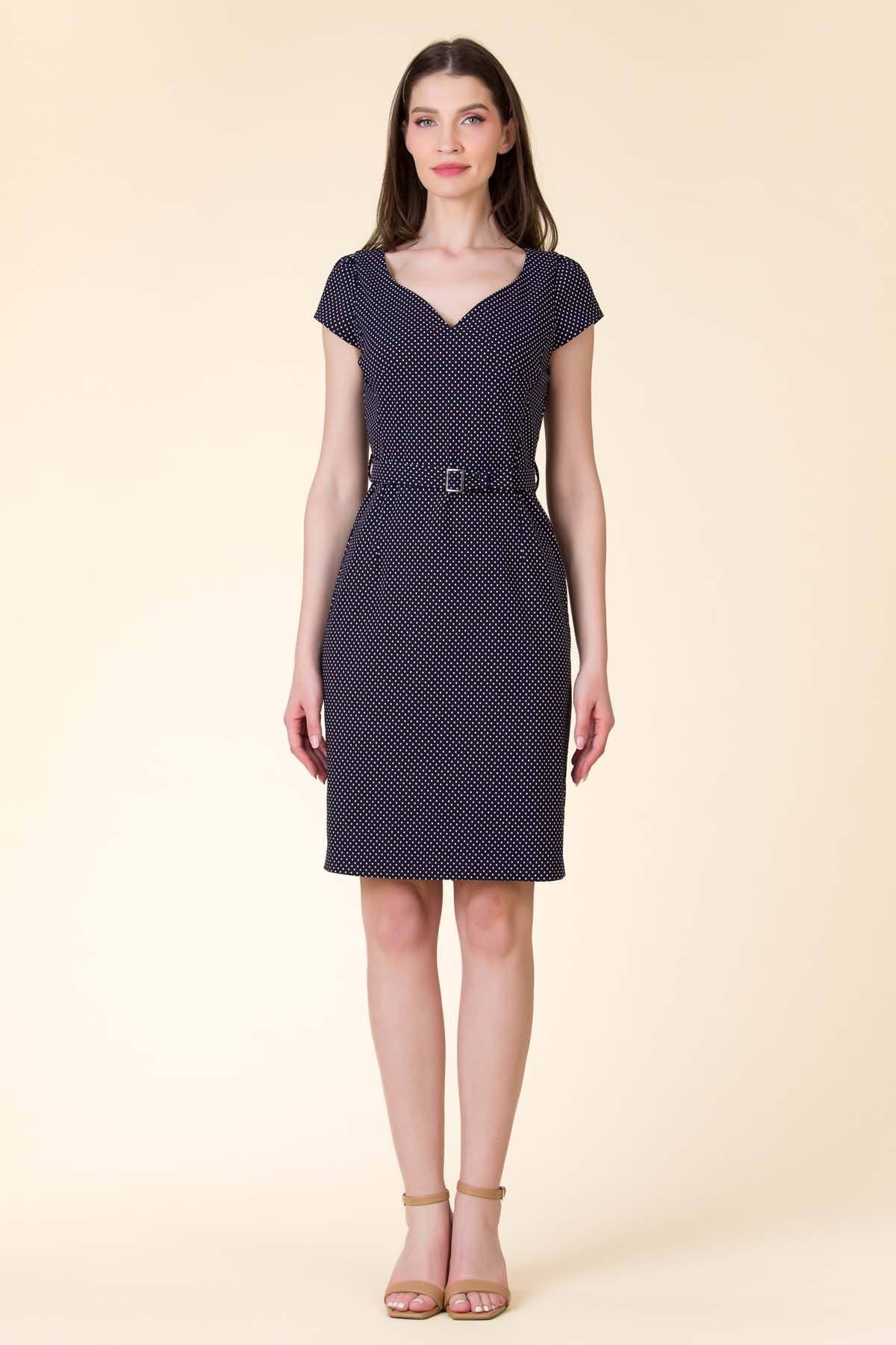Rochie Valerie din material cu viscoza stretch, imprimat cu buline, croi chic cu decolteu inima si centura in talie.